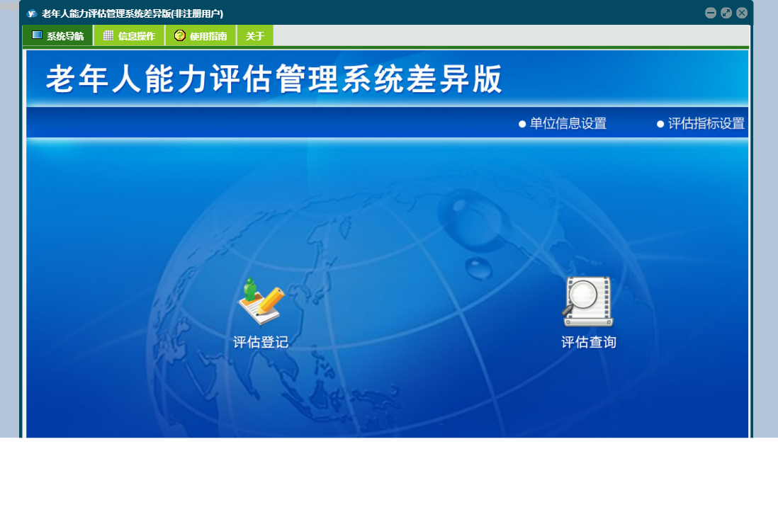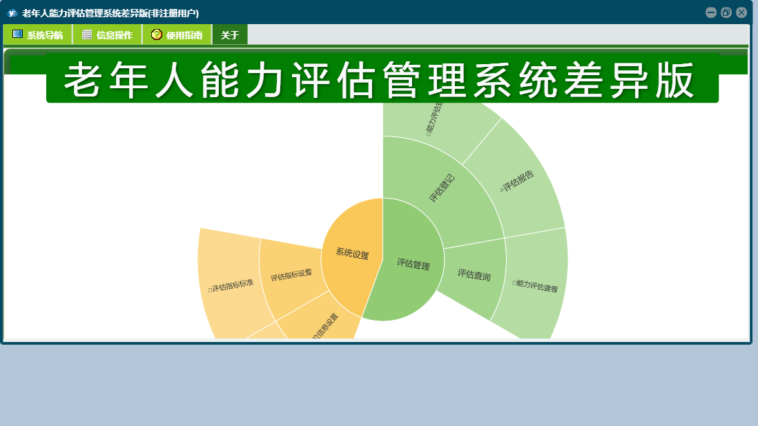 老年人能力评估管理系统差异版包含以下功能:评估登记、关于、面板、评估查询等