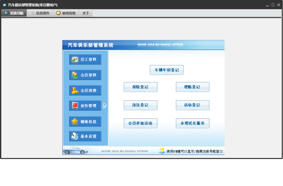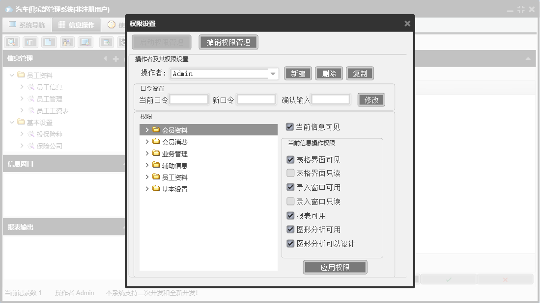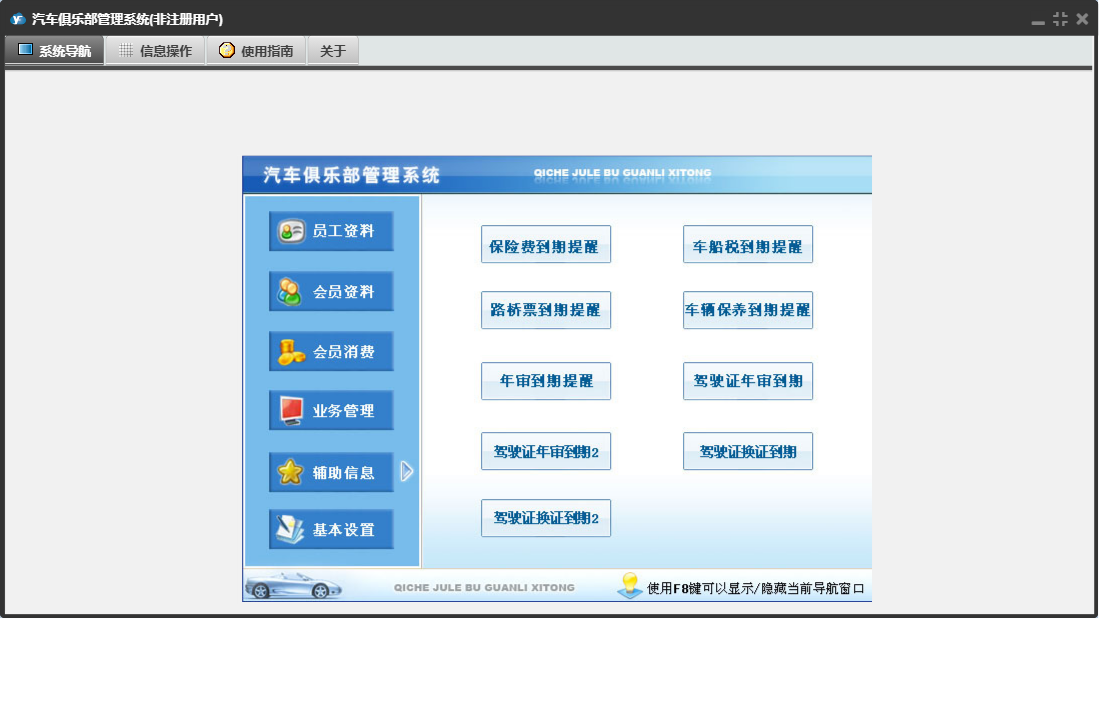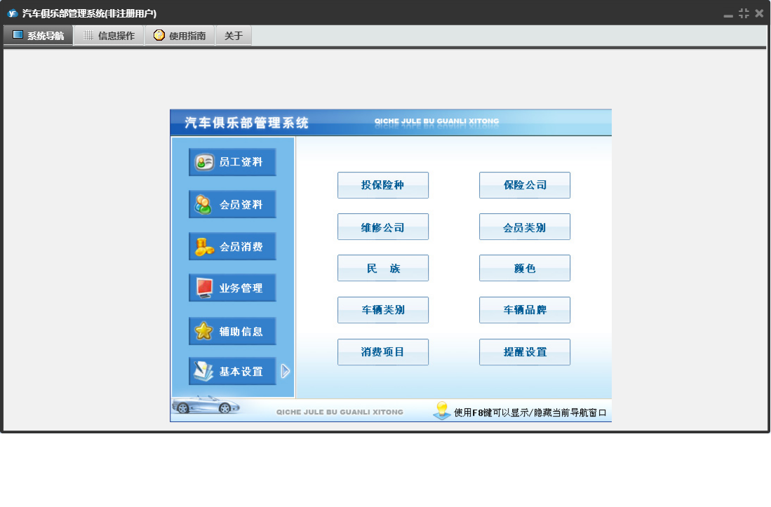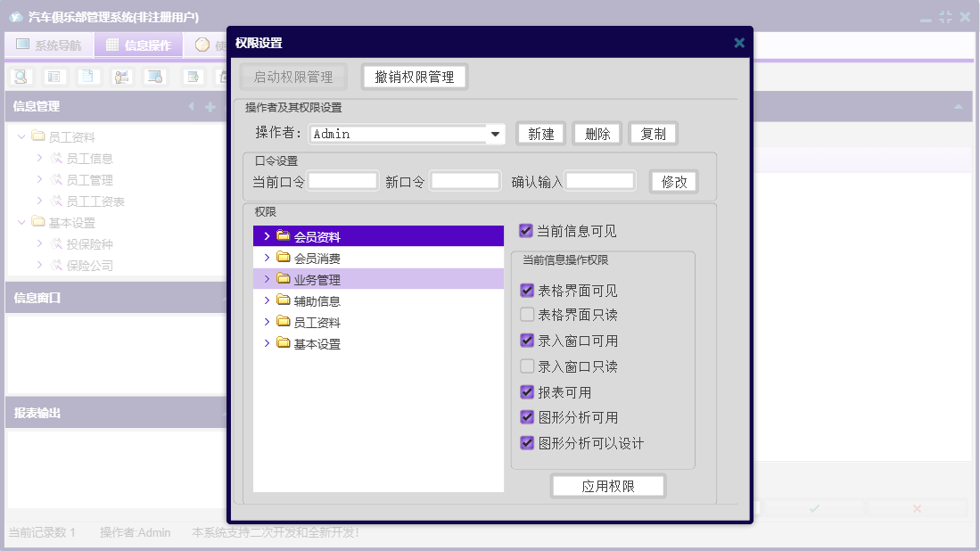 汽车俱乐部管理系统包含以下功能:车辆颜色、会员信息、车辆年审登记、消费项目、会员消费、基本设置、车辆保养到期提醒、辅助信息、员工资料、保险登记、会员类别、维修公司、日志窗口 (1)、年审到期提醒、会员参加活动、驾驶证换证到期提醒、路桥票到期提醒、办理优化服务、卡号解禁、权限设置、提醒设置、违法登记、理赔登记、民族、权限设置窗口 (1)、会员充值、车辆品牌、会员资料、关于、活动登记、车船税到期提醒、业务管理、员工管理、员工信息、车辆类别、日志、卡号禁用、保险公司、奖励积分、驾驶证年审到期提醒、投保险种、会员退卡等