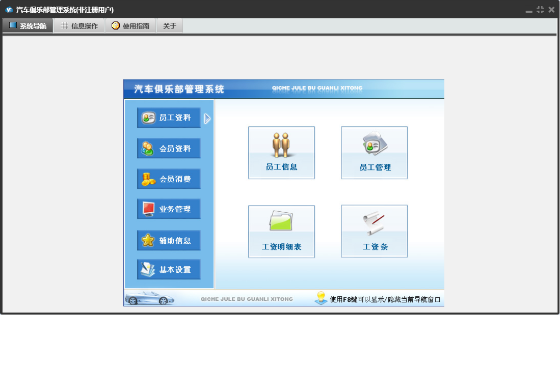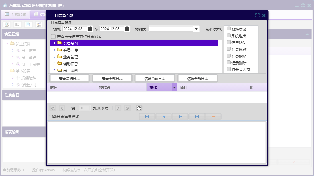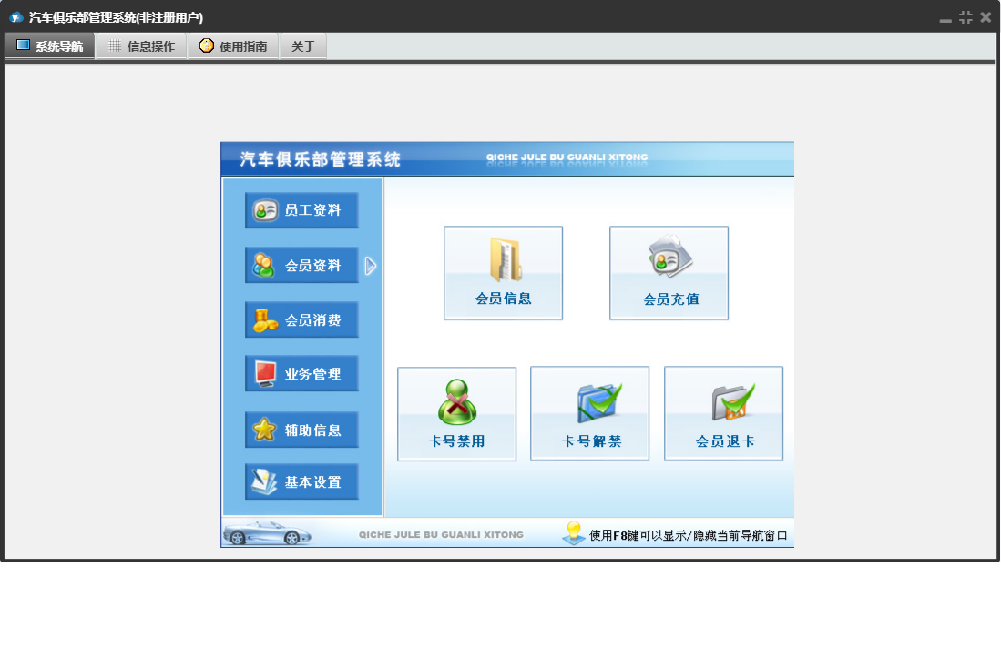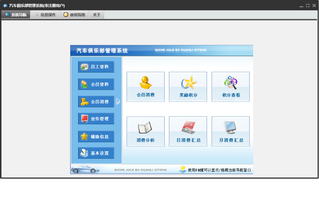 汽车俱乐部管理系统包含以下功能:车辆颜色、会员信息、车辆年审登记、消费项目、会员消费、基本设置、车辆保养到期提醒、辅助信息、员工资料、保险登记、会员类别、维修公司、日志窗口 (1)、年审到期提醒、会员参加活动、驾驶证换证到期提醒、路桥票到期提醒、办理优化服务、卡号解禁、权限设置、提醒设置、违法登记、理赔登记、民族、权限设置窗口 (1)、会员充值、车辆品牌、会员资料、关于、活动登记、车船税到期提醒、业务管理、员工管理、员工信息、车辆类别、日志、卡号禁用、保险公司、奖励积分、驾驶证年审到期提醒、投保险种、会员退卡等