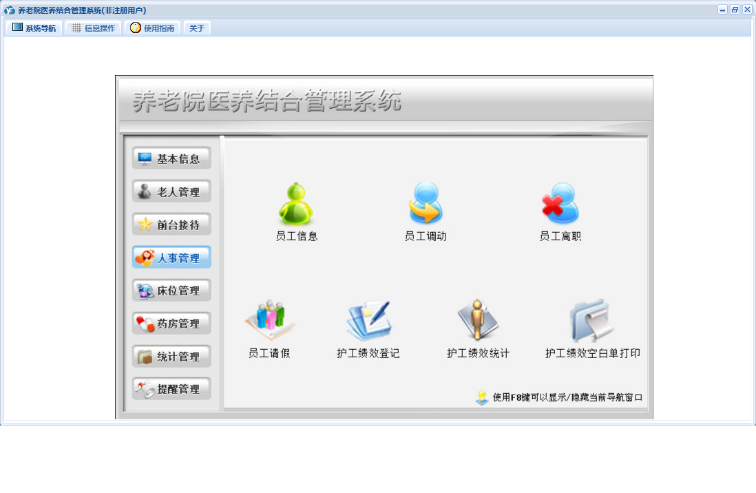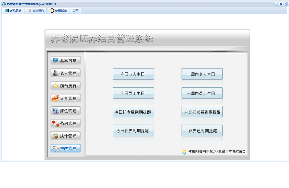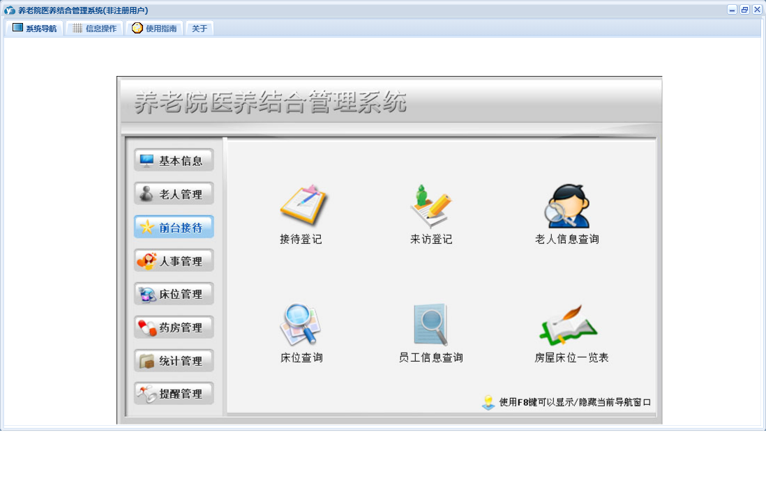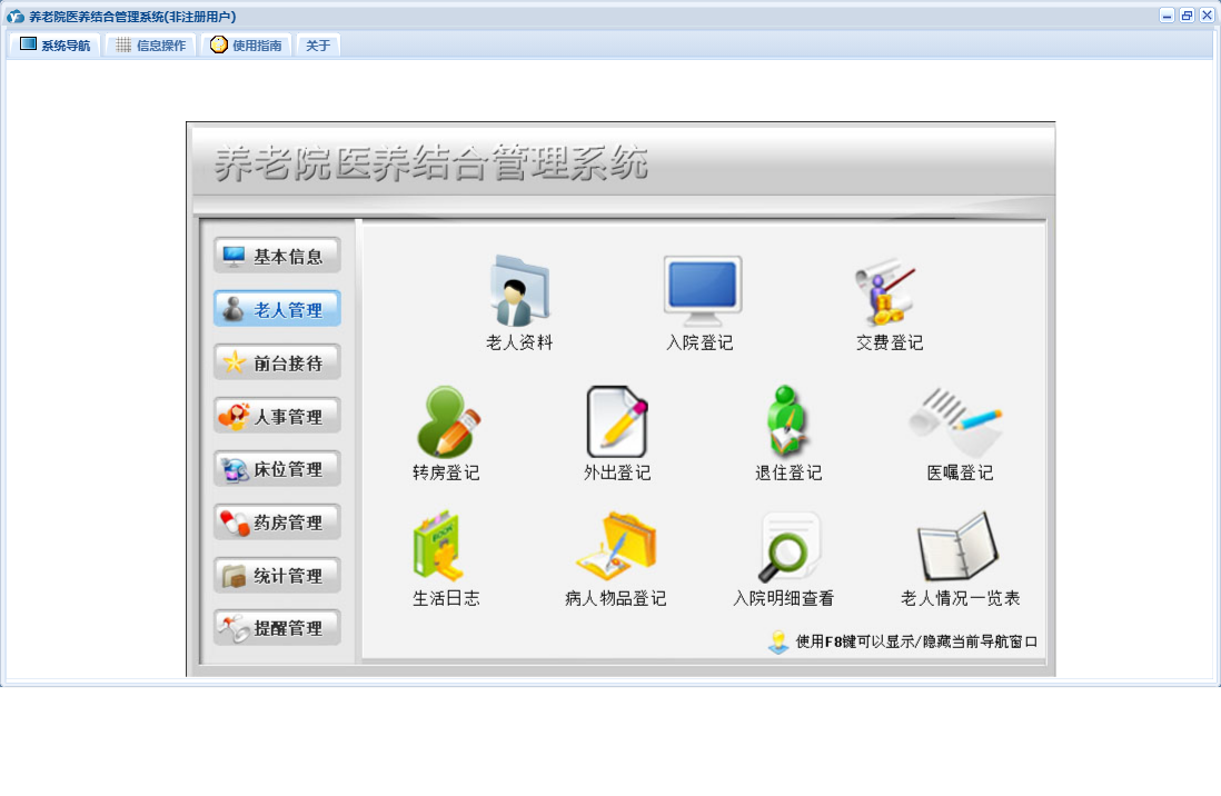 养老院医养结合管理系统包含以下功能:提醒管理、来访登记、床位管理、药房管理、人事管理、接待登记、老人资料、前台接待、统计管理、老人信息查询、员工信息查询、入院登记、单位信息、床位查询、交费登记、关于、基本信息、医嘱登记、转房登记、退住登记、生活日志、老人情况一览表、外出登记、病人物品登记、老人管理等