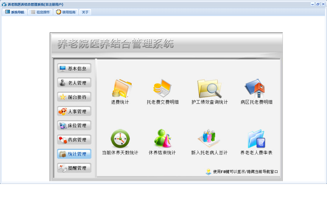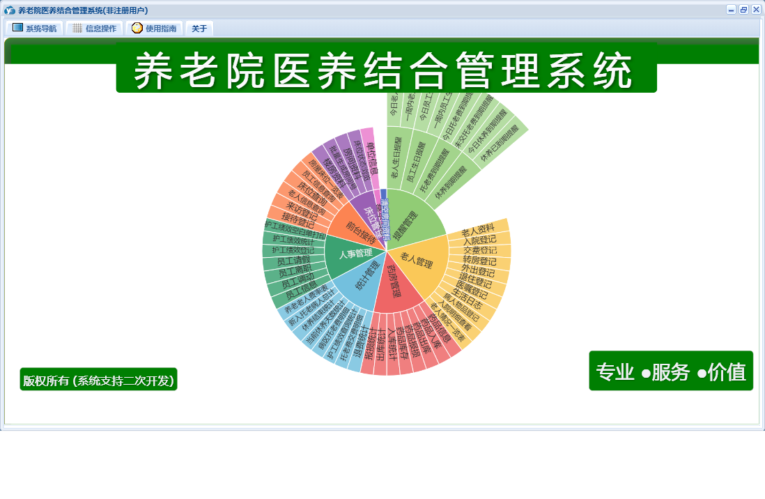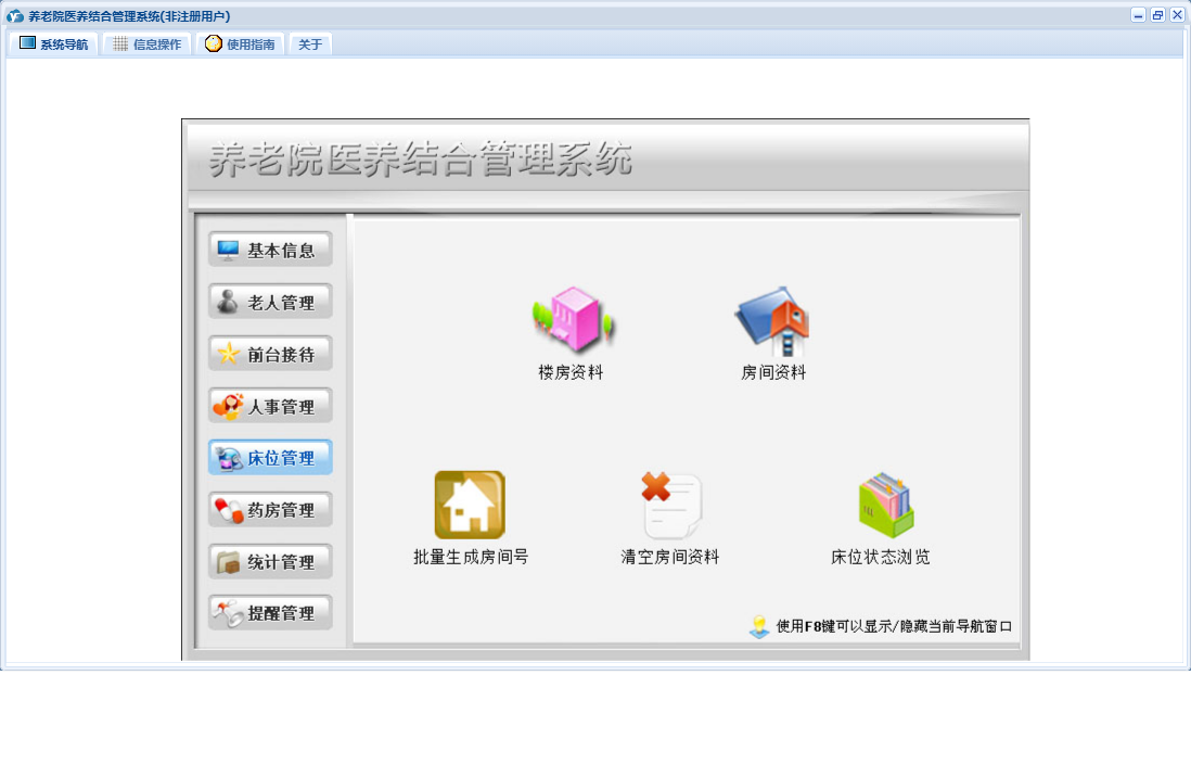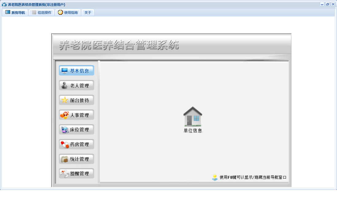 养老院医养结合管理系统包含以下功能:提醒管理、来访登记、床位管理、药房管理、人事管理、接待登记、老人资料、前台接待、统计管理、老人信息查询、员工信息查询、入院登记、单位信息、床位查询、交费登记、关于、基本信息、医嘱登记、转房登记、退住登记、生活日志、老人情况一览表、外出登记、病人物品登记、老人管理等