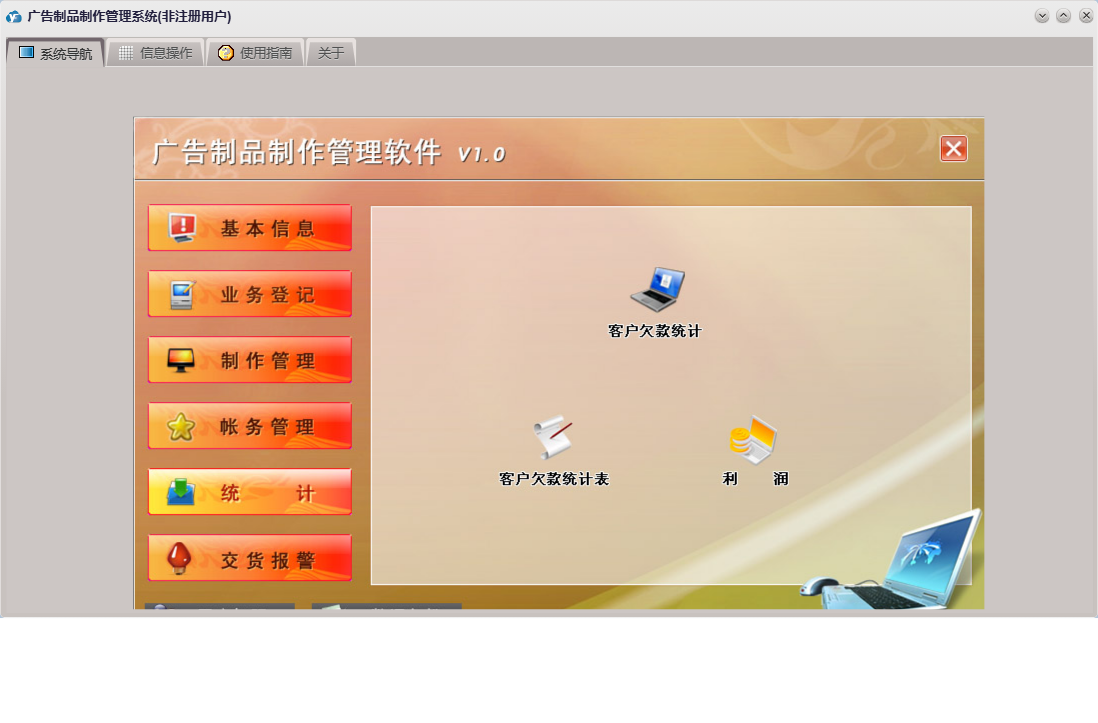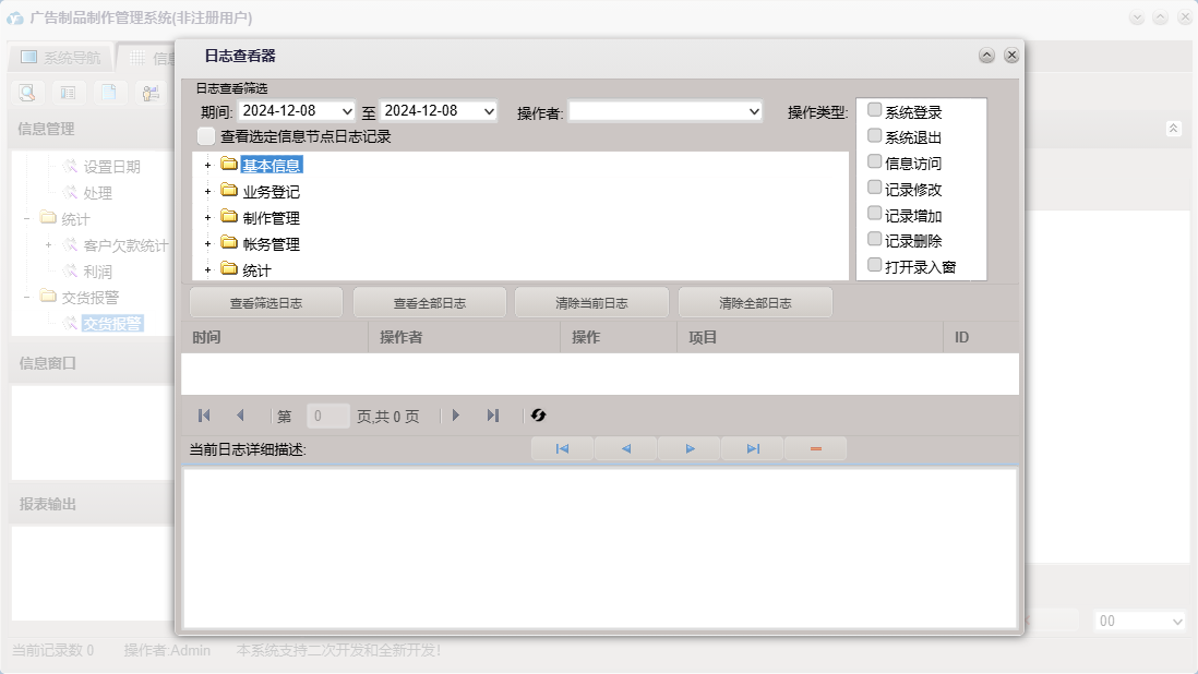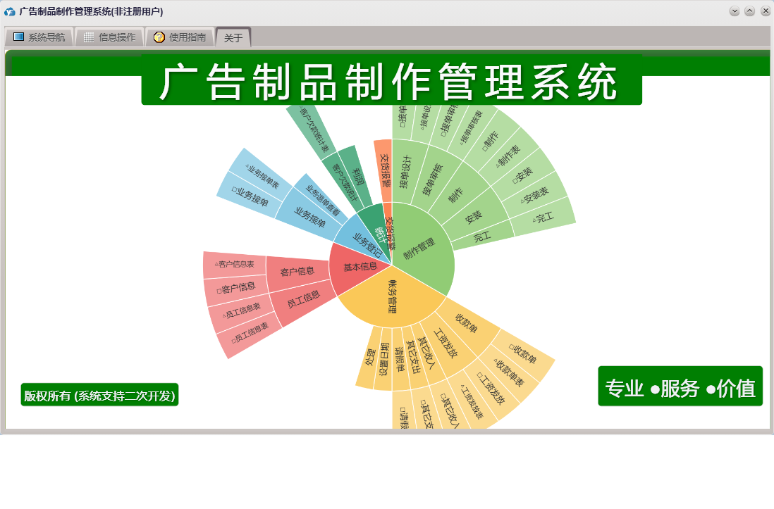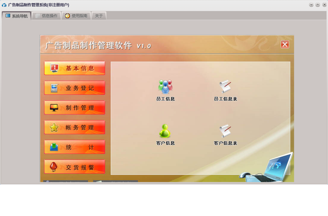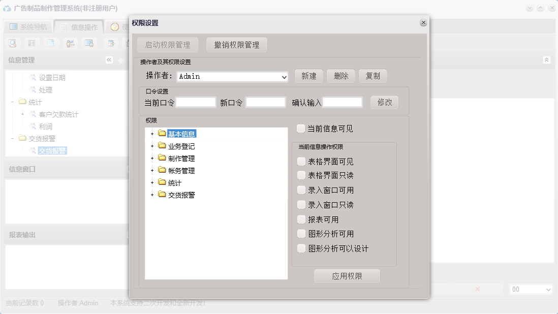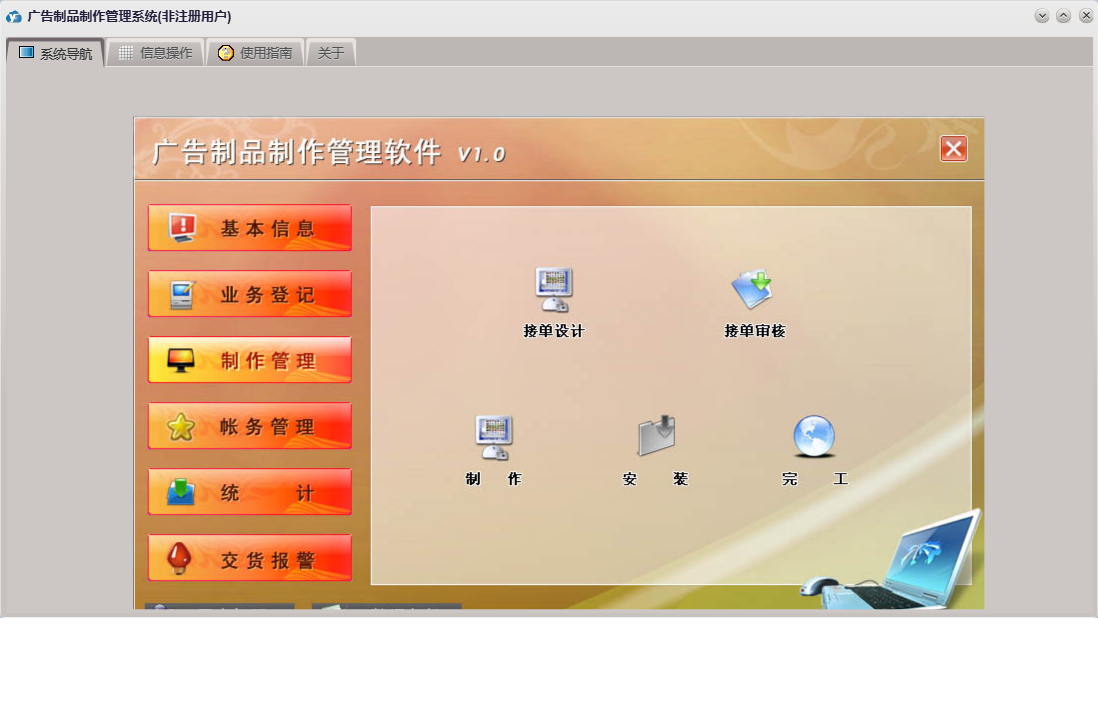 广告制品制作管理系统包含以下功能:接单审核、请假单、其它支出、收款单、业务接单、统计、权限设置、关于、基本信息、帐务管理、客户信息、安装、其它收入、交货报警、制作、工资发放、员工信息、业务登记、日志、接单设计、制作管理等