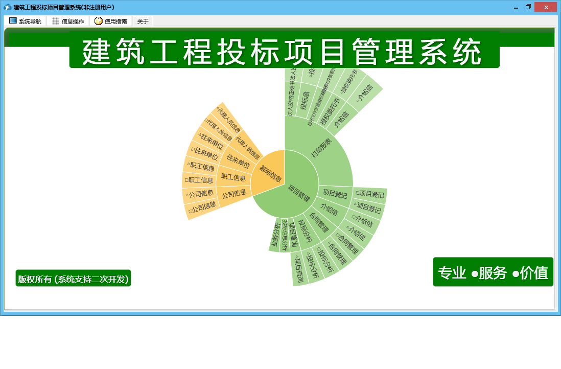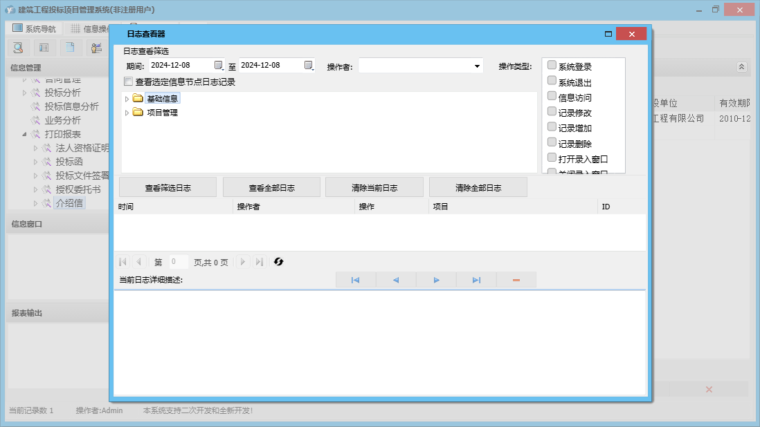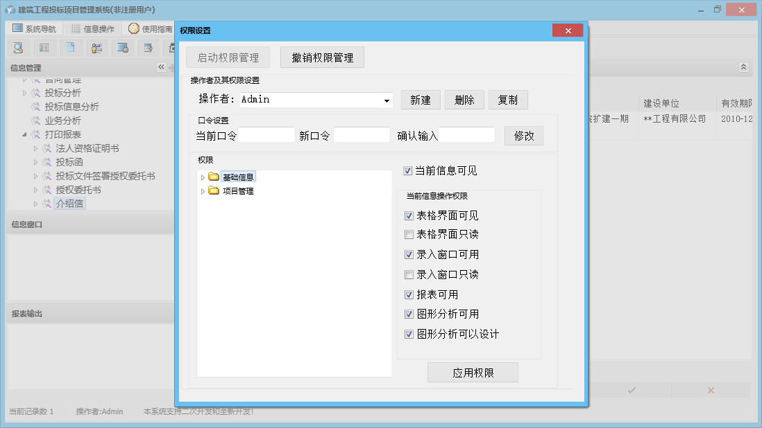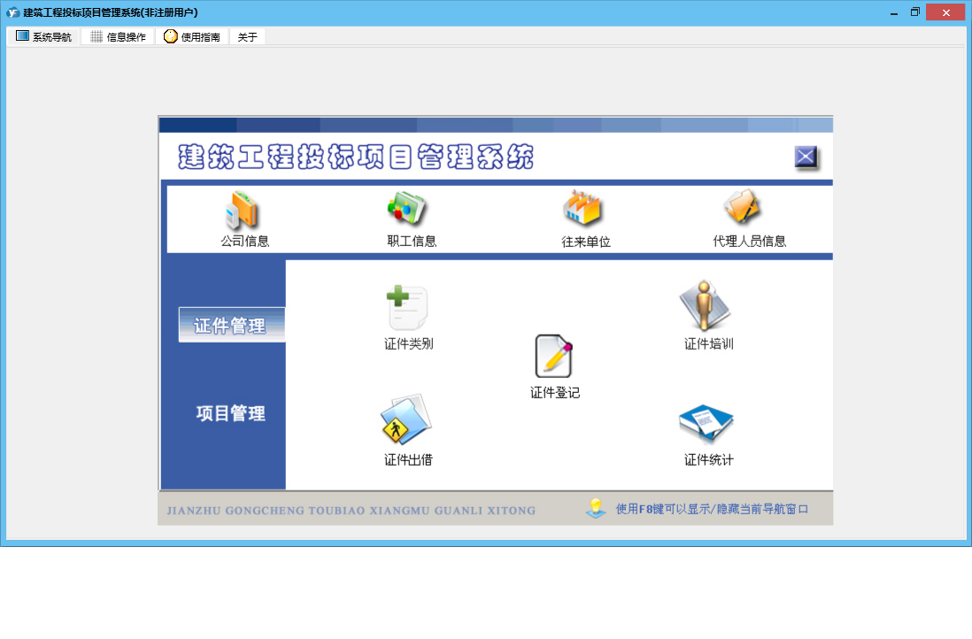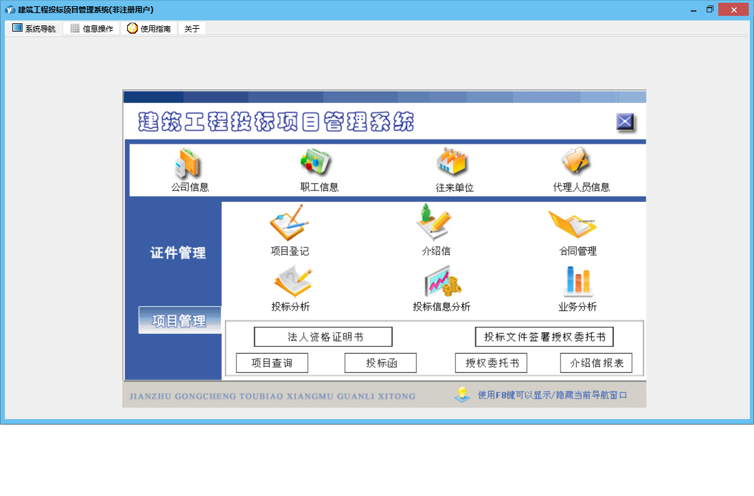 建筑工程投标项目管理系统包含以下功能:职工信息、往来单位、证件管理、项目登记、公司信息、日志、介绍信、关于、权限设置、投标分析、合同管理、项目管理、代理人员信息等