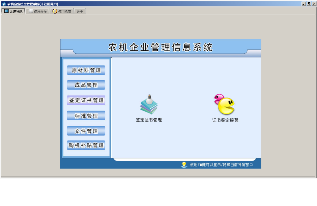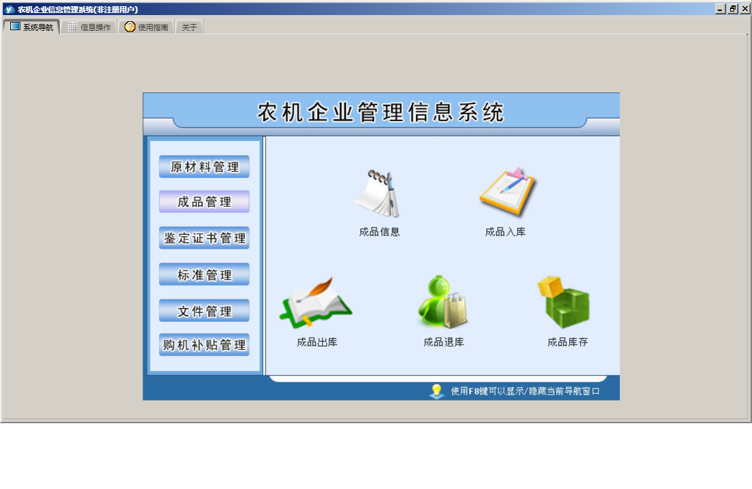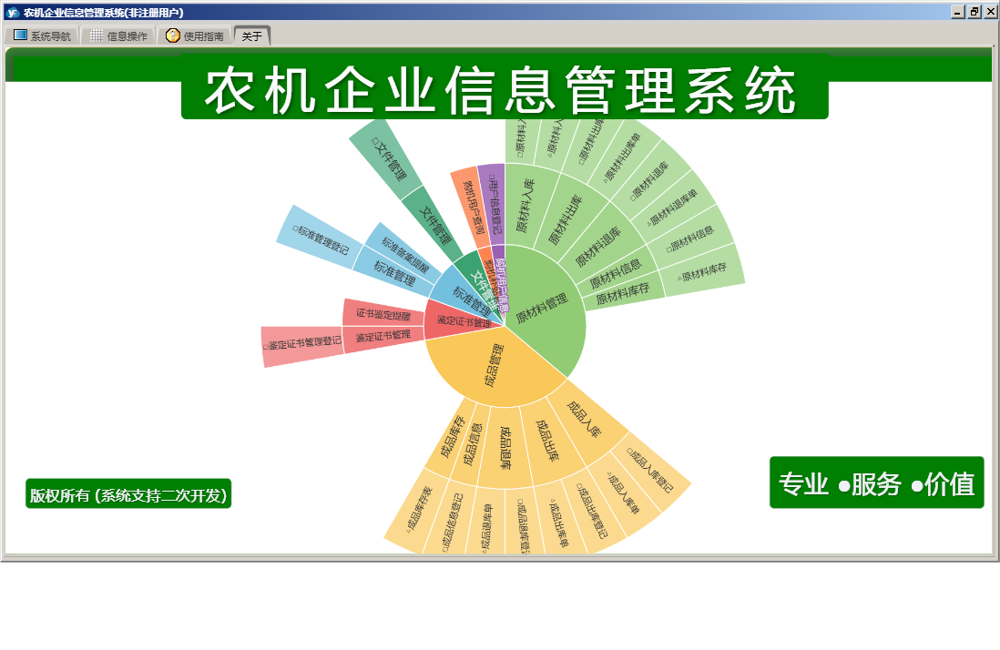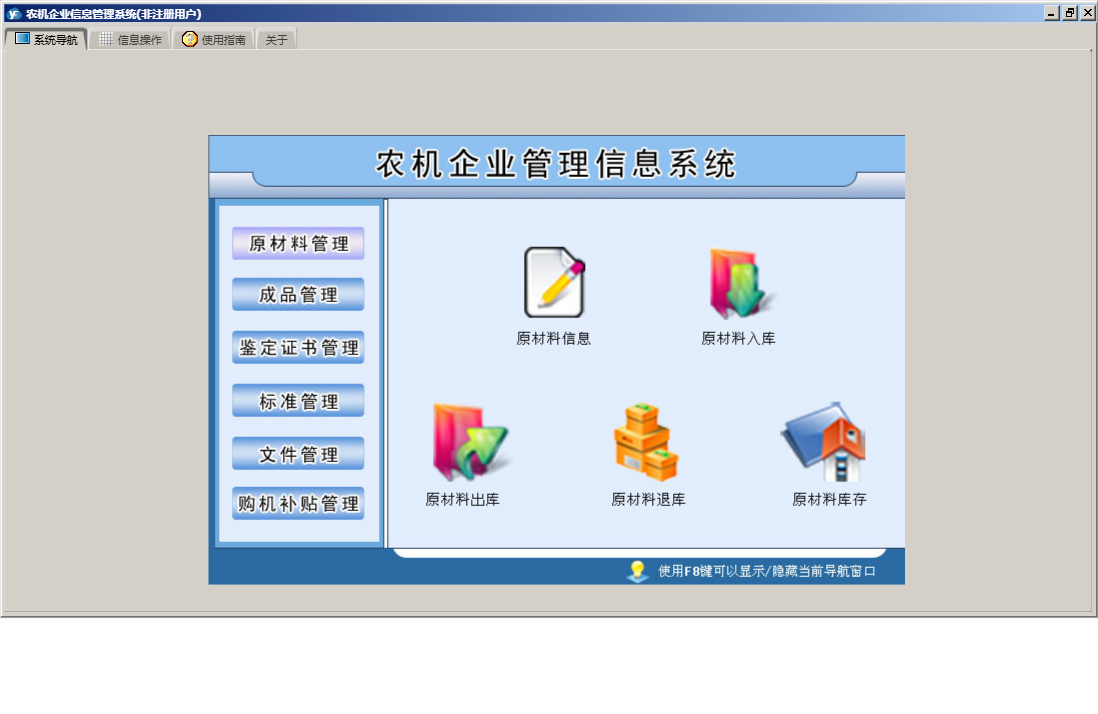 农机企业信息管理系统包含以下功能:原材料入库、原材料出库、成品管理、购机补贴管理、原材料退库、鉴定证书管理、原材料管理、成品退库、购机用户信息、日志、文件管理、关于、权限设置、原材料信息、成品信息、标准管理、成品入库、成品出库等