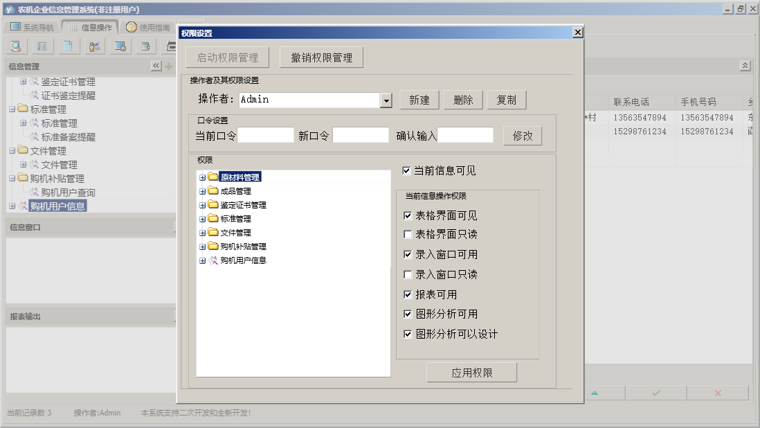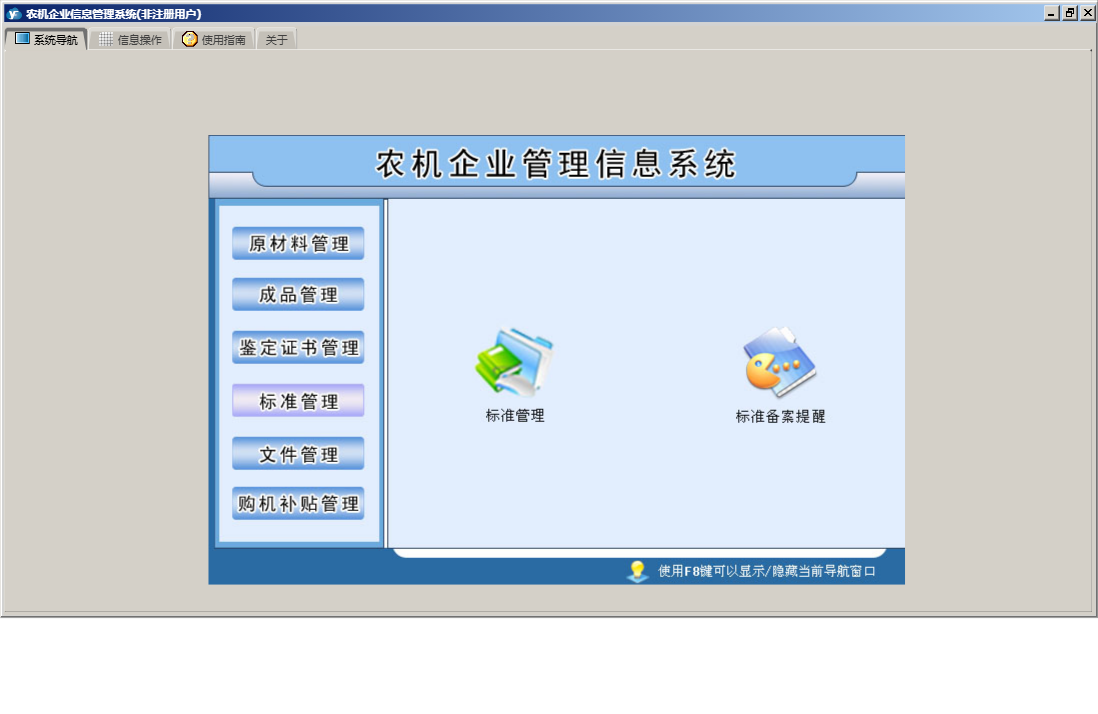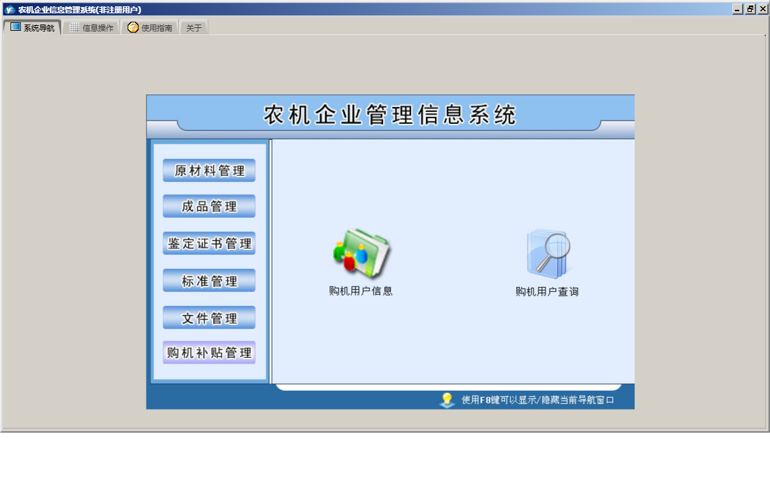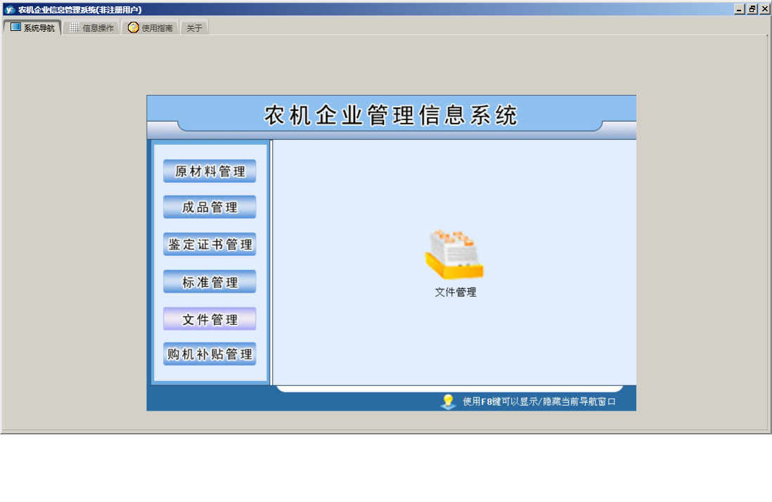 农机企业信息管理系统包含以下功能:原材料入库、原材料出库、成品管理、购机补贴管理、原材料退库、鉴定证书管理、原材料管理、成品退库、购机用户信息、日志、文件管理、关于、权限设置、原材料信息、成品信息、标准管理、成品入库、成品出库等