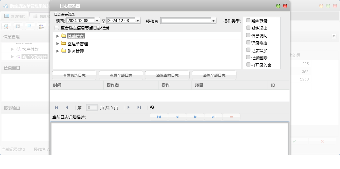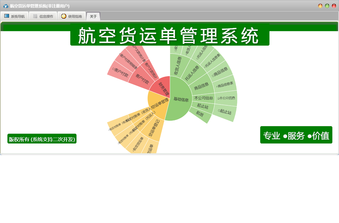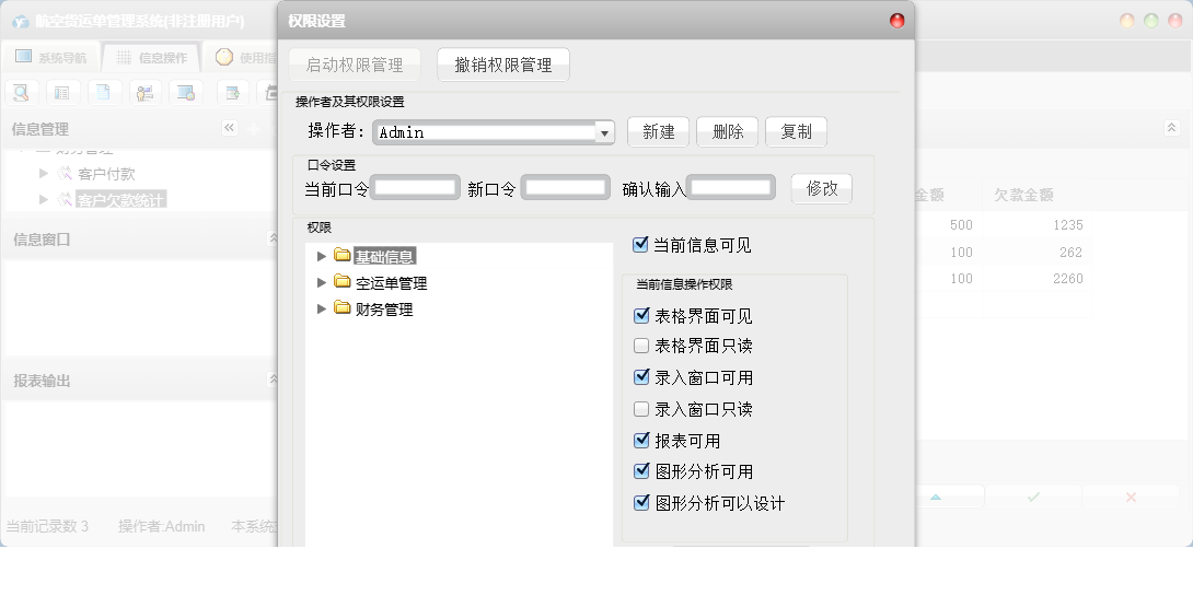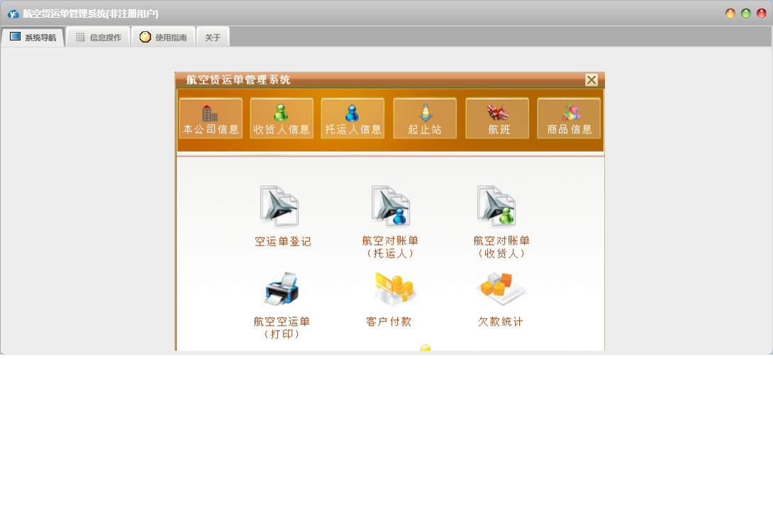 航空货运单管理系统包含以下功能:面板、客户付款、本公司信息、商品信息、日志、起止站、空运单登记、托运人信息、关于、权限设置、收货人信息等