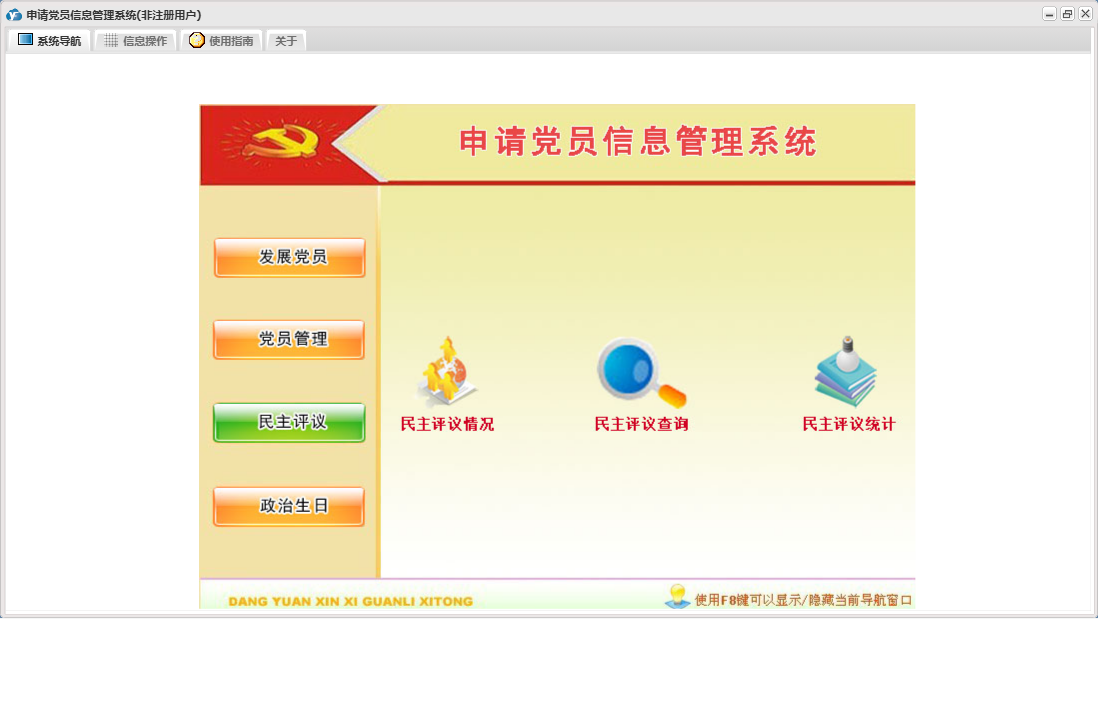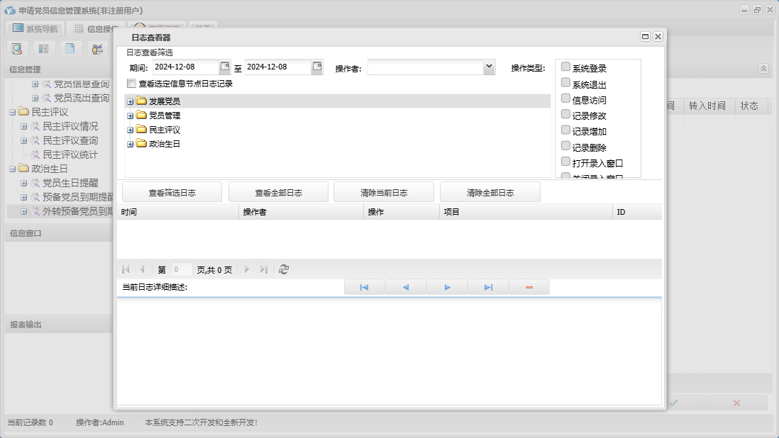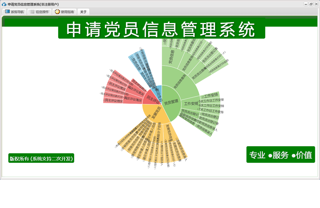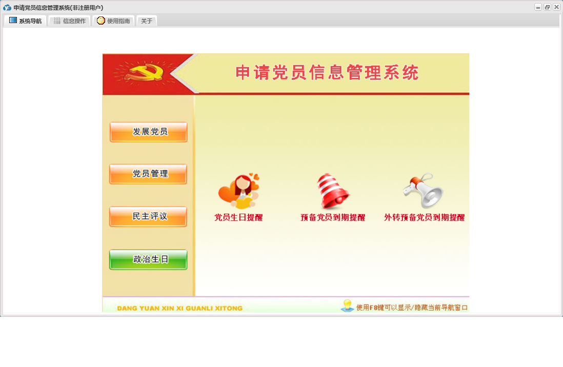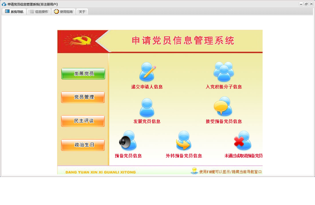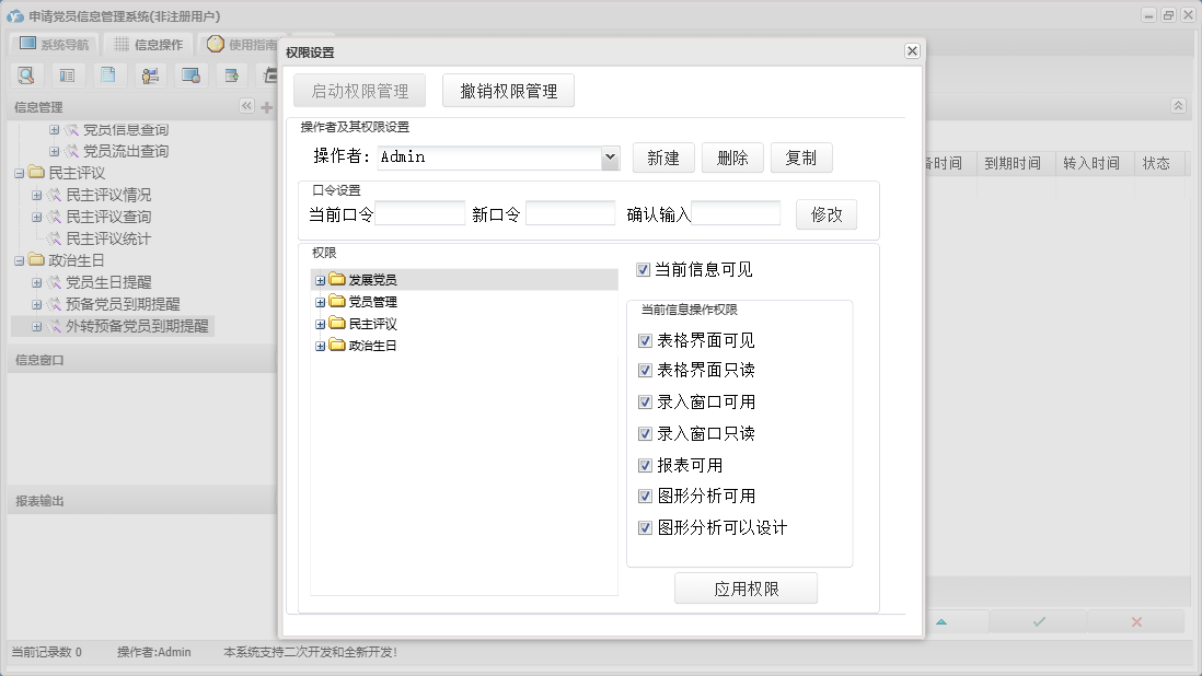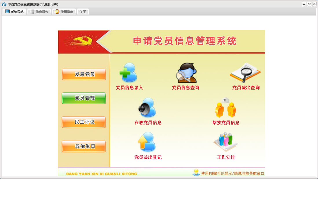 申请党员信息管理系统包含以下功能:发展党员信息、预备党员信息、党员信息、帮扶党员信息、民主评议情况、权限设置、党员流出登记、未通过或取消预备党员信息、预备党员到期提醒、入党积极分子信息、关于、政治生日、外转预备党员、工作安排、递交申请人信息、外转预备党员到期提醒、在职党员信息、发展党员、日志、民主评议、党员管理、接受预备党员、党员生日提醒等