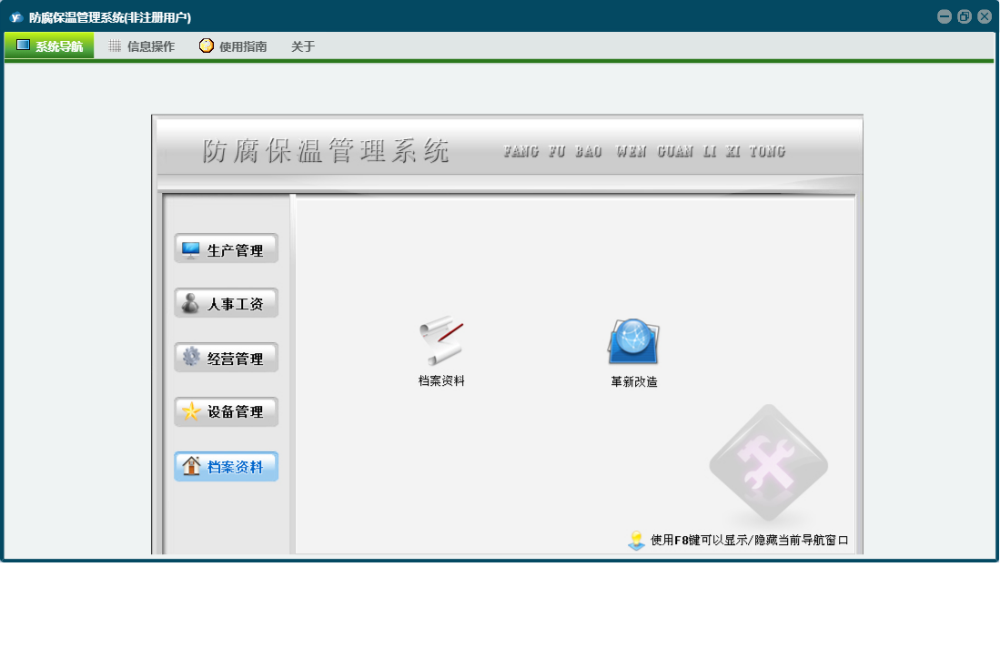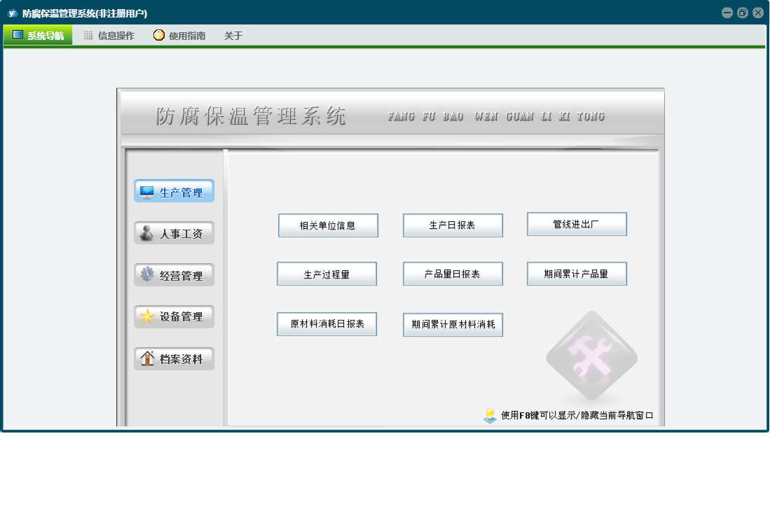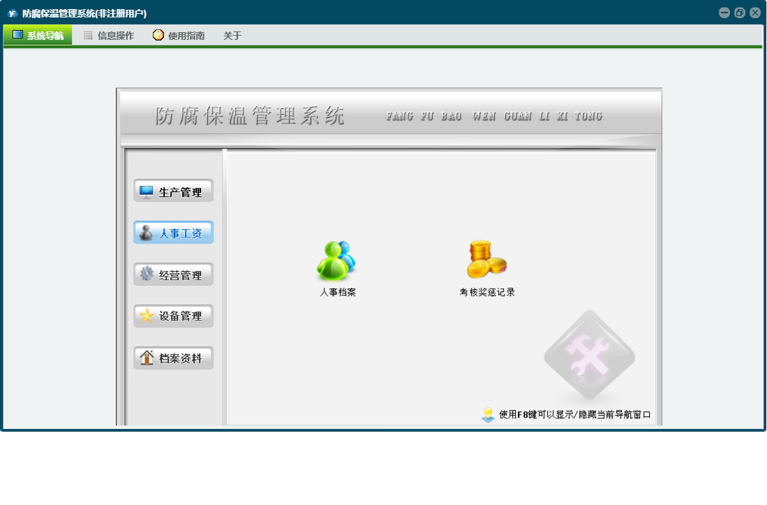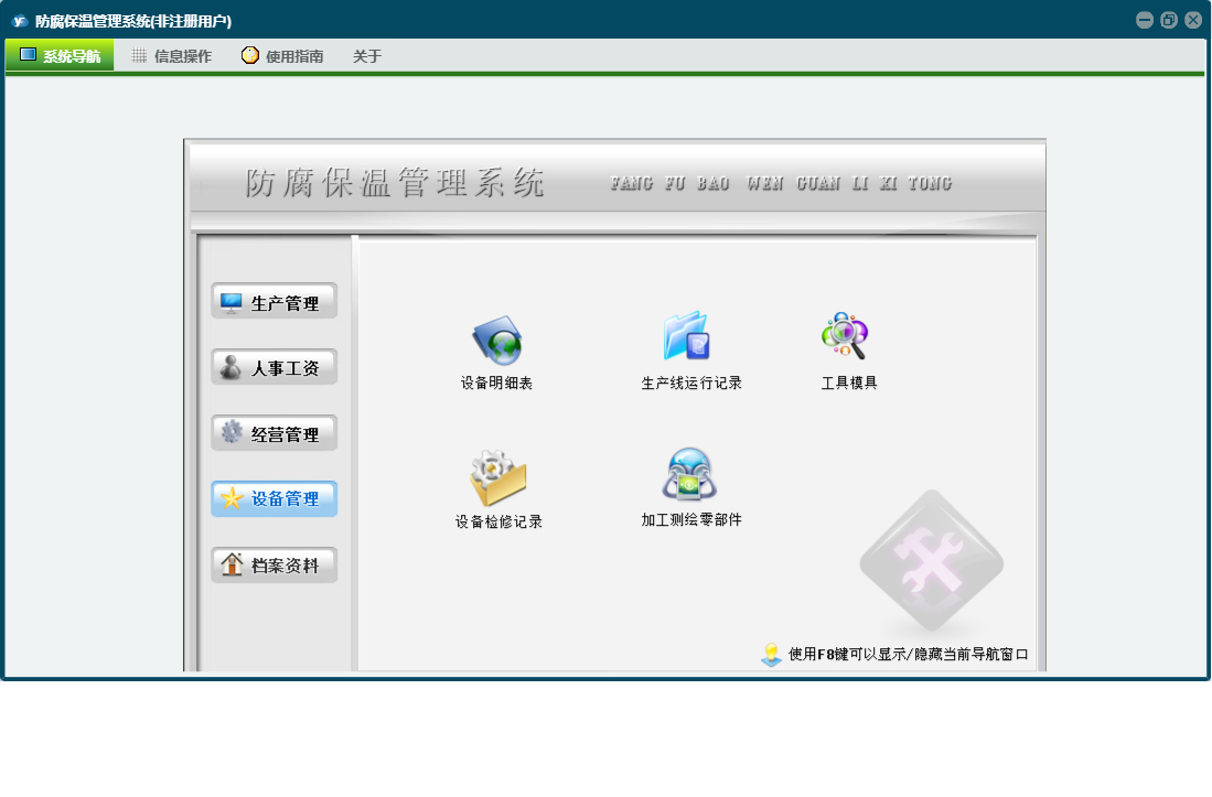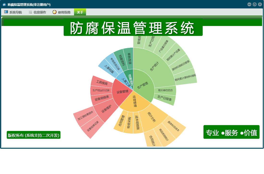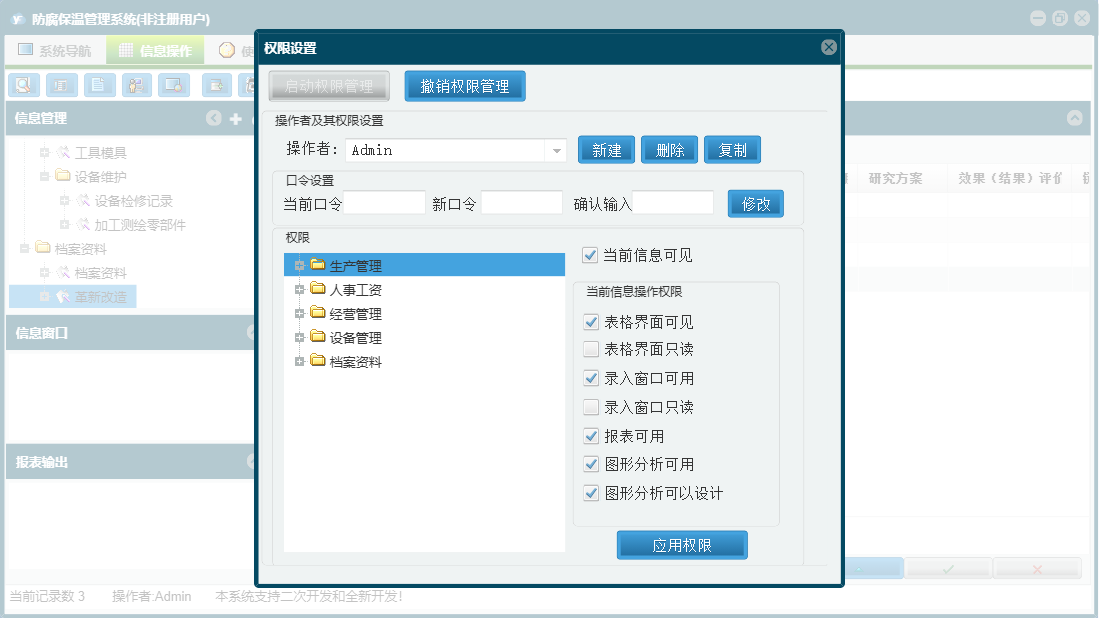 防腐保温管理系统包含以下功能:考核奖惩记录、经营管理、人事工资、成本明细账、设备检修记录、加工测绘零部件、设备明细表、权限设置、相关单位信息、档案资料、生产线运行记录、关于、合同管理、物资采购、设备管理、人事档案、生产日、工具模具、日志、生产管理、革新改造等