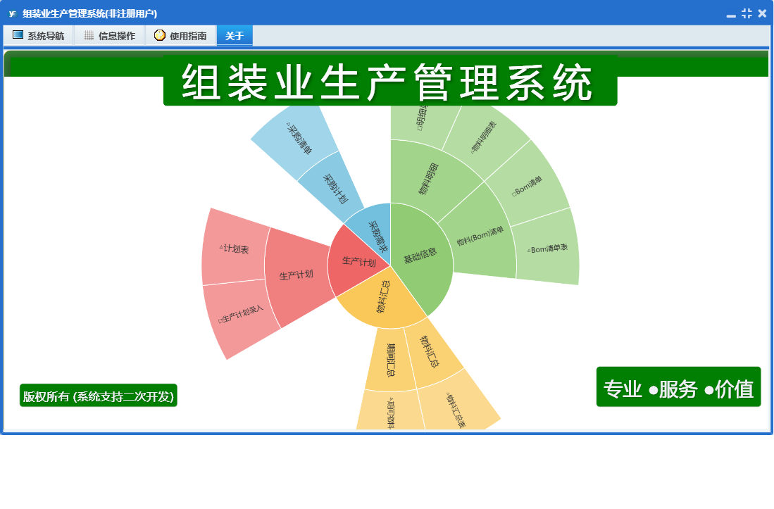 组装业生产管理系统包含以下功能:面板、生产计划、日志、关于、权限设置、物料明细、物料(Bom)清单等