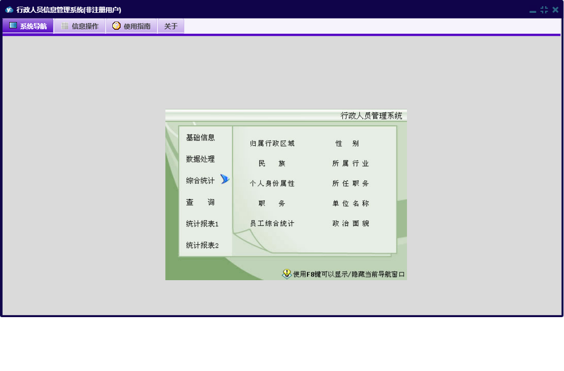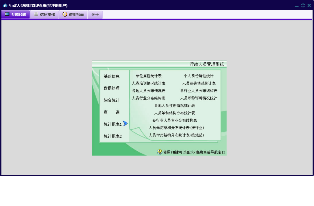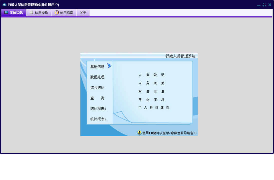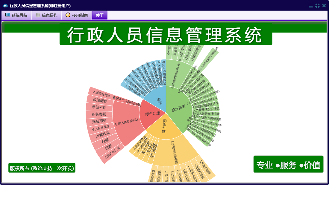 行政人员信息管理系统包含以下功能:分类管理、人员基本信息、人员登记、人员惩戒信息、统计、综合处理、权限设置、人员培训信息、人员离职情况、报表2、基本信息采集、查询、单位信息、关于、人员科研信息、人员奖励信息、人员变动登记、人员配偶信息、人员工作信息、日志、人员学历信息等