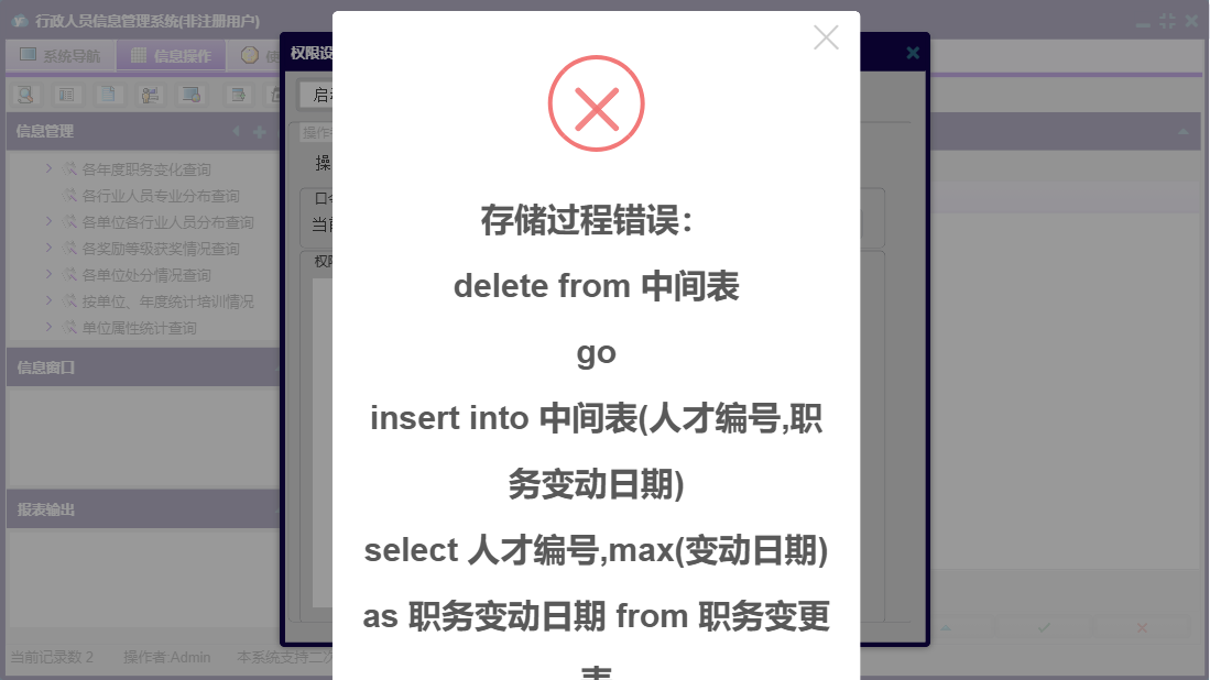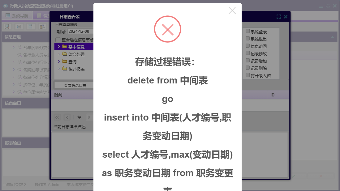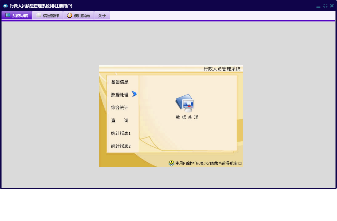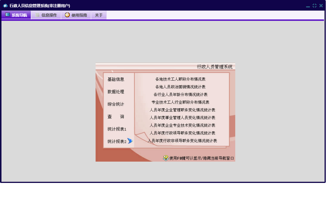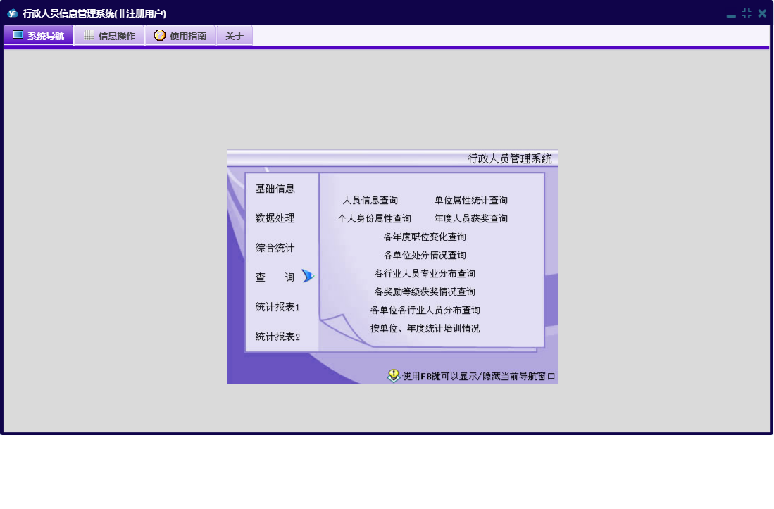 行政人员信息管理系统包含以下功能:分类管理、人员基本信息、人员登记、人员惩戒信息、统计、综合处理、权限设置、人员培训信息、人员离职情况、报表2、基本信息采集、查询、单位信息、关于、人员科研信息、人员奖励信息、人员变动登记、人员配偶信息、人员工作信息、日志、人员学历信息等