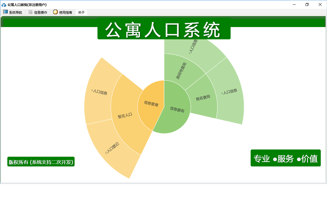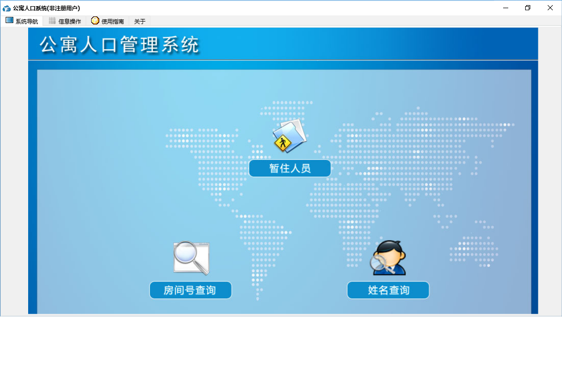 公寓人口系统包含以下功能:暂住人口、关于、信息管理等