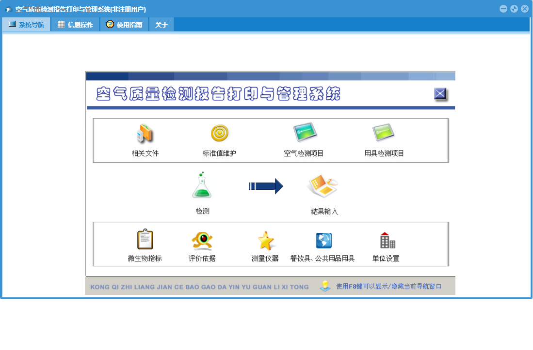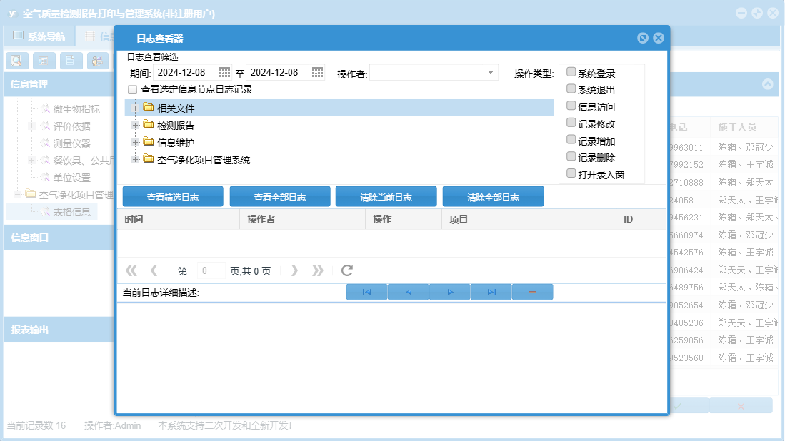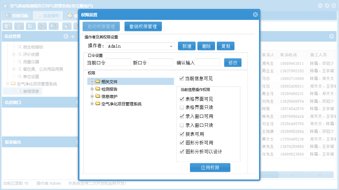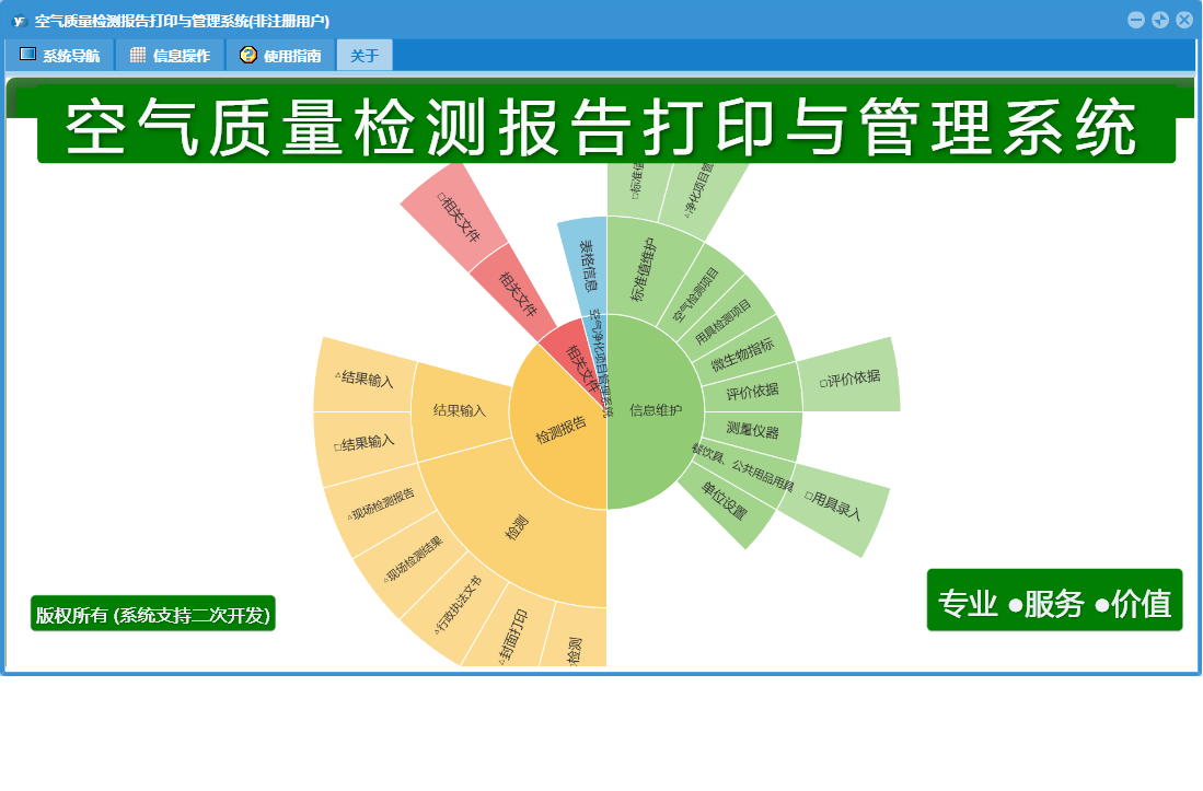 空气质量检测报告打印与管理系统包含以下功能:1、评价依据、日志、关于、标准值维护、权限设置、相关文件、检测、餐饮具、公共用品用具等