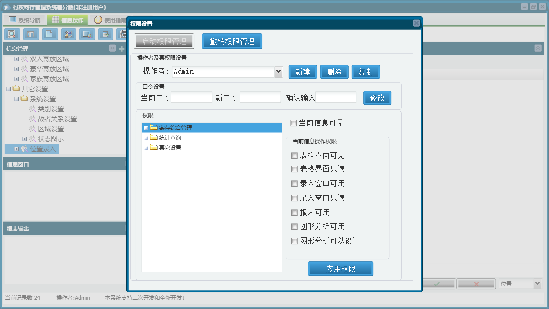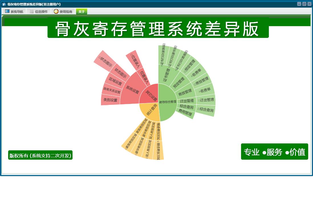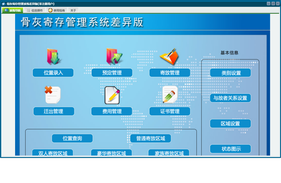 骨灰寄存管理系统差异版包含以下功能:面板、豪华寄放区域、位置录入、双人寄放区域、寄放管理、日志、预定管理、关于、综合查询、权限设置、普通寄放区域、家族寄放区域、迁出管理等