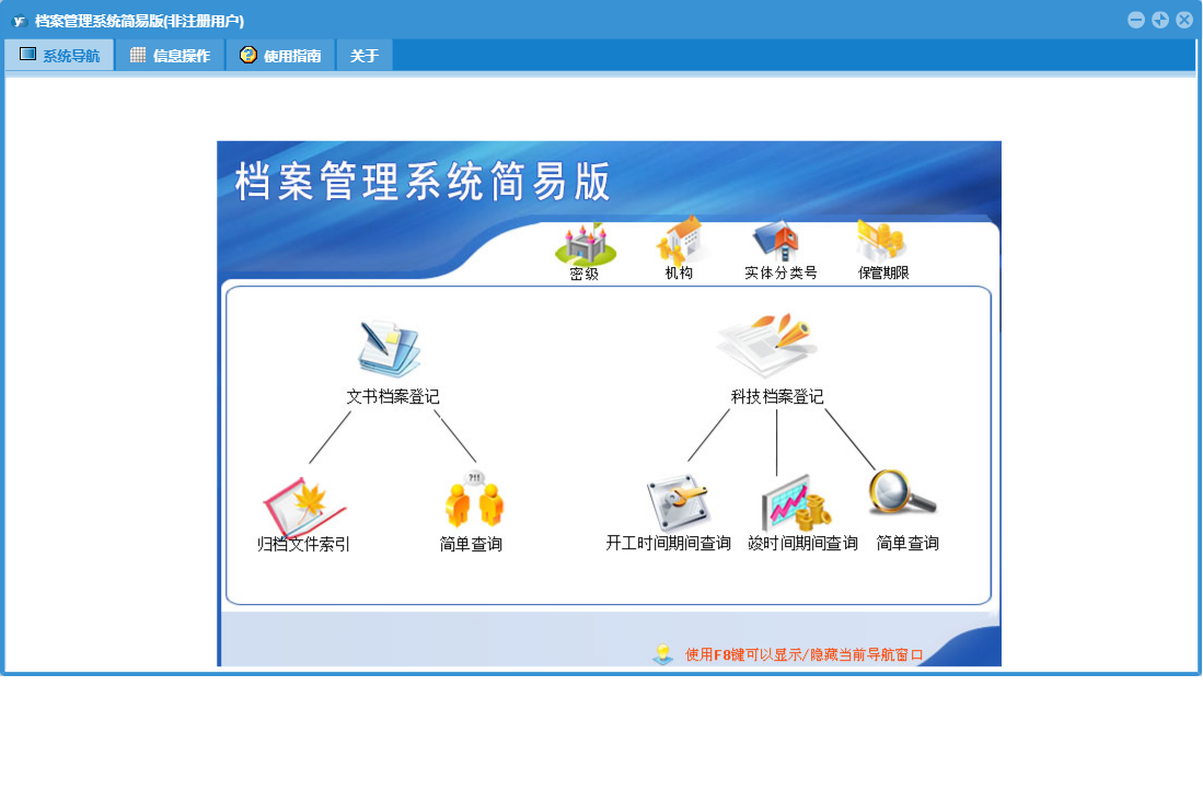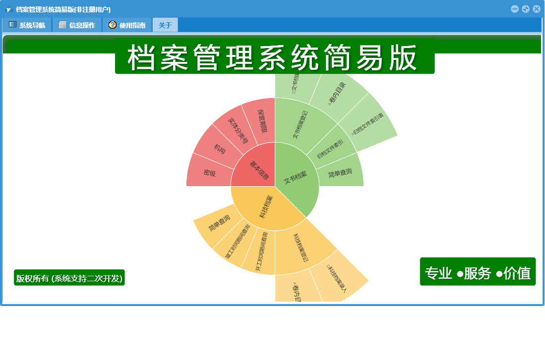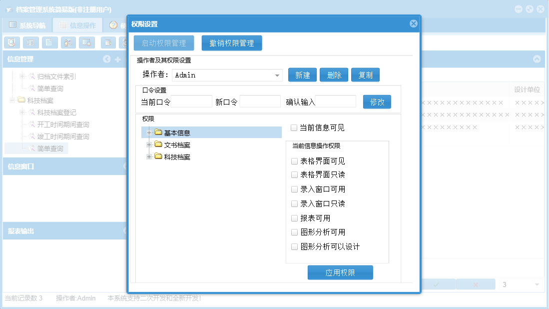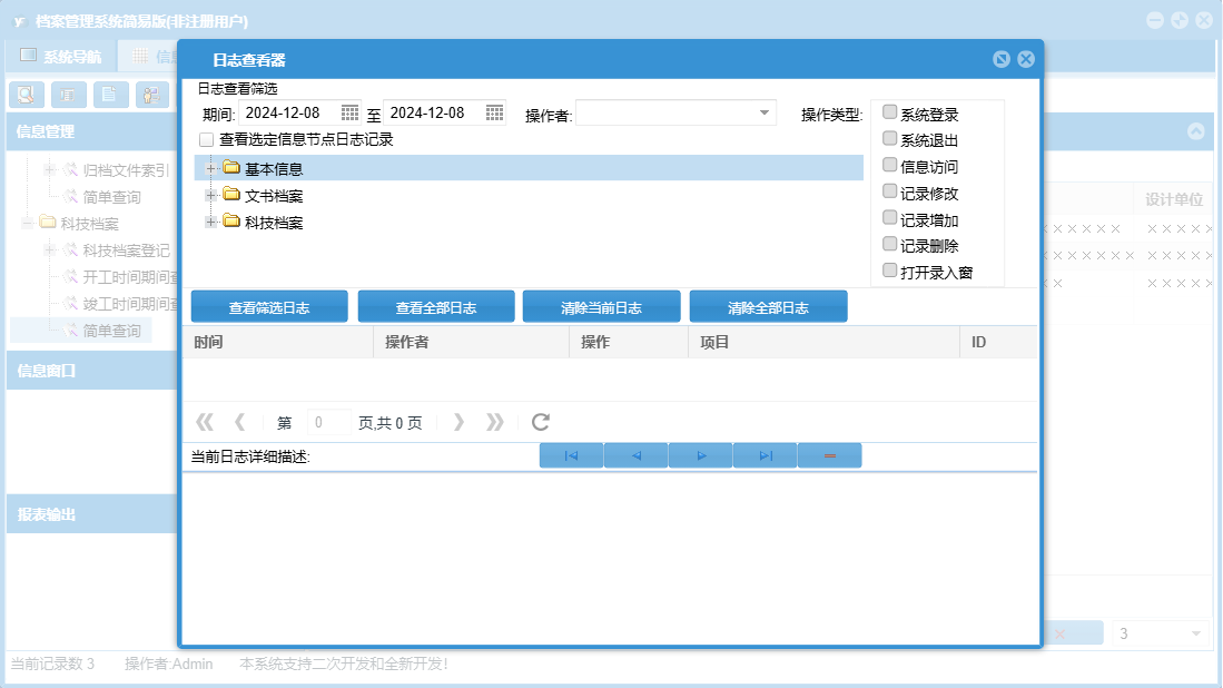 档案管理系统简易版包含以下功能:面板、日志、关于、权限设置、科技档案登记、文书档案登记等