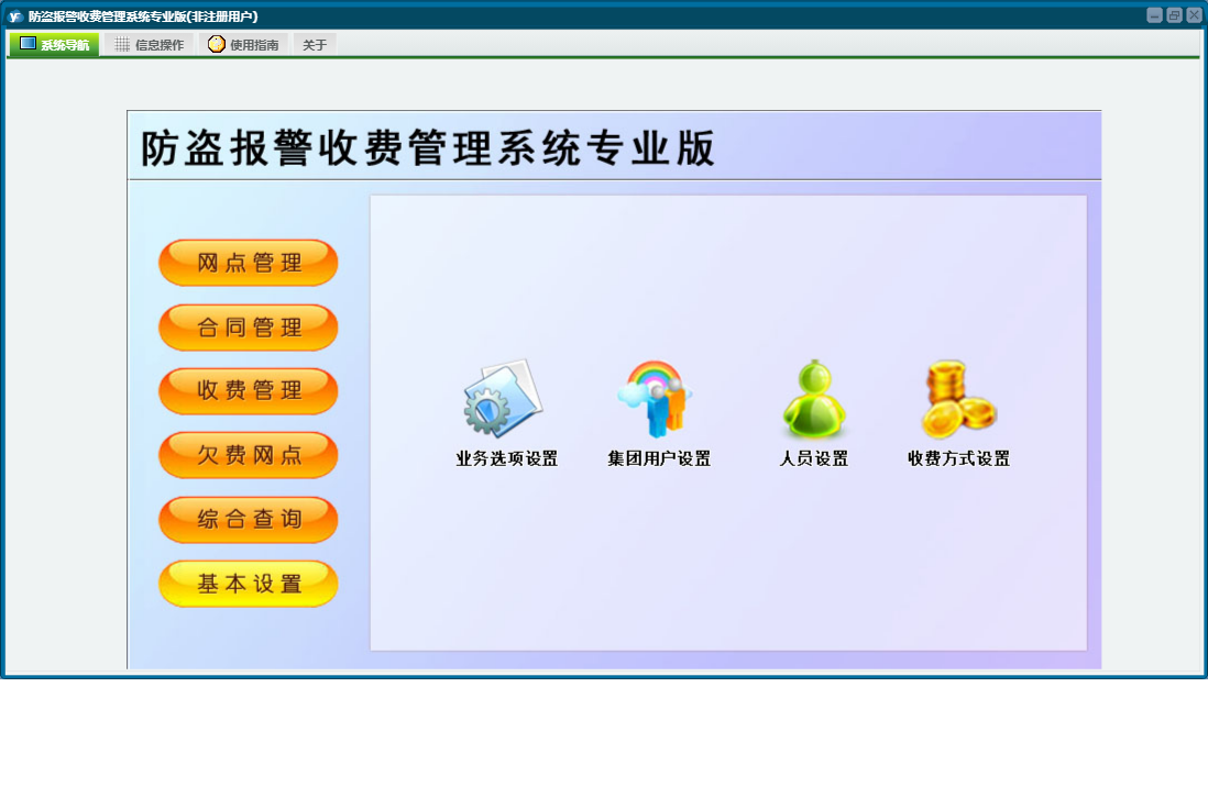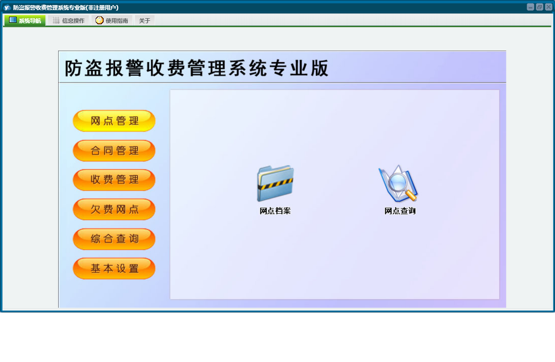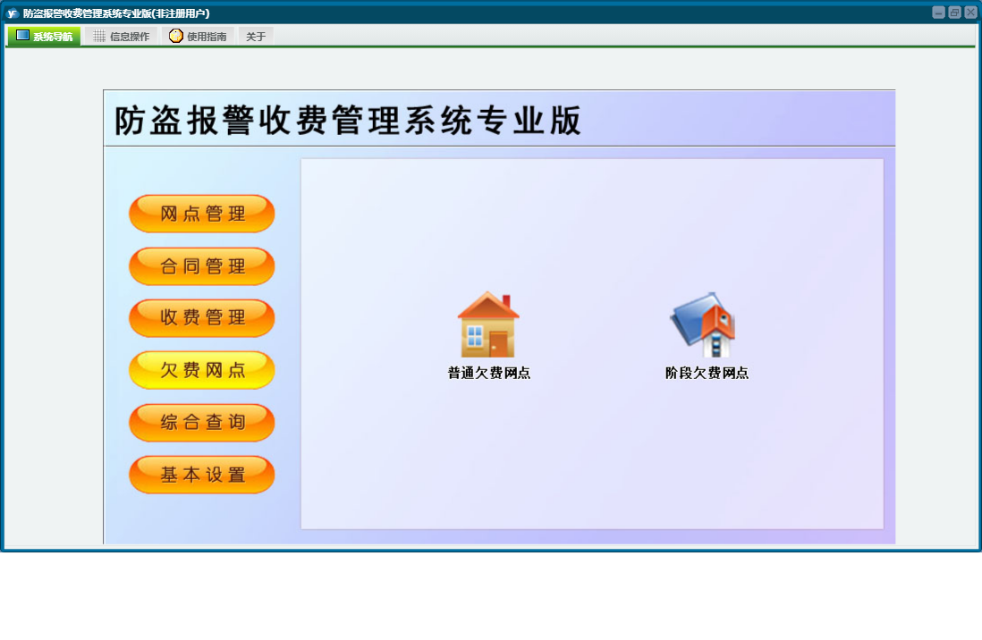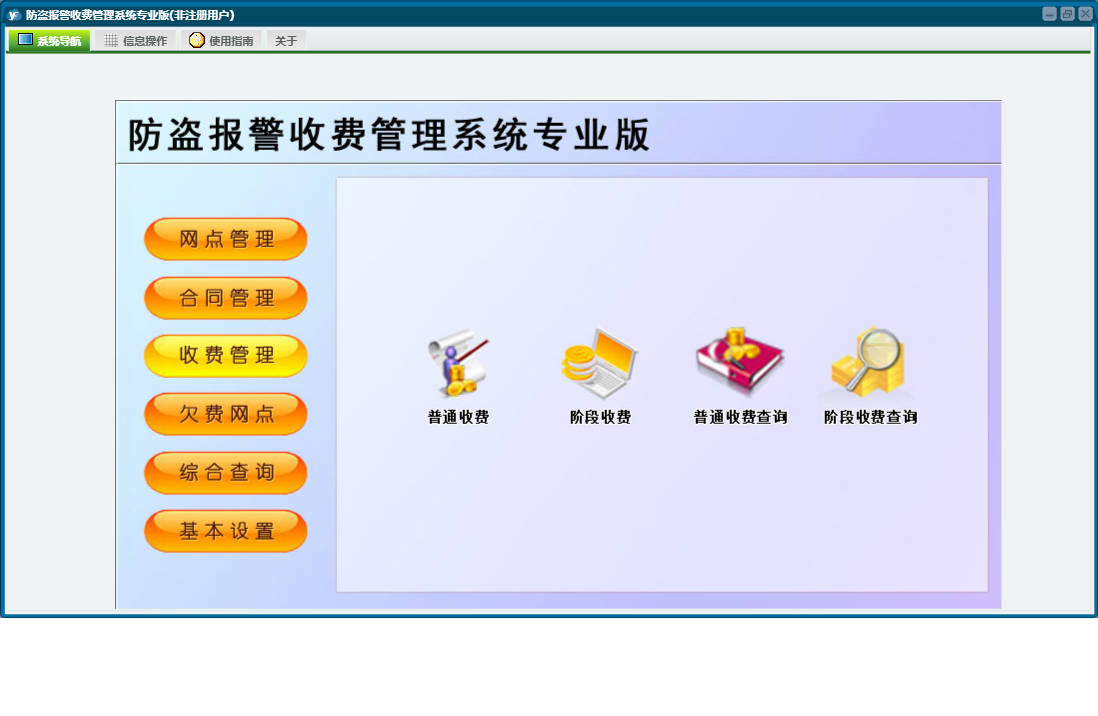 防盗报警收费管理系统专业版包含以下功能:普通收费、网点档案、阶段收费、基本设置、普通欠费网点、欠费网点、日志、人员设置、关于、阶段收费合同、综合查询、合同管理、普通收费合同、阶段欠费网点、网点管理、权限设置、收费管理等