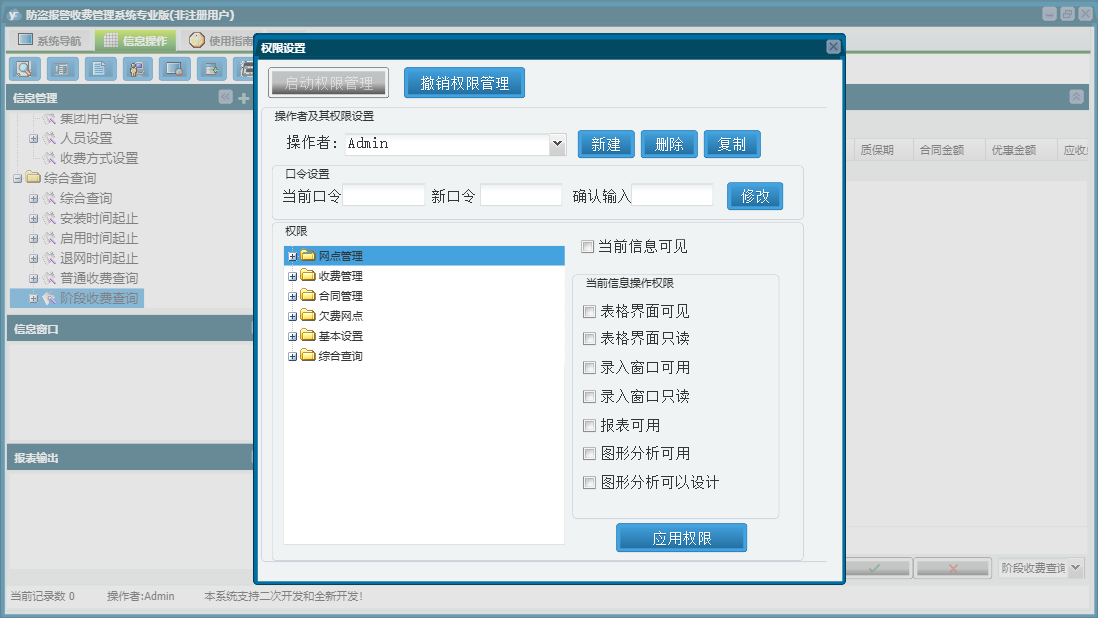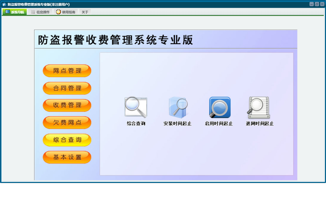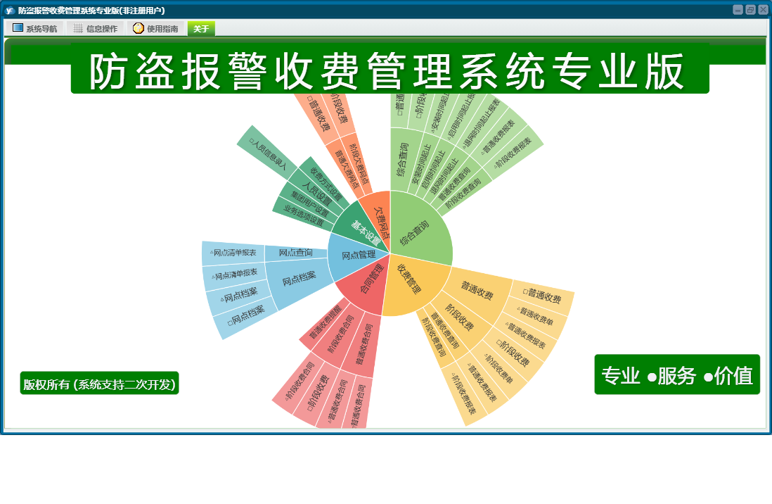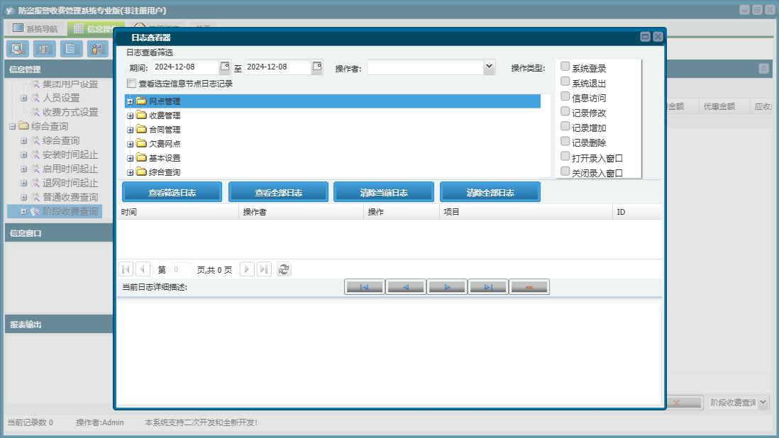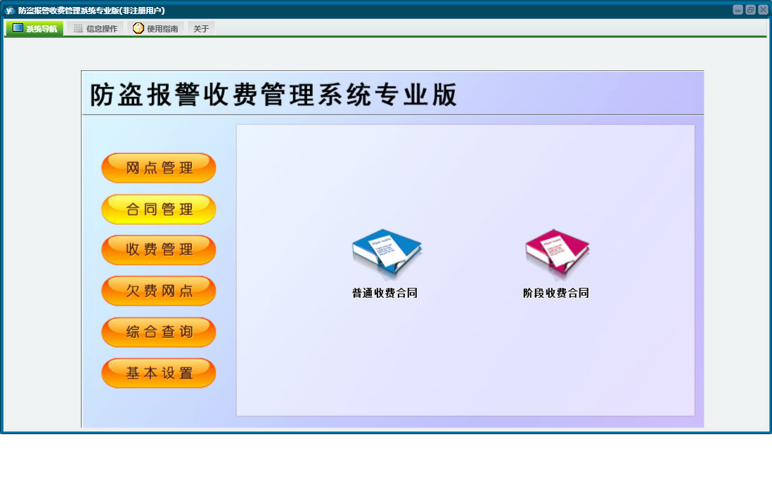 防盗报警收费管理系统专业版包含以下功能:普通收费、网点档案、阶段收费、基本设置、普通欠费网点、欠费网点、日志、人员设置、关于、阶段收费合同、综合查询、合同管理、普通收费合同、阶段欠费网点、网点管理、权限设置、收费管理等