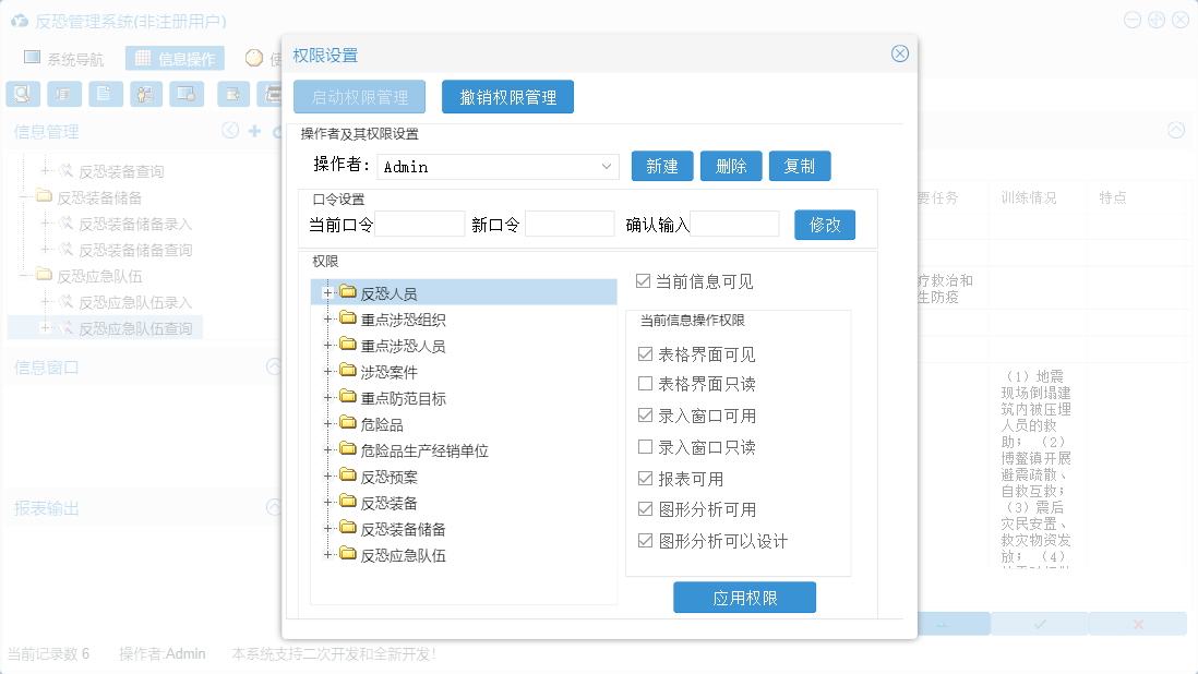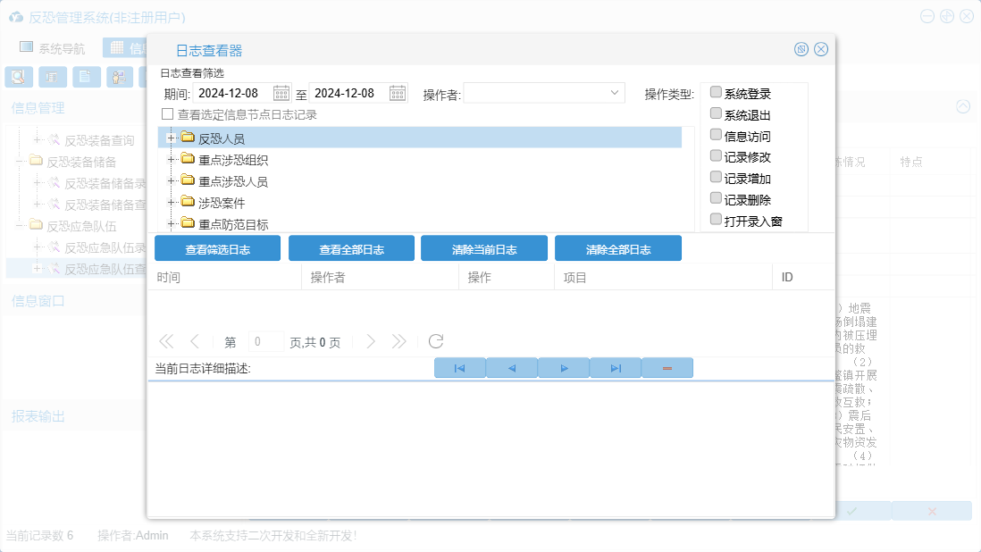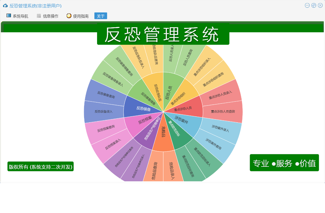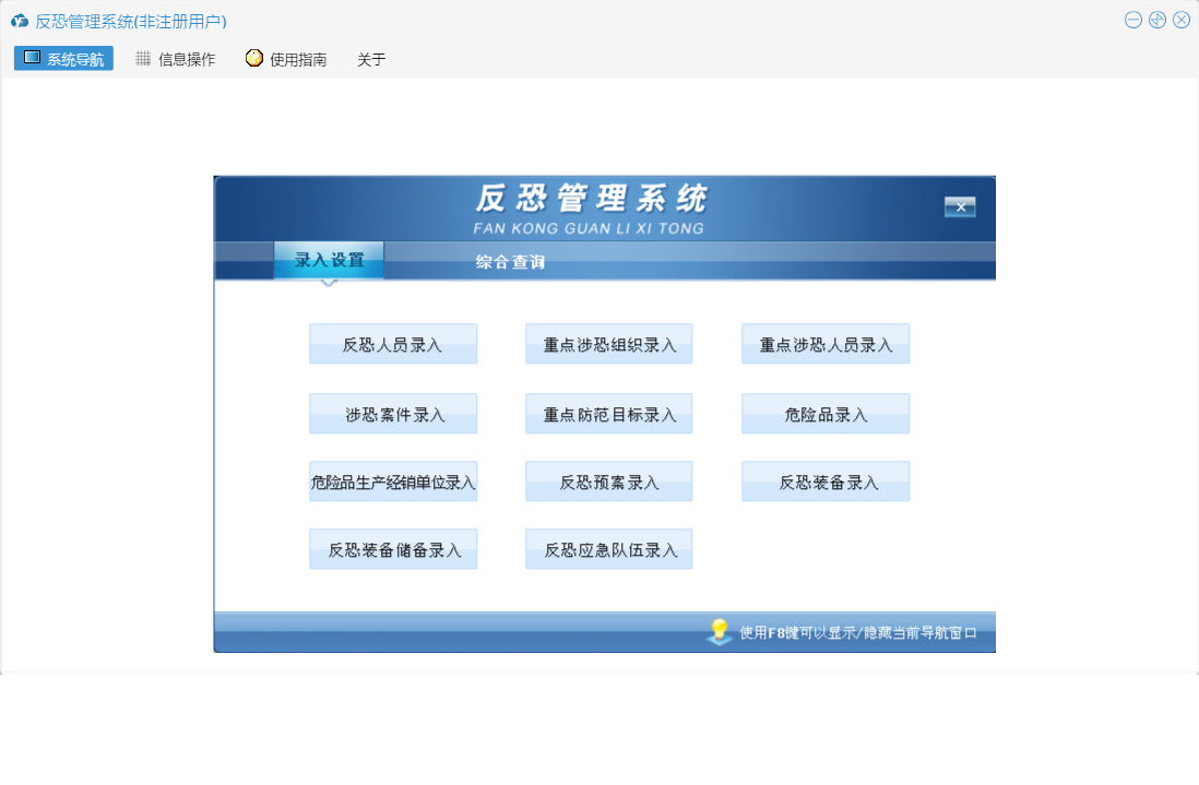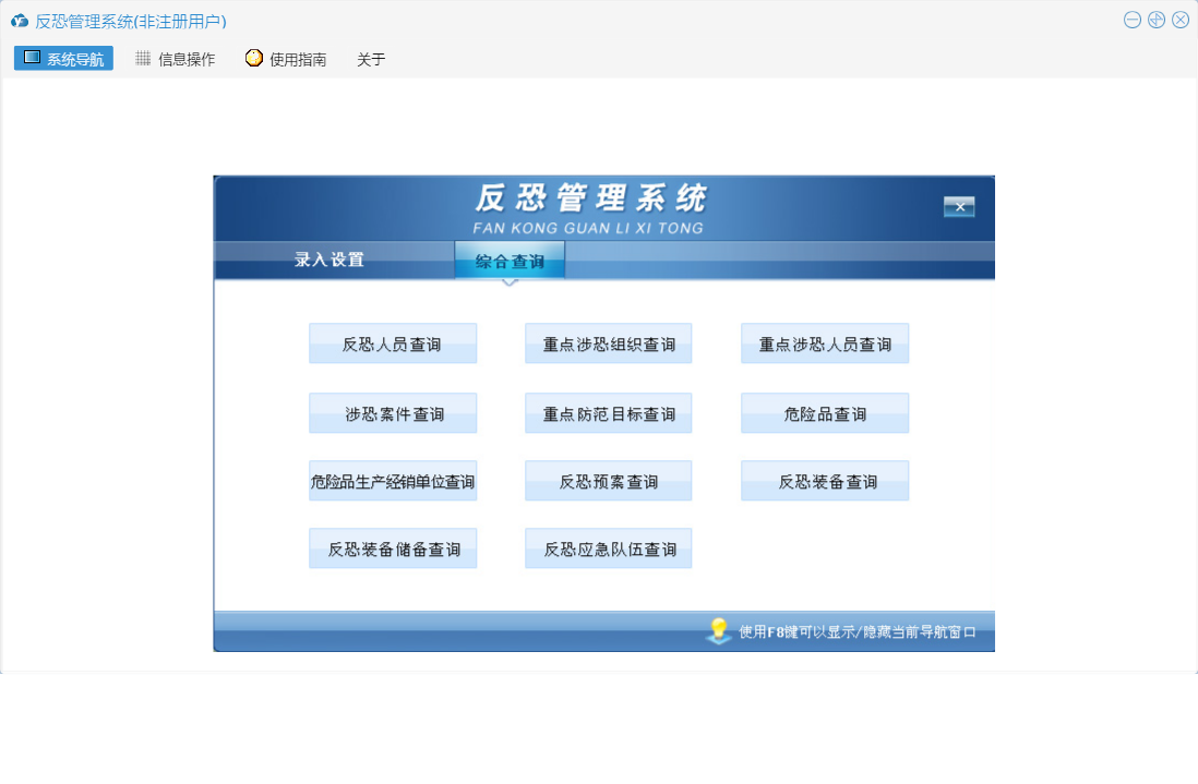反恐管理系统包含以下功能:涉恐案件录入、重点涉恐组织录入、危险品生产经销单位录入、反恐装备储备录入、反恐装备录入、录入设置、反恐人员录入、日志、反恐预案录入、关于、重点涉恐人员录入、权限设置、综合查询、重点防范目标录入、反恐应急队伍录入、危险品录入等