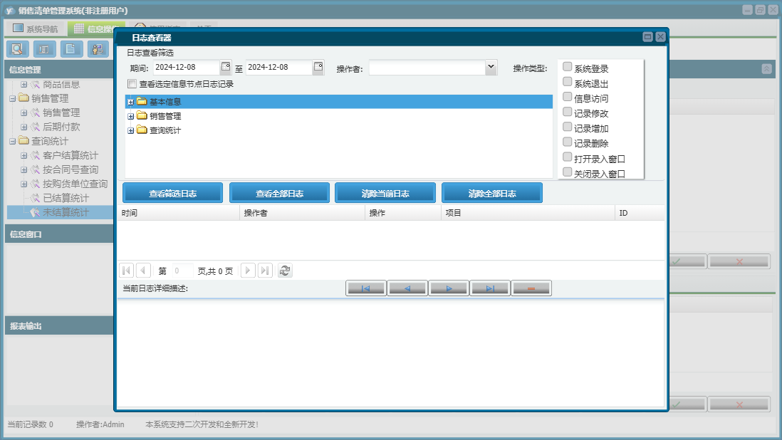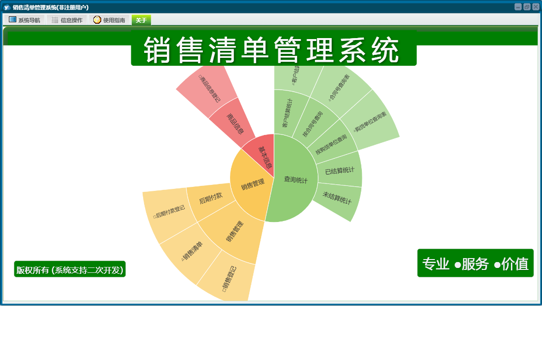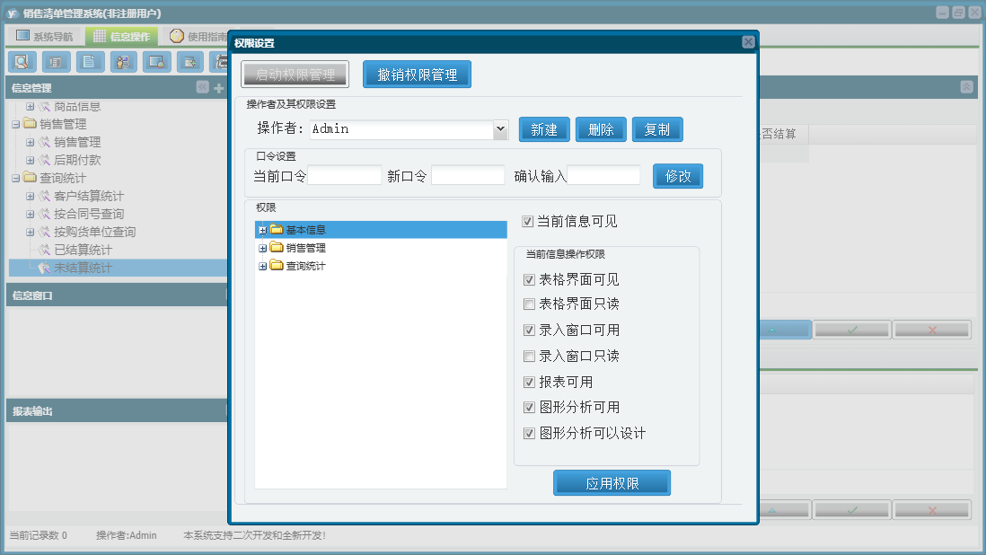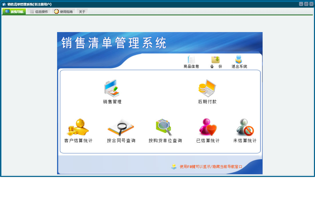 销售清单管理系统包含以下功能:销售管理、商品信息、日志、关于、权限设置、后期付款等