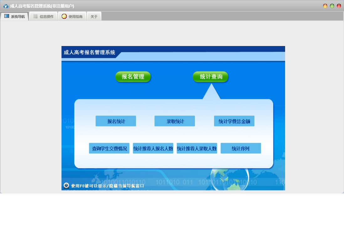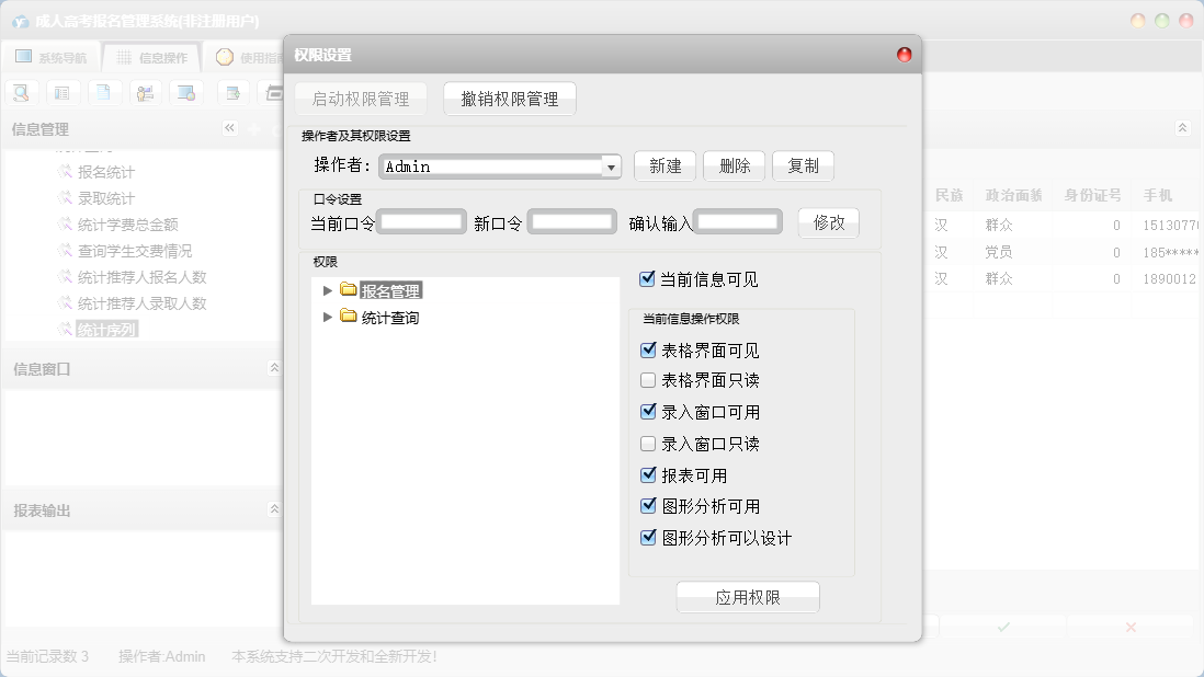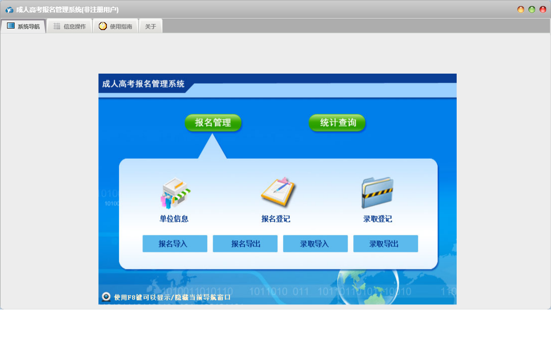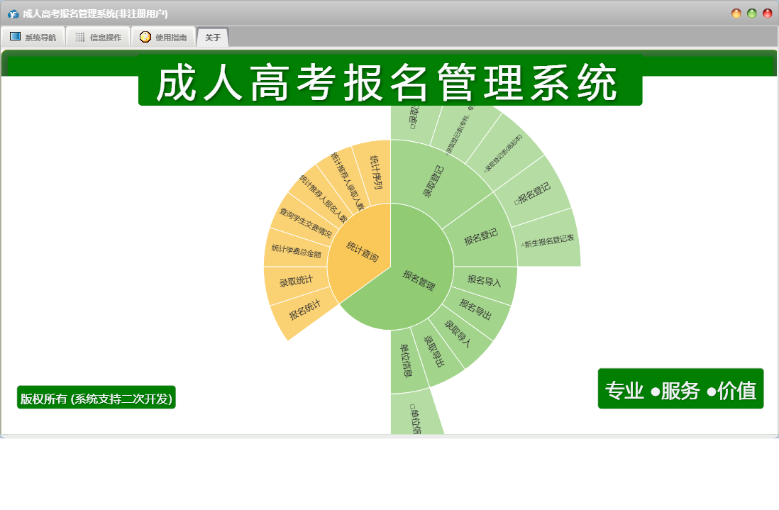 成人高考报名管理系统包含以下功能:单位信息、报名管理、报名登记、日志、关于、权限设置、统计查询、录取登记等