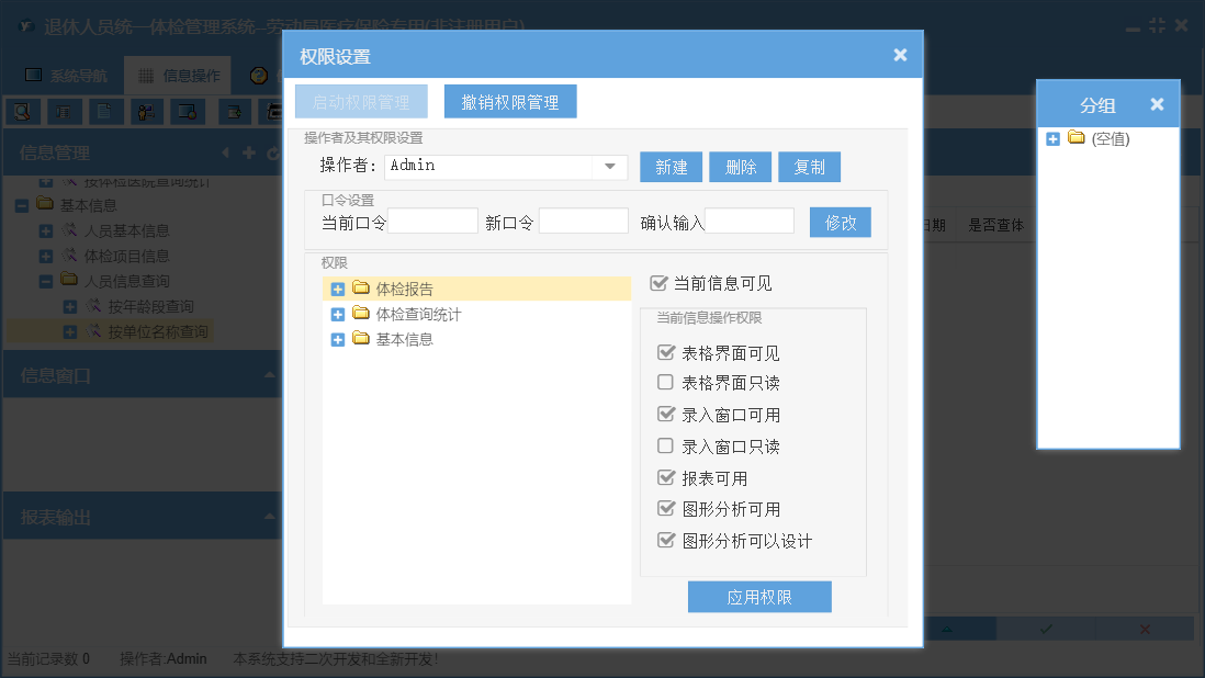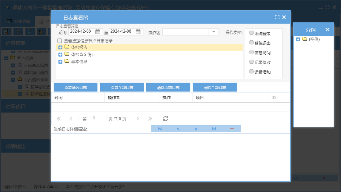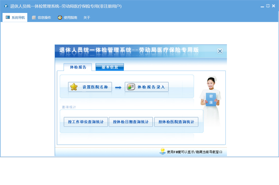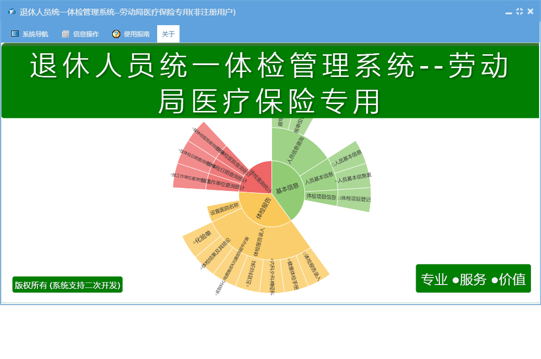 退休人员统一体检管理系统--劳动局医疗保险专用包含以下功能:基础设置、人员基本信息、体检报告录入、体检报告、日志、关于、权限设置、体检项目信息等