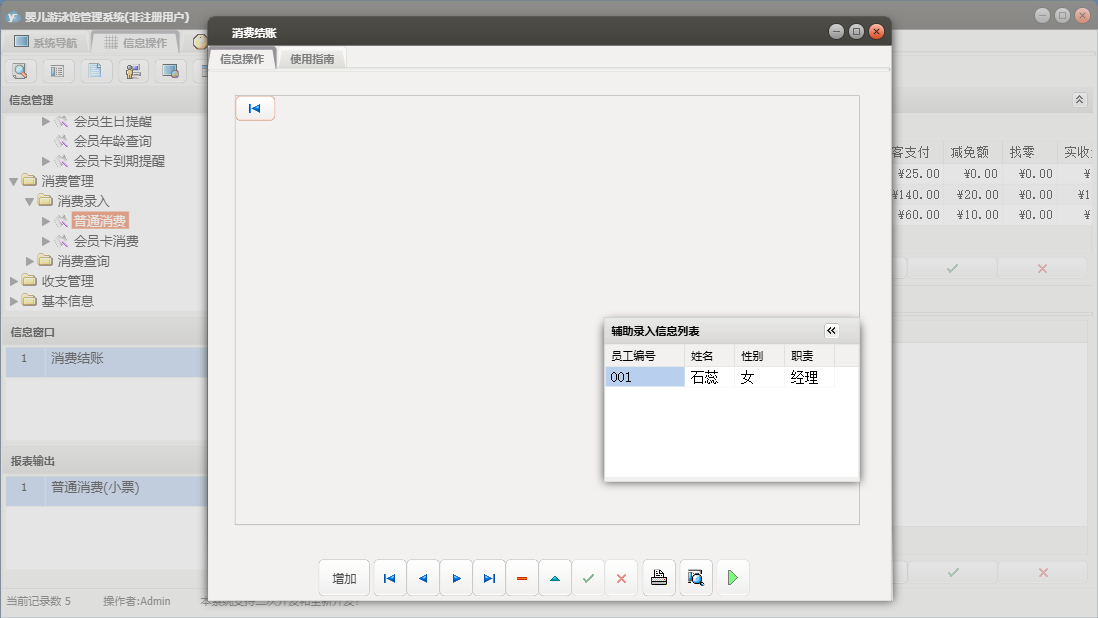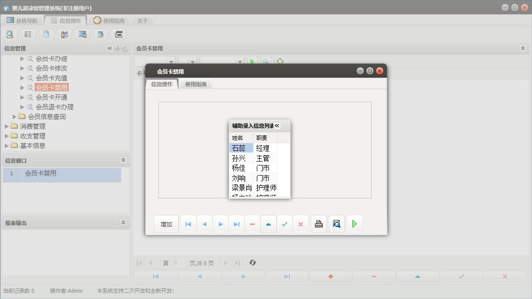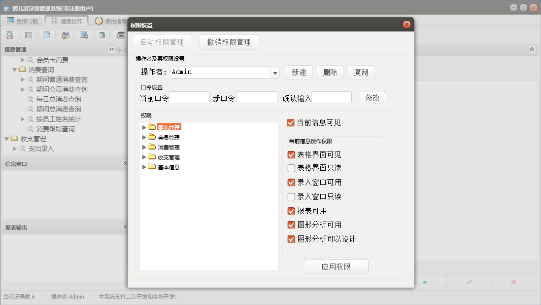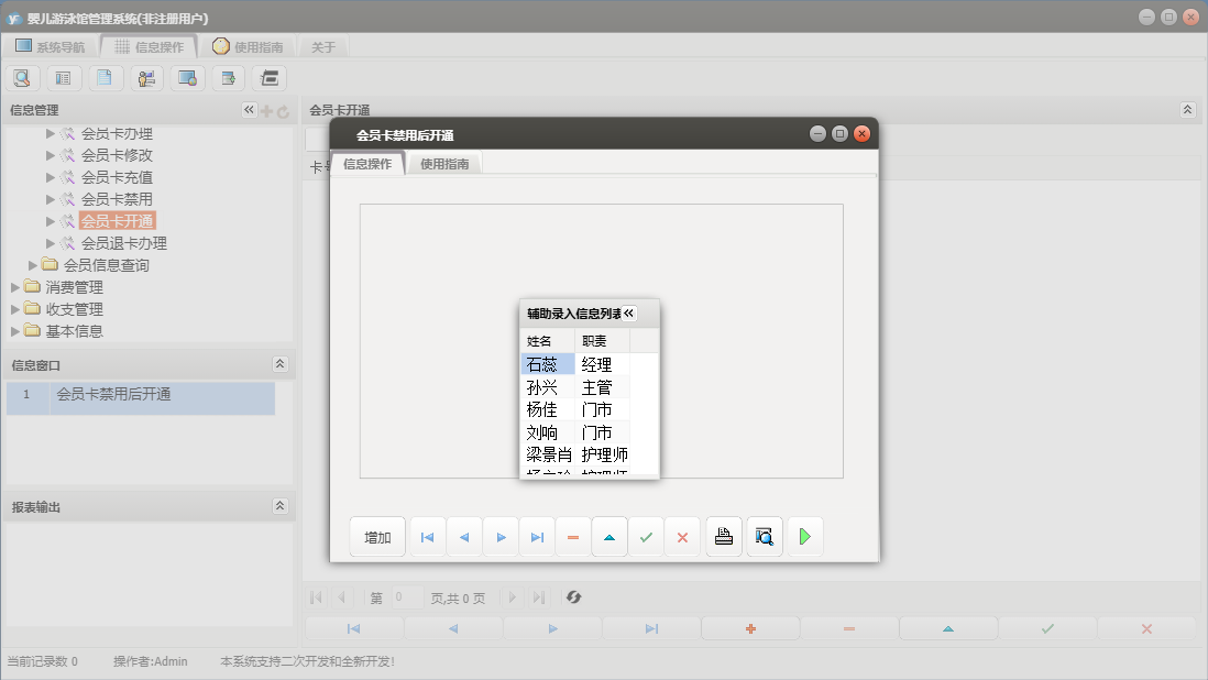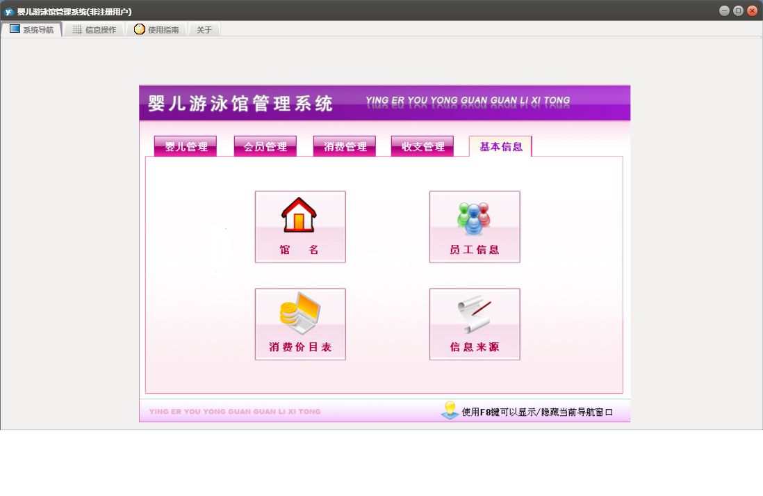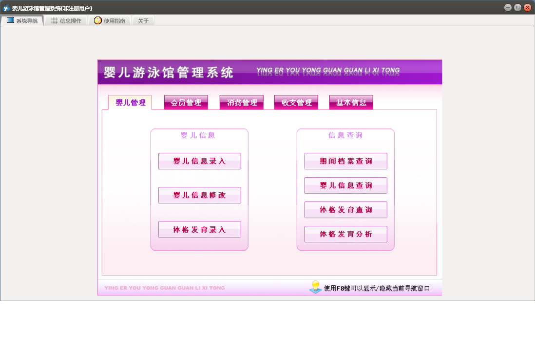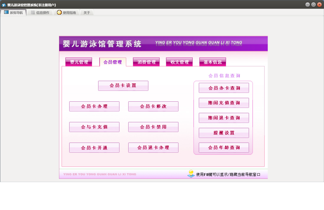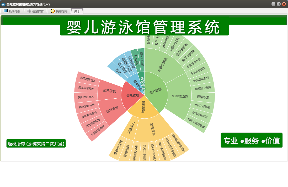 婴儿游泳馆管理系统包含以下功能:消费价目表、收支管理、普通消费、会员卡办理、会员卡开通、体格发育录入、会员生日提醒、会员卡禁用、婴儿信息修改、权限设置、会员卡修改、体格发育查询、婴儿信息录入、会员卡到期提醒、关于、会员卡消费、基本信息、消费管理、馆名、会员卡设置、会员卡充值、婴儿管理、会员管理、支出录入、员工信息、日志、会员退卡办理、信息来源等