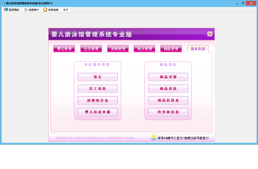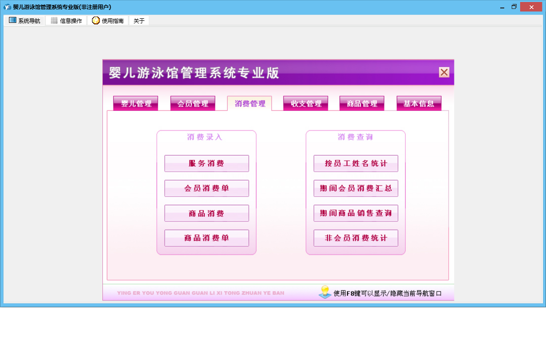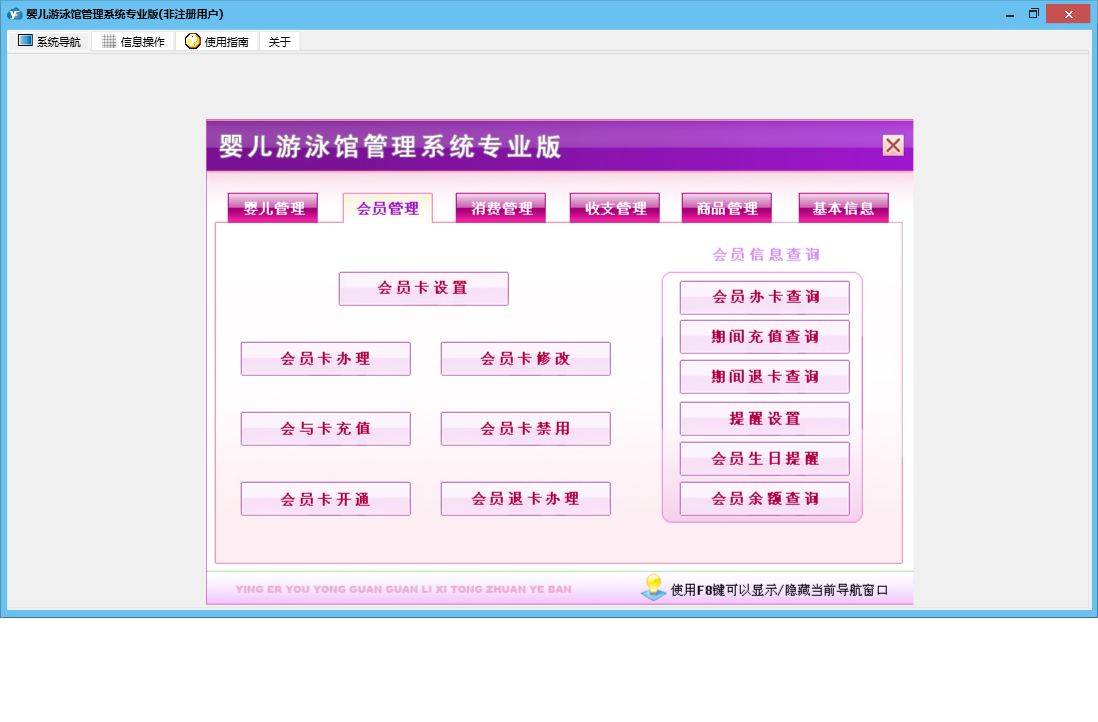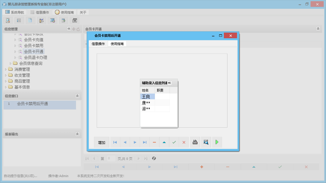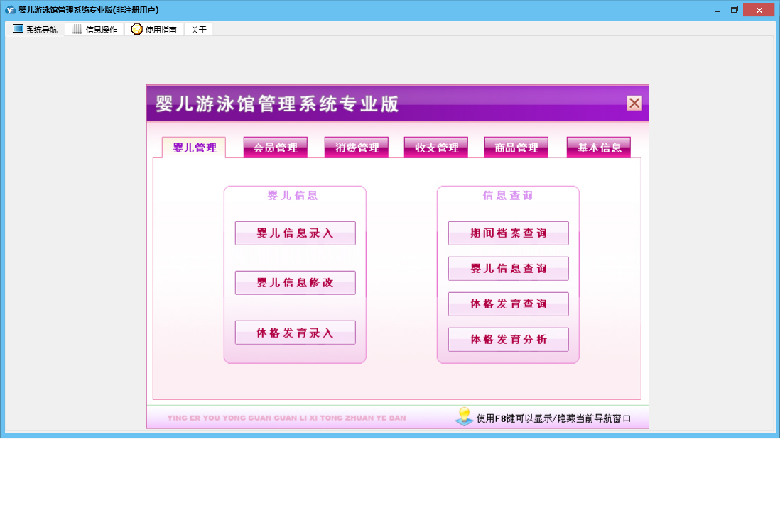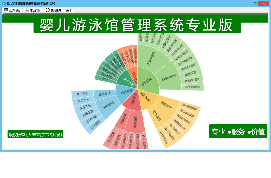 婴儿游泳馆管理系统专业版包含以下功能:收支管理、会员卡办理、会员卡开通、体格发育录入、商品信息、商品类别、会员卡禁用、婴儿信息修改、权限设置、会员卡修改、进货登记、本店退货、体格发育查询、婴儿信息录入、服务消费、每日汇总、客户退货、关于、基本信息、商品消费、消费管理、会员卡设置、会员卡充值、商品管理、婴儿管理、会员管理、商品报损、支出录入、员工信息、供货商信息、日志、会员退卡办理等