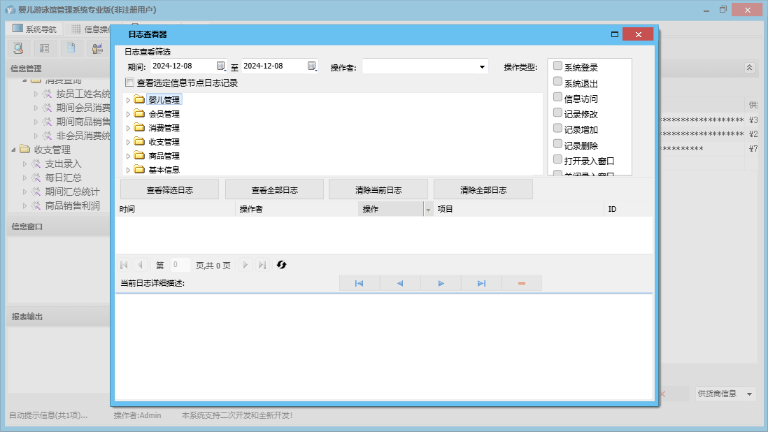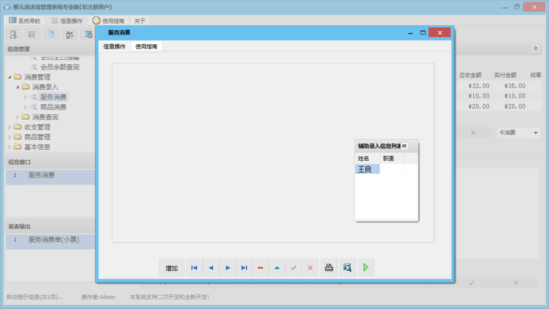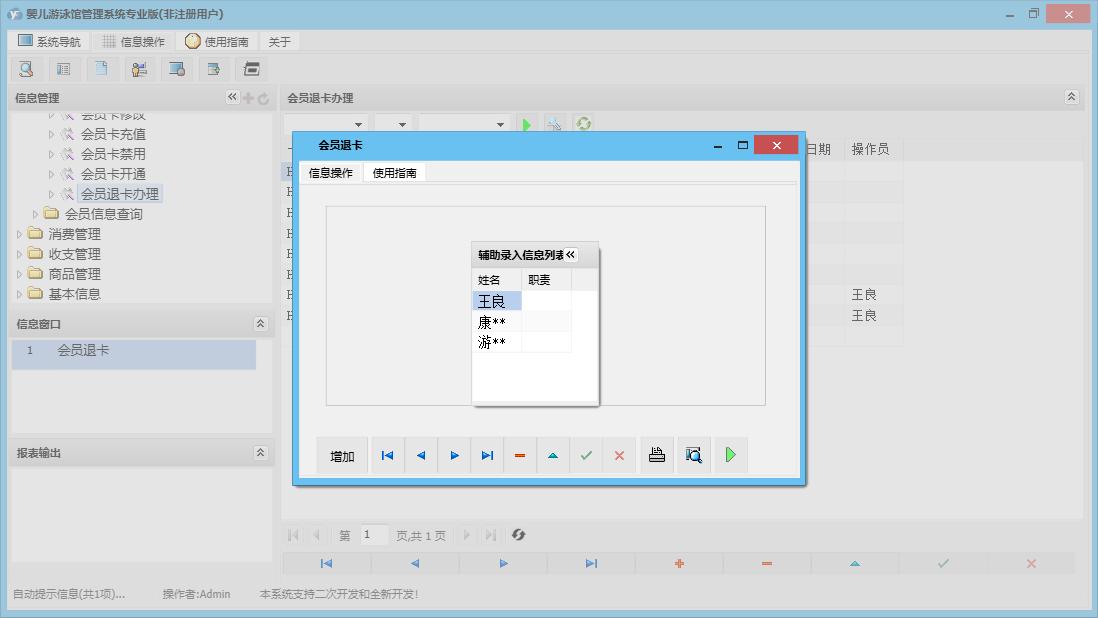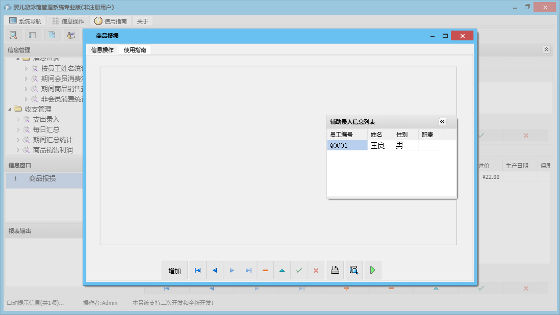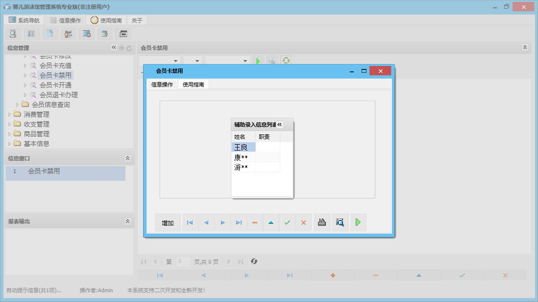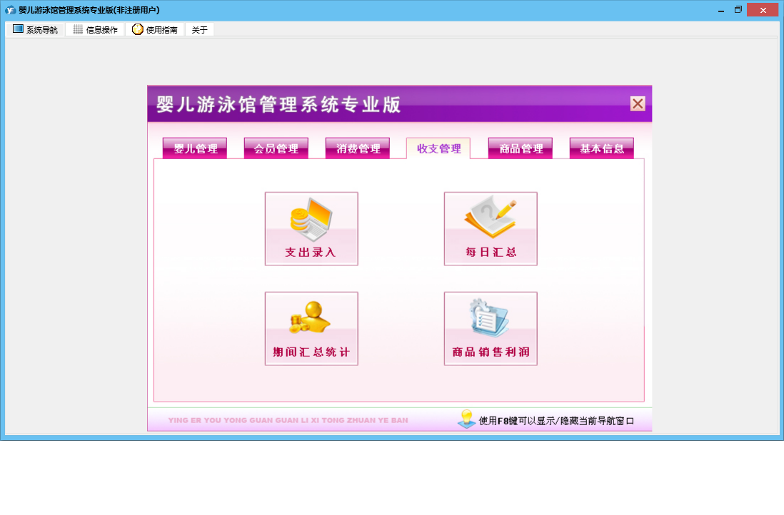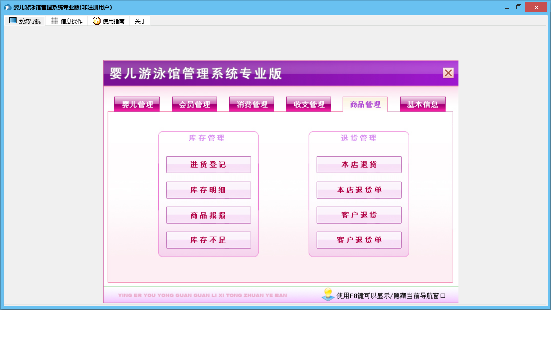 婴儿游泳馆管理系统专业版包含以下功能:收支管理、会员卡办理、会员卡开通、体格发育录入、商品信息、商品类别、会员卡禁用、婴儿信息修改、权限设置、会员卡修改、进货登记、本店退货、体格发育查询、婴儿信息录入、服务消费、每日汇总、客户退货、关于、基本信息、商品消费、消费管理、会员卡设置、会员卡充值、商品管理、婴儿管理、会员管理、商品报损、支出录入、员工信息、供货商信息、日志、会员退卡办理等