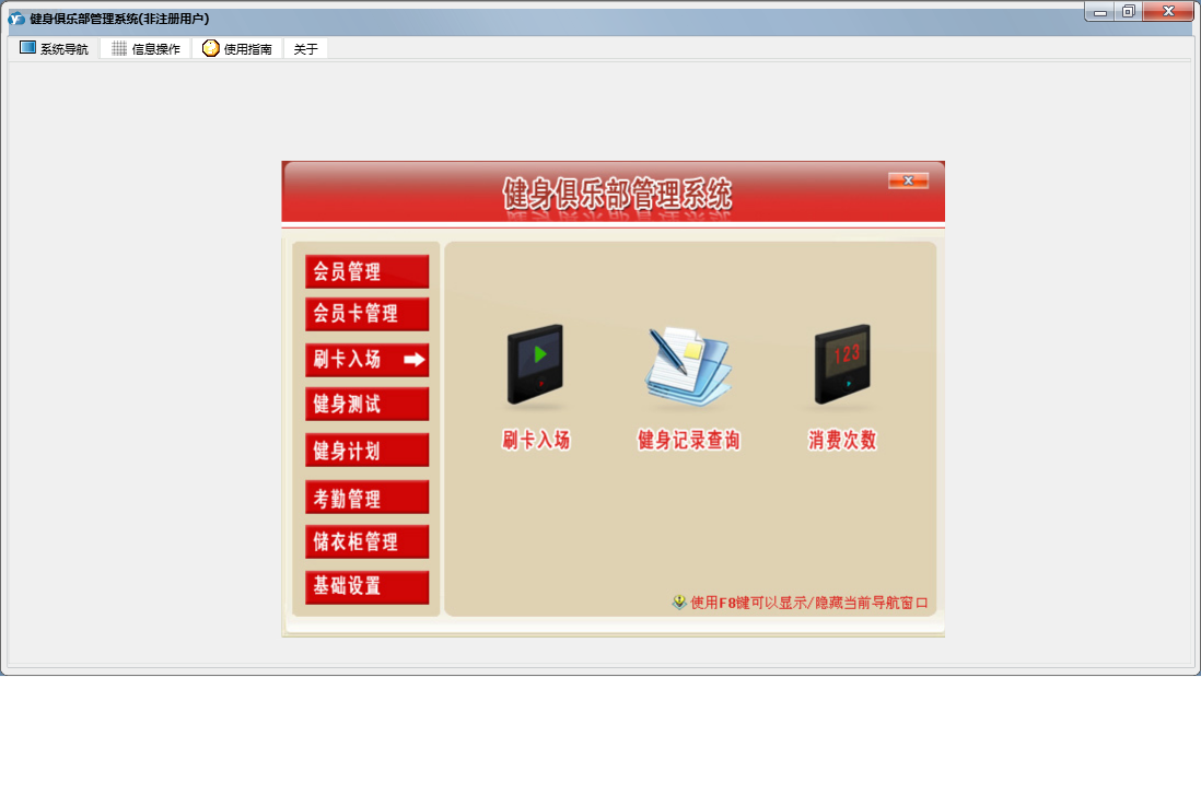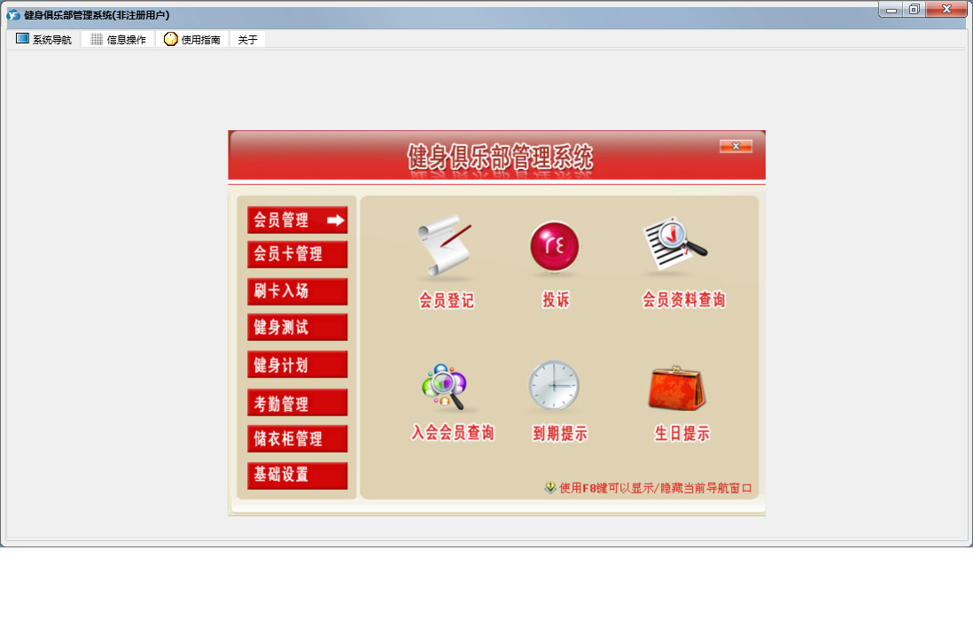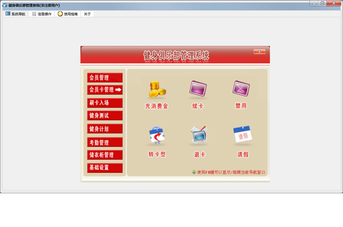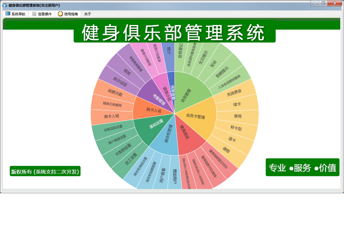 健身俱乐部管理系统包含以下功能:刷卡入场、退卡、续卡、考勤管理、请假、充消费金、卡类别设置、员工设置、基础数据、考勤数据整理、权限设置、储衣柜类别设置、转卡型、排班、客户渠道设置、训练项目设置、健身测试、关于、会员卡管理、班次设定、会员登记、会员资料查询及修改、健身计划、会员管理、储衣柜管理、禁用、日志、增加用户、投诉等