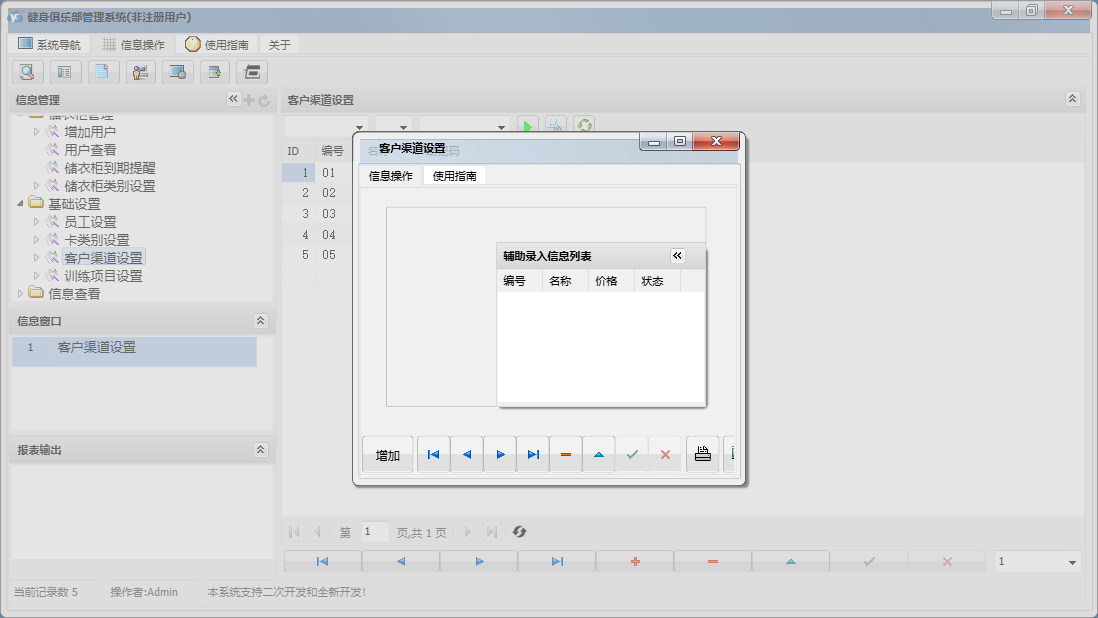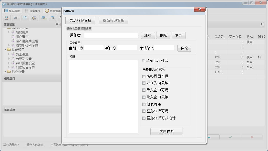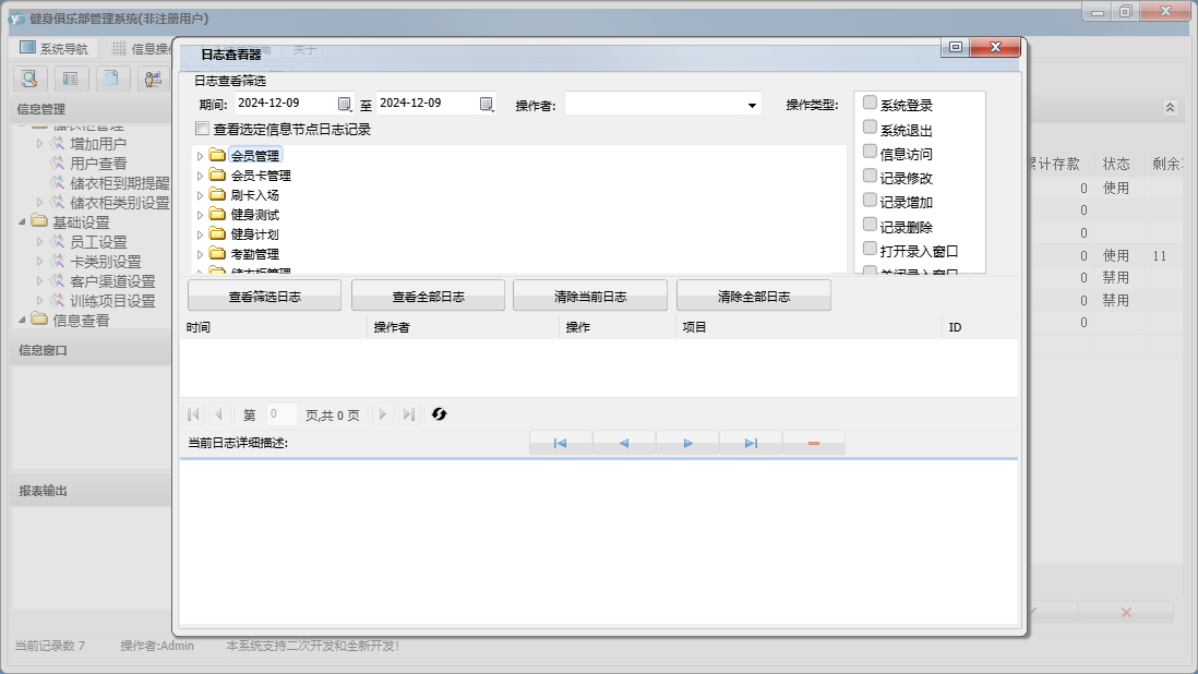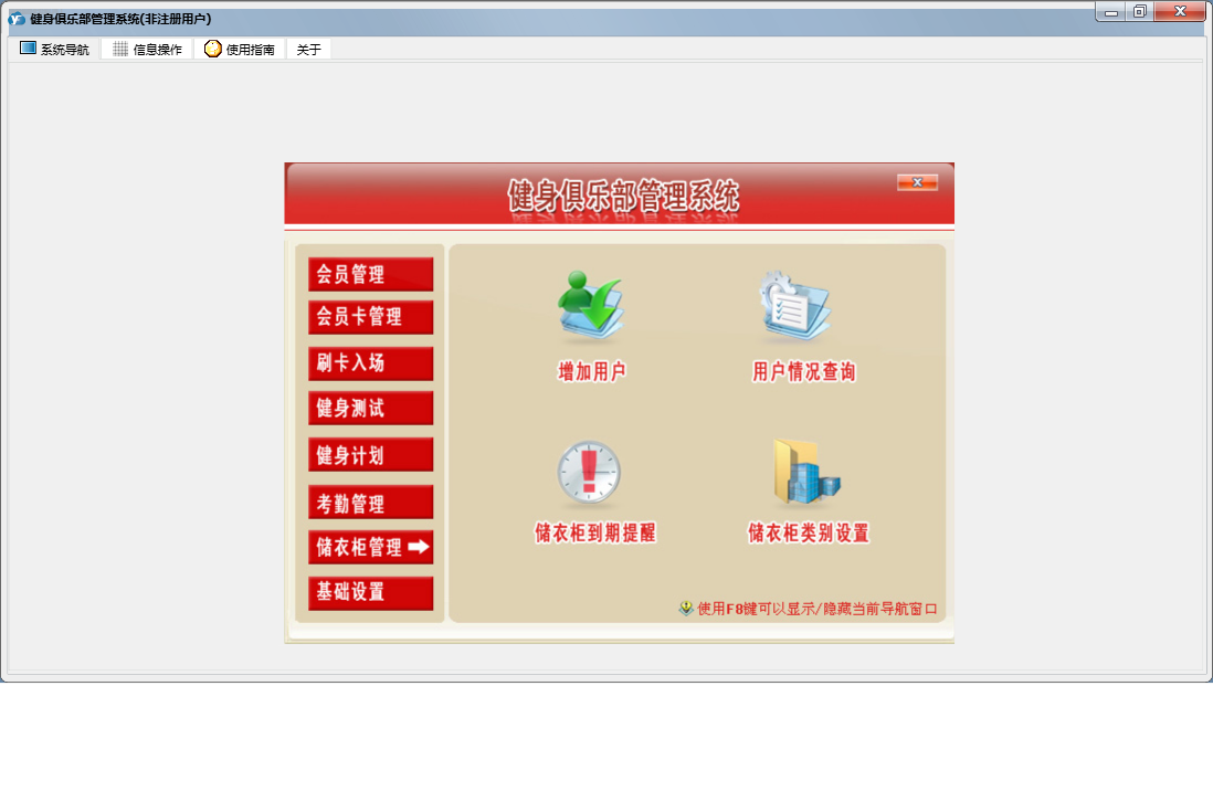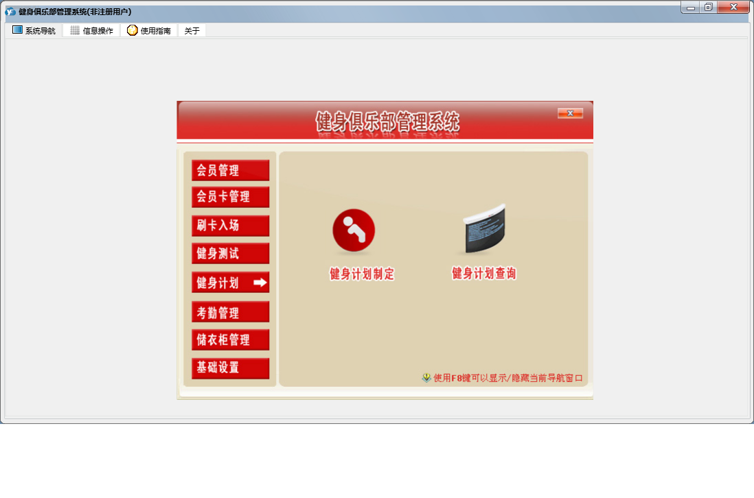 健身俱乐部管理系统包含以下功能:刷卡入场、退卡、续卡、考勤管理、请假、充消费金、卡类别设置、员工设置、基础数据、考勤数据整理、权限设置、储衣柜类别设置、转卡型、排班、客户渠道设置、训练项目设置、健身测试、关于、会员卡管理、班次设定、会员登记、会员资料查询及修改、健身计划、会员管理、储衣柜管理、禁用、日志、增加用户、投诉等