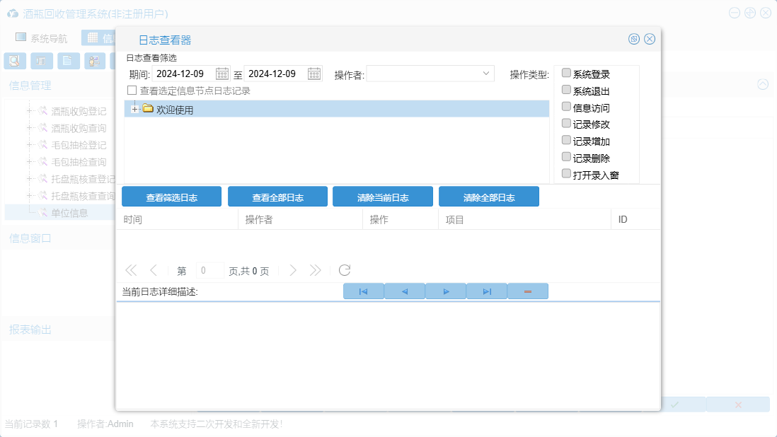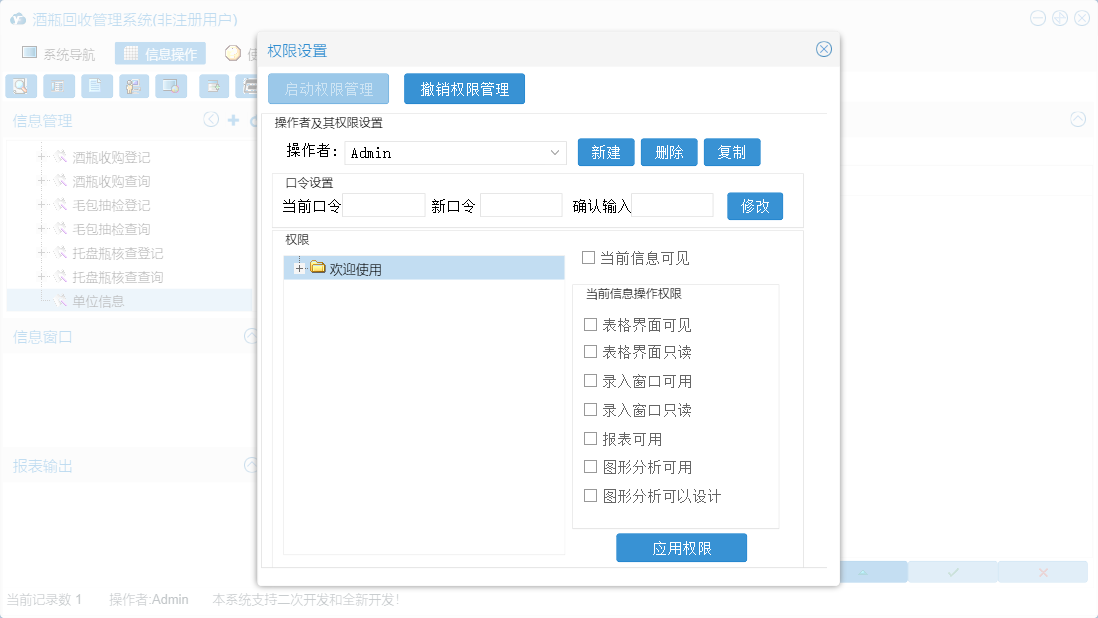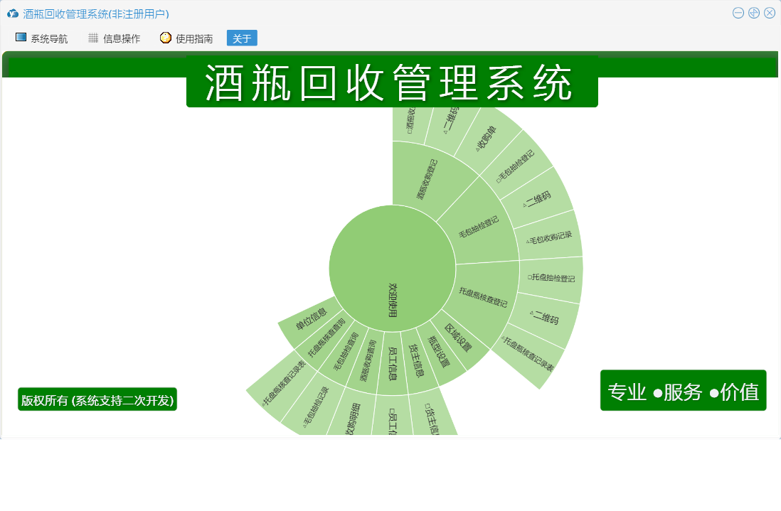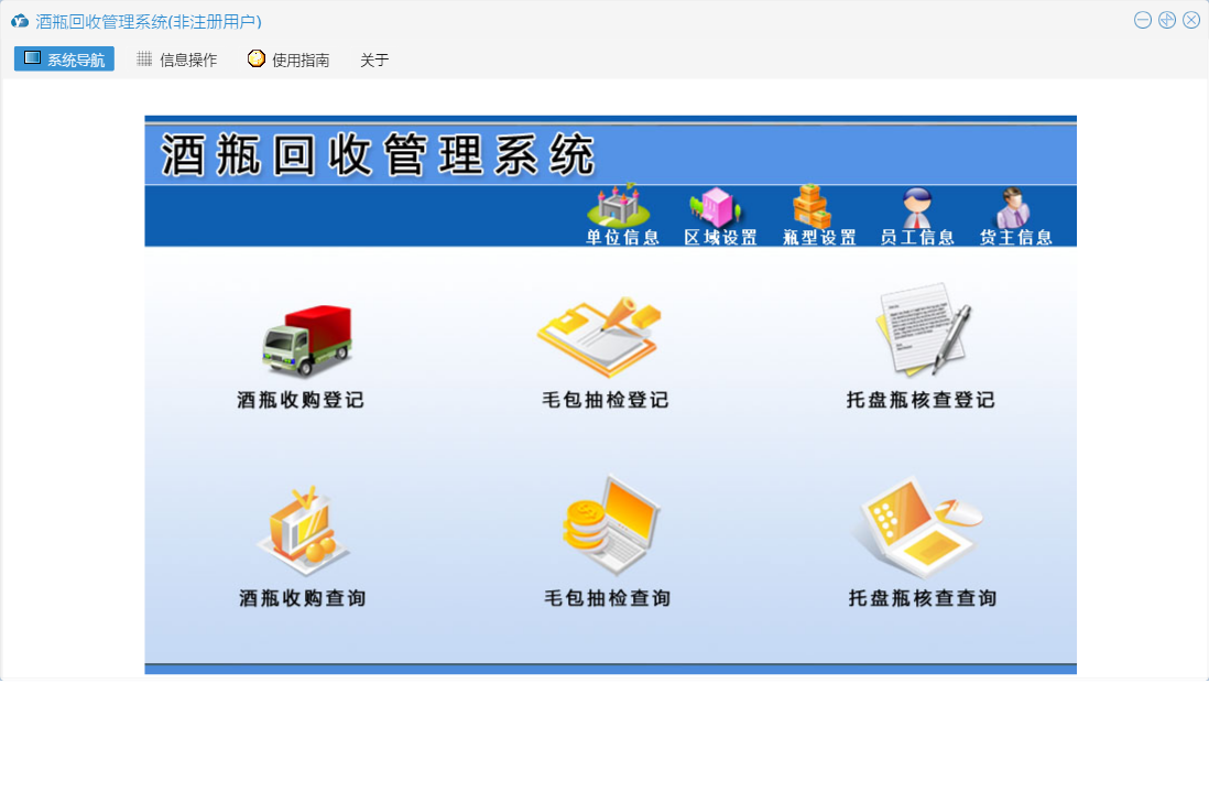 酒瓶回收管理系统包含以下功能:毛包抽检登记、面板、托盘瓶核查登记、酒瓶收购登记、货主信息、员工信息、日志、关于、权限设置等