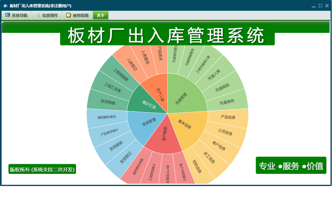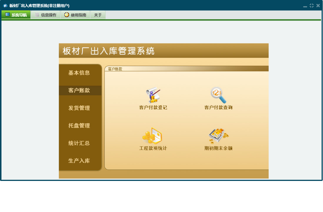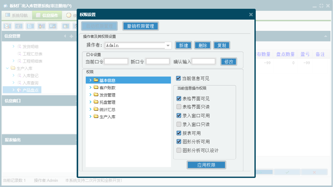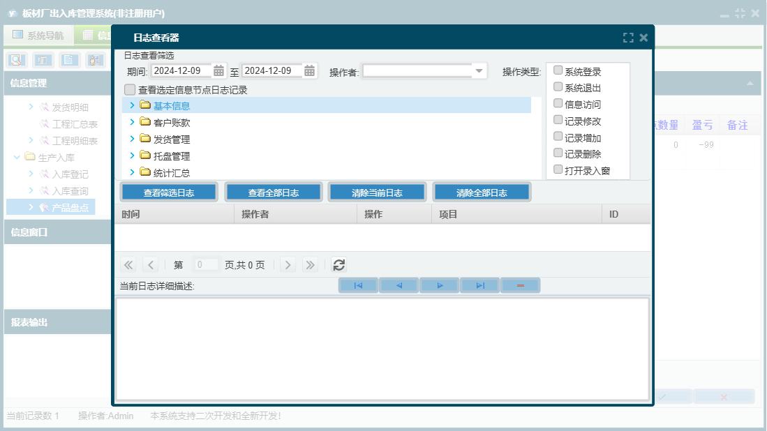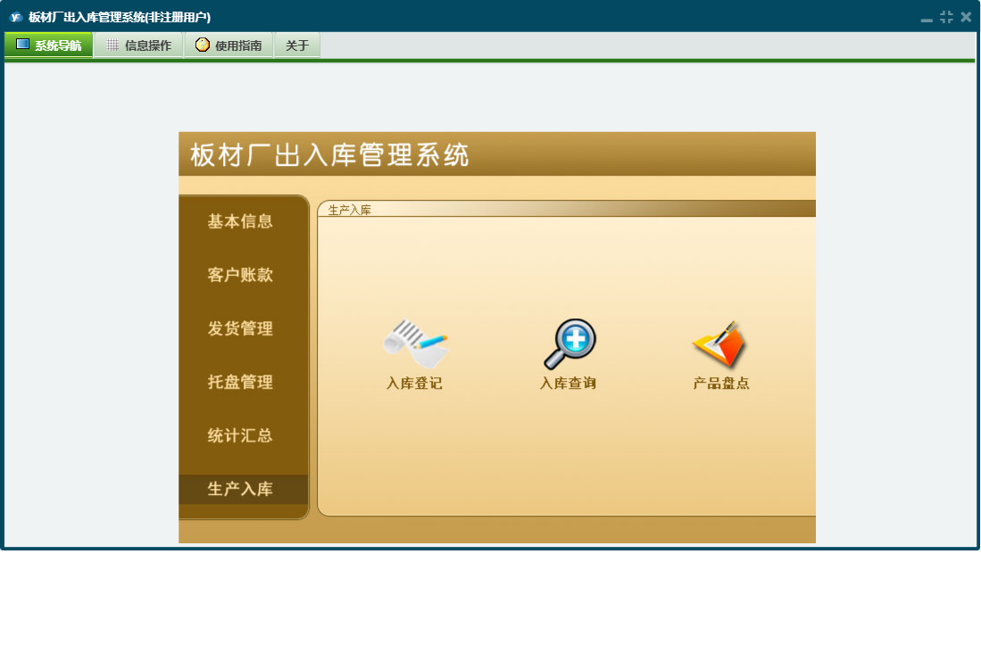 板材厂出入库管理系统包含以下功能:托盘入库、产品信息、发货登记、产品盘点、统计汇总、入库登记、公司信息、权限设置、客户付款登记、托盘返还登记、托盘报损、关于、基本信息、托盘管理、客户信息、发货管理、生产入库、司机信息、员工信息、日志、客户账款等