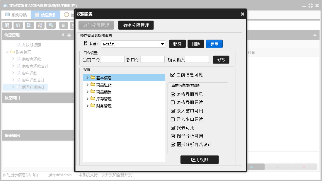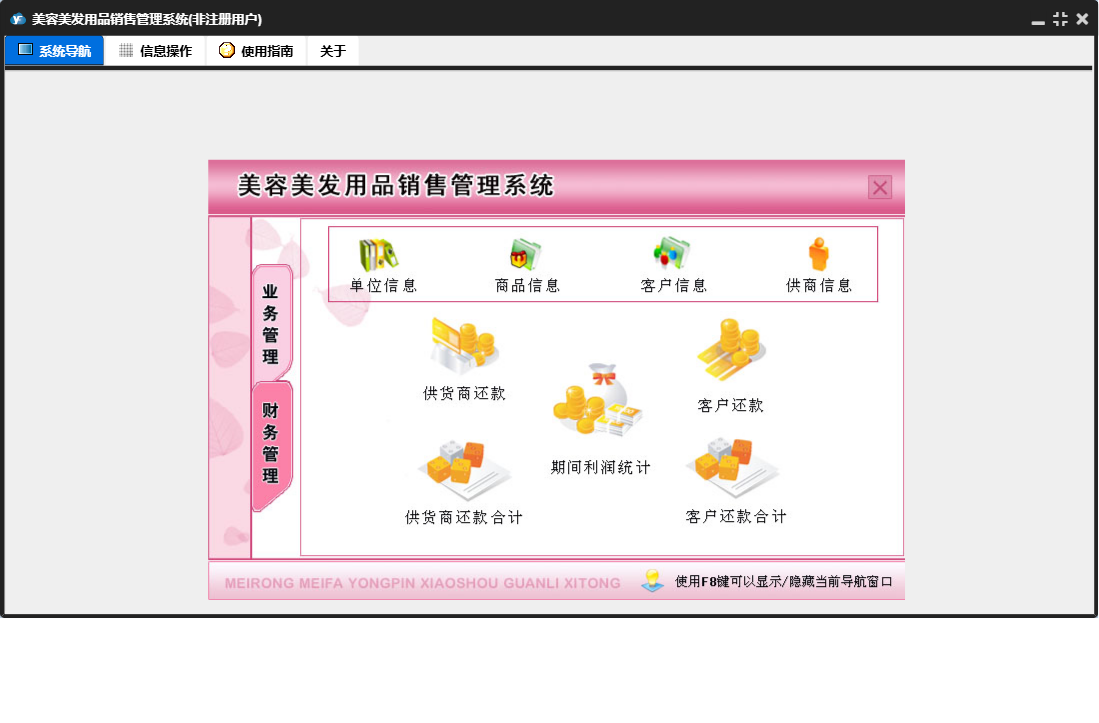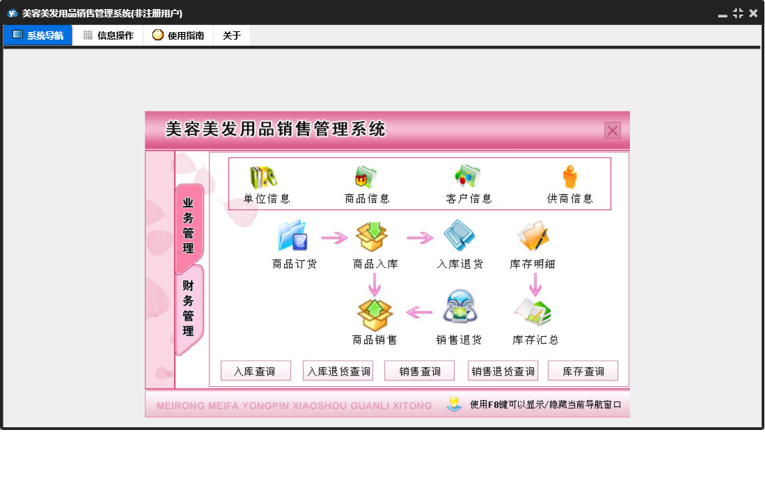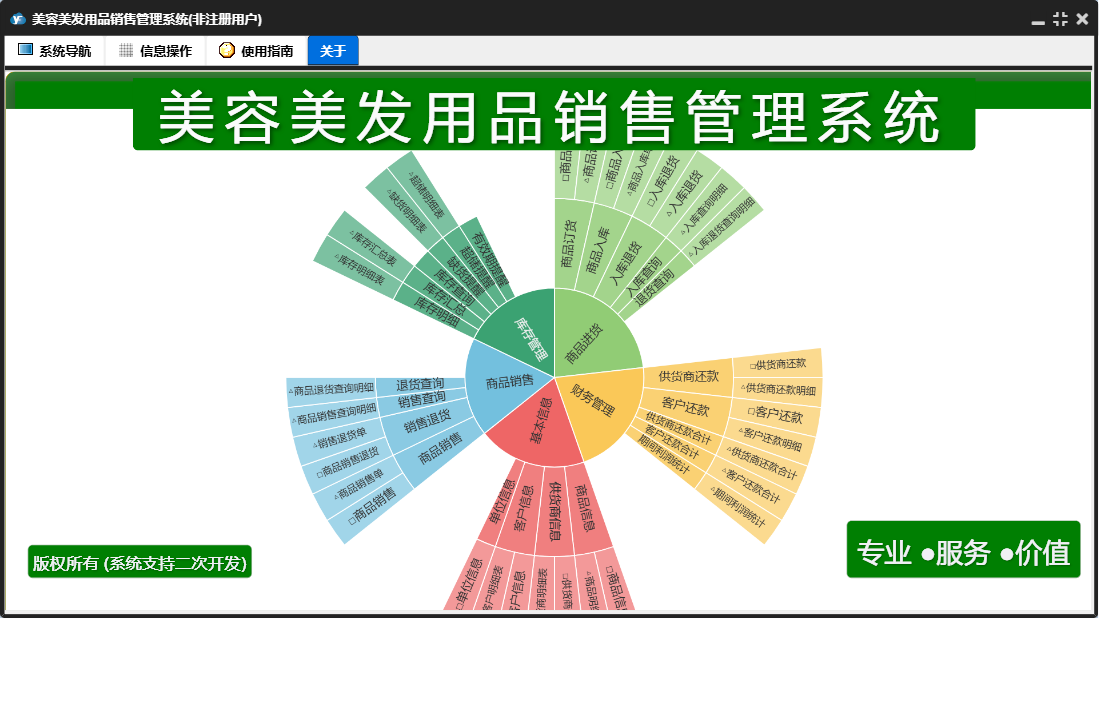 美容美发用品销售管理系统包含以下功能:商品入库、入库退货、商品销售、供货商还款、单位信息、商品信息、销售退货、供货商信息、日志、关于、商品订货、权限设置、客户信息、财务管理、客户还款、业务管理等