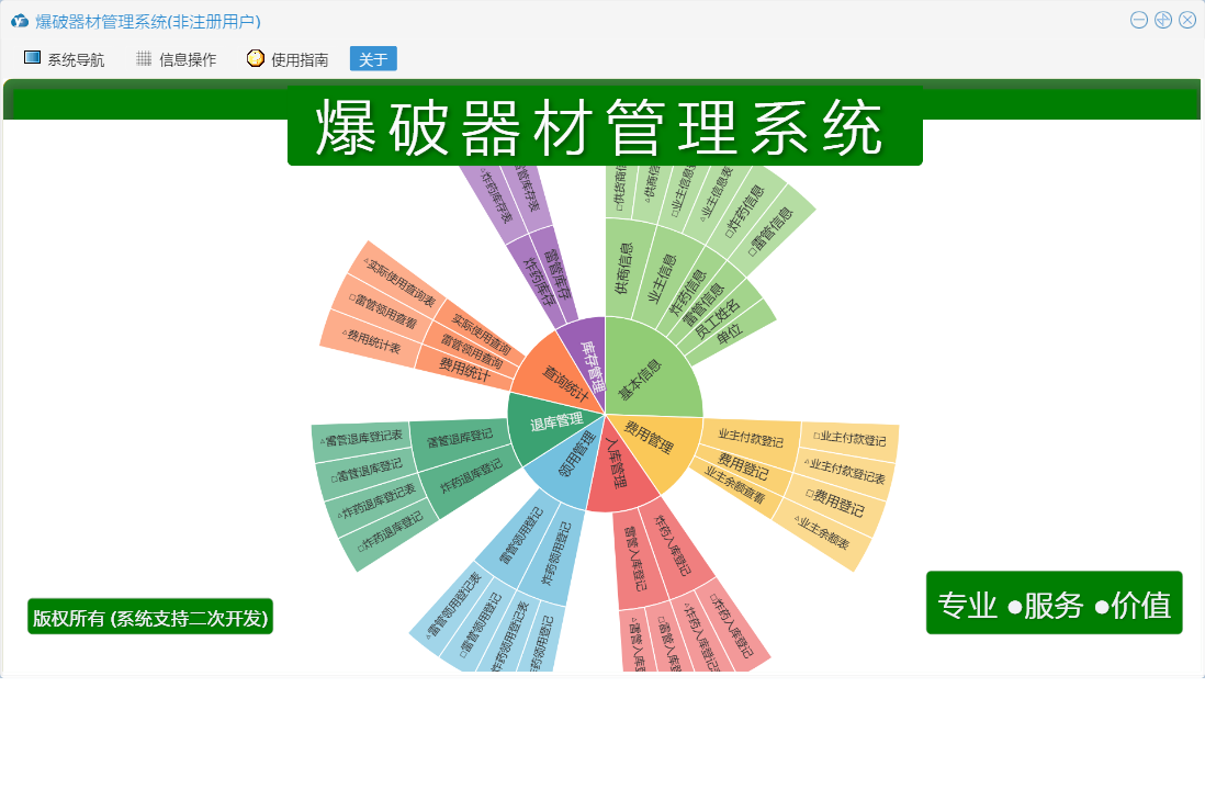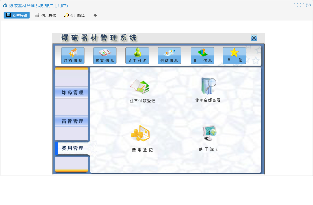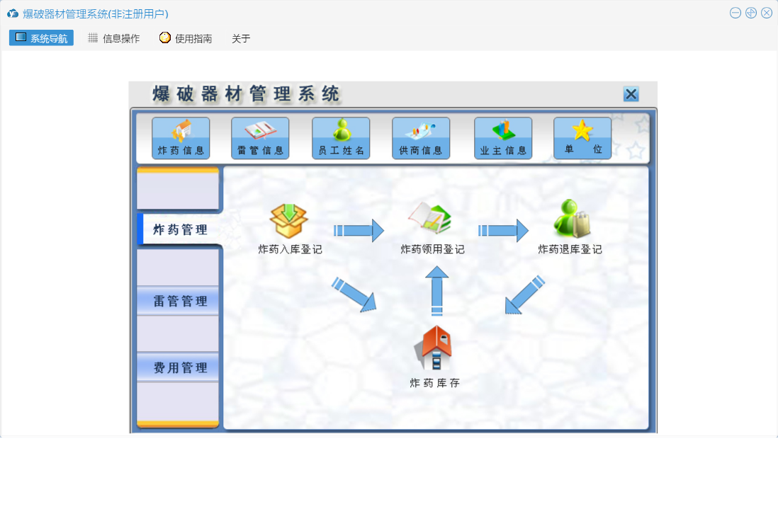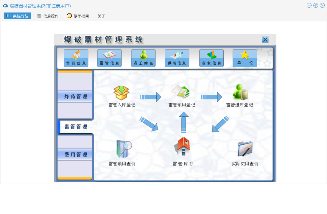 爆破器材管理系统包含以下功能:雷管退库登记、雷管信息、费用登记、业主付款登记、炸药退库登记、炸药领用登记、炸药入库登记、雷管入库登记、炸药管理、雷管领用登记、权限设置、费用管理、雷管管理、关于、业主信息、日志、炸药信息、雷管领用查询、供商信息等