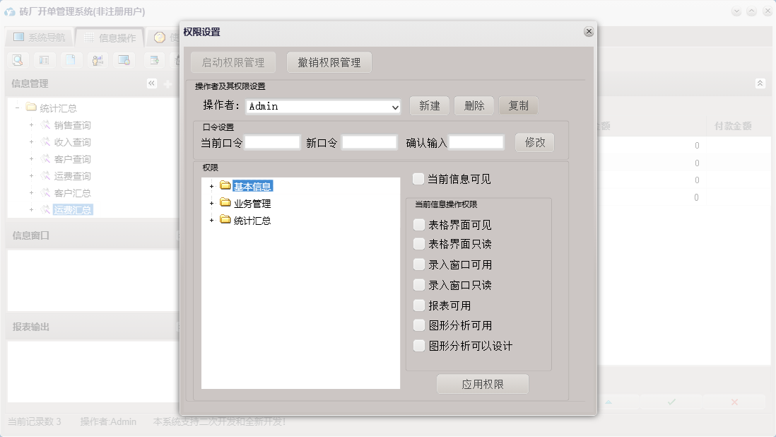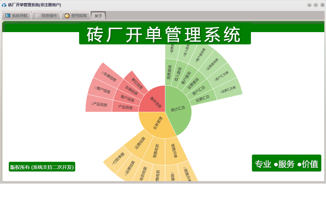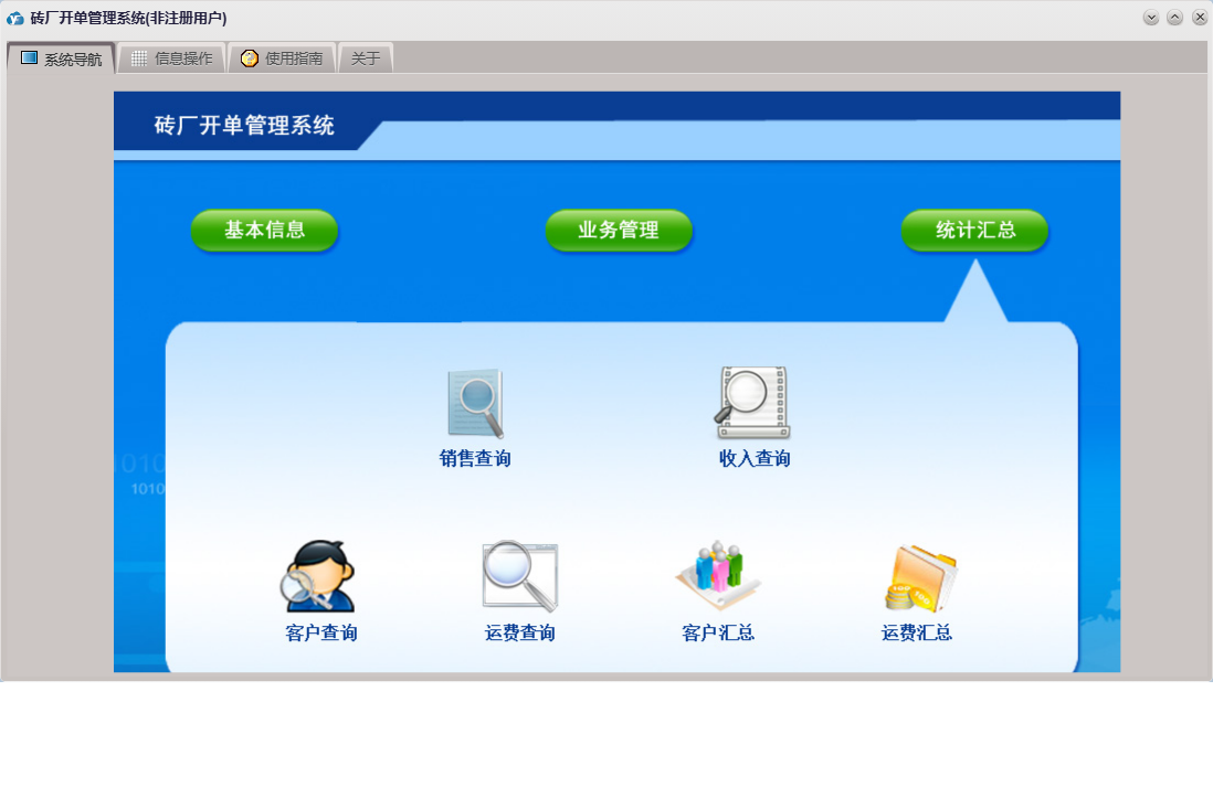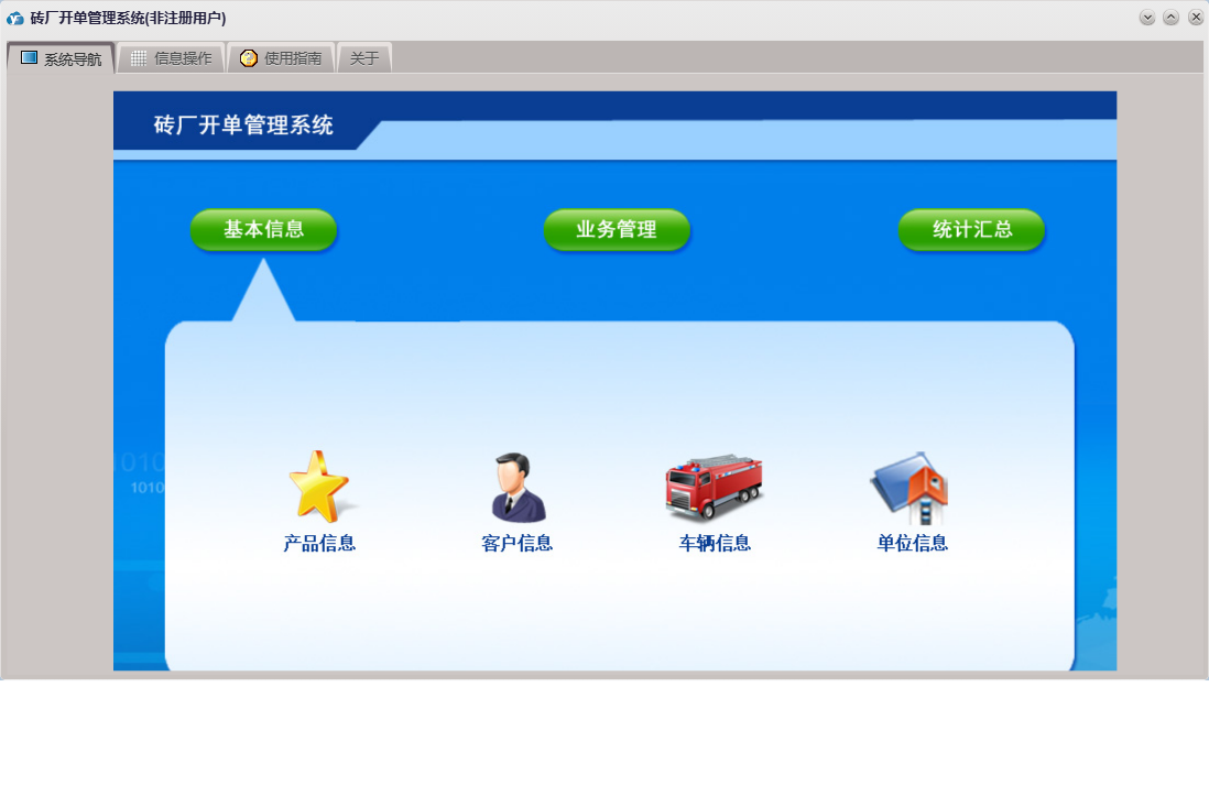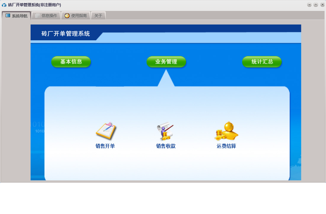 砖厂开单管理系统包含以下功能:运费结算、销售开单、日志、销售收款、关于、权限设置、基本信息、统计汇总、产品信息、客户信息、业务管理、车辆信息等