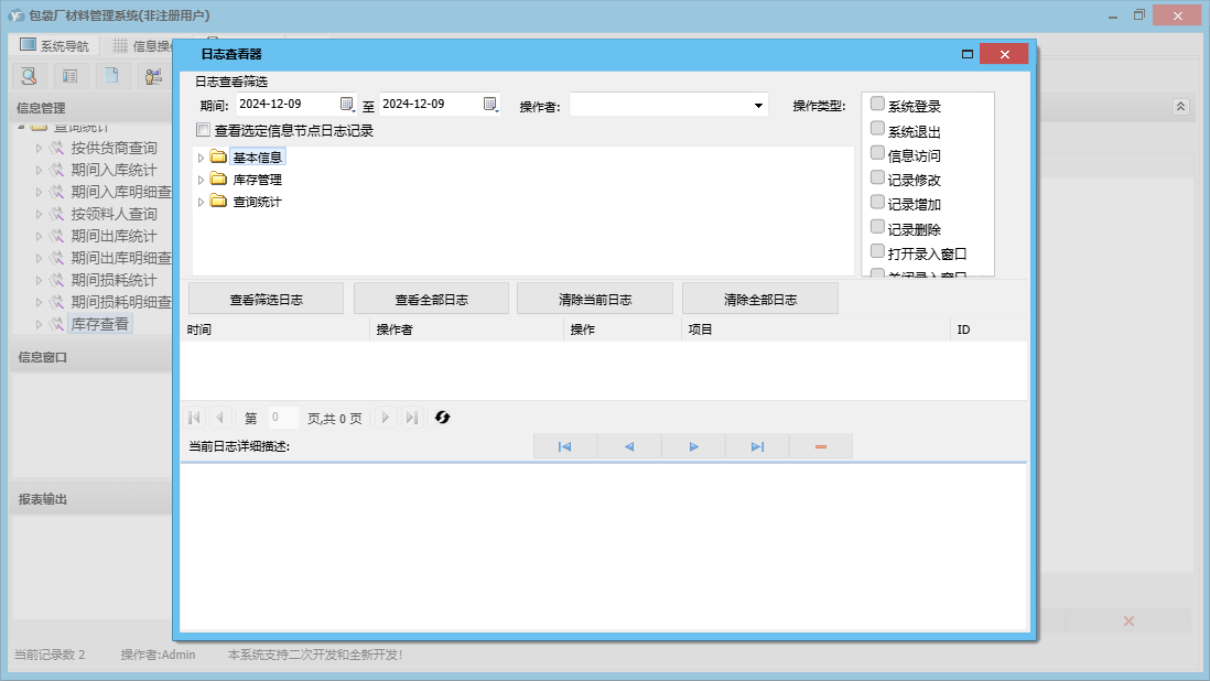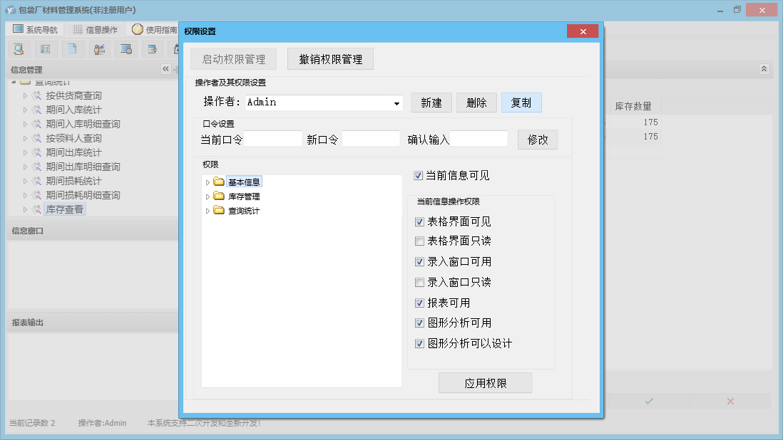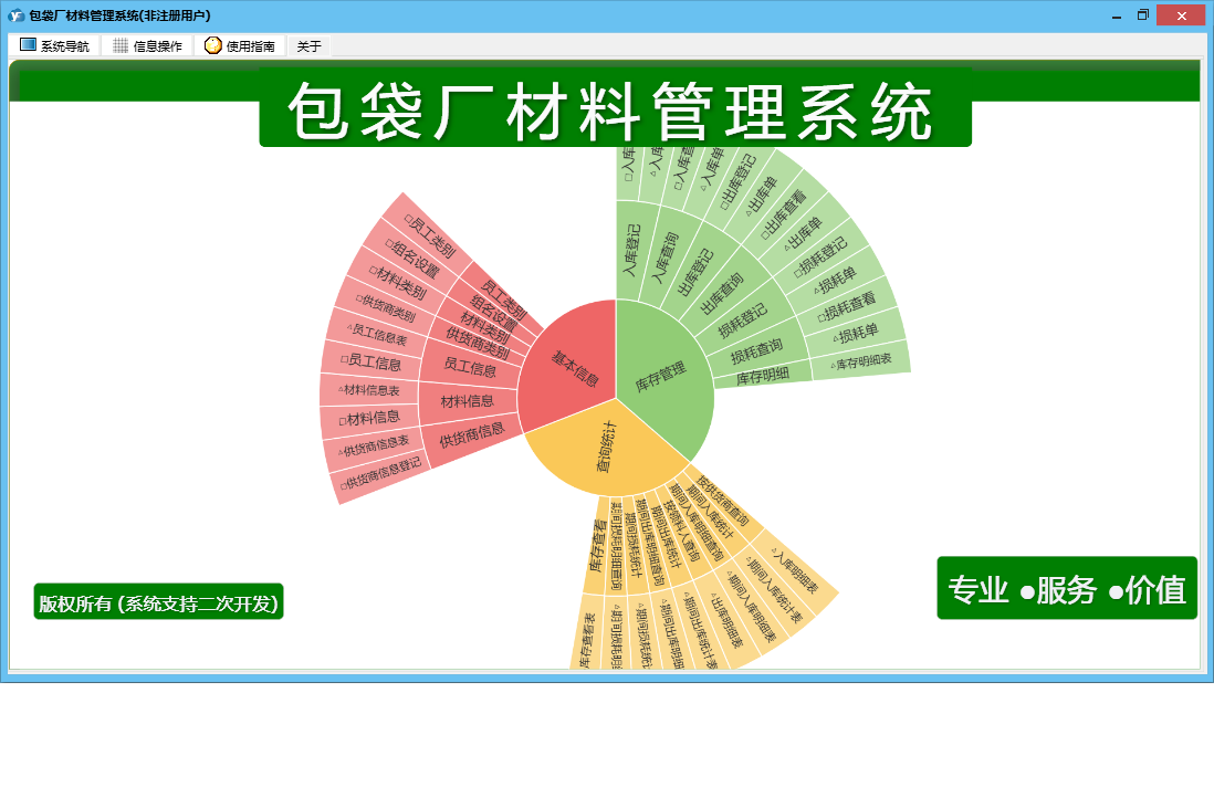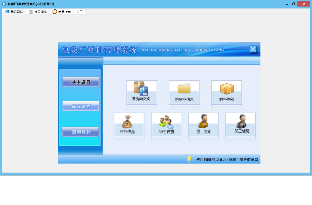 包袋厂材料管理系统包含以下功能:查询统计、基本设置、出库登记、入库查询、入库登记、材料信息、损耗查询、权限设置、组名设置、损耗登记、出库查询、库存管理、关于、供货商类别、员工信息、供货商信息、日志、材料类别、员工类别等