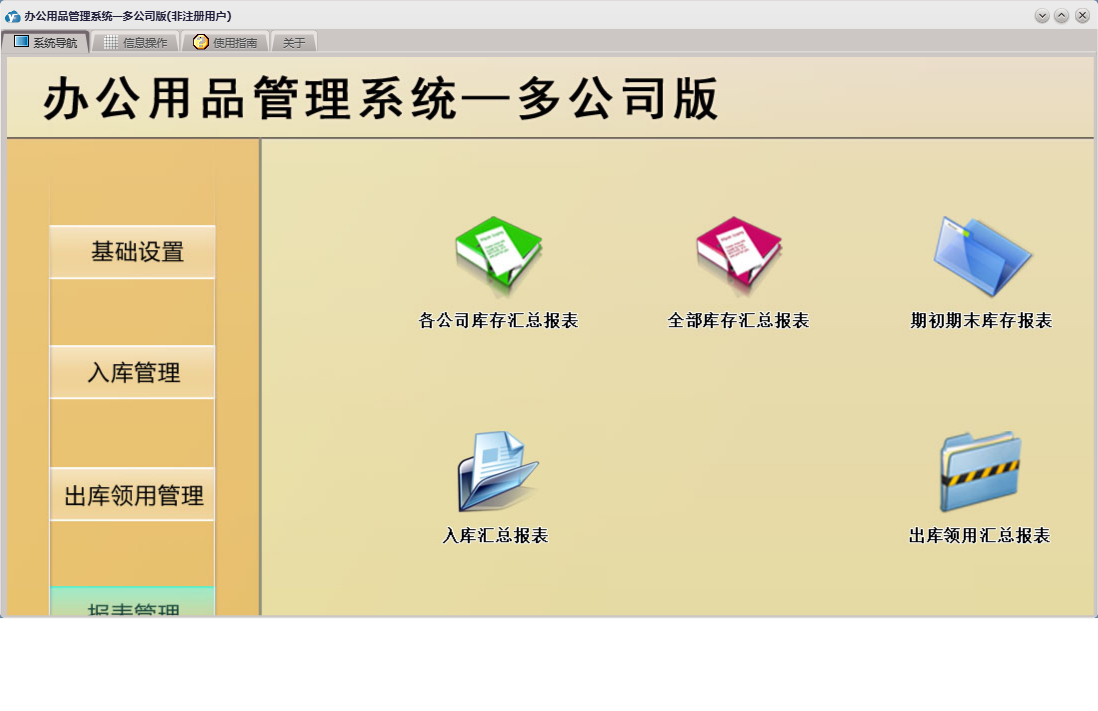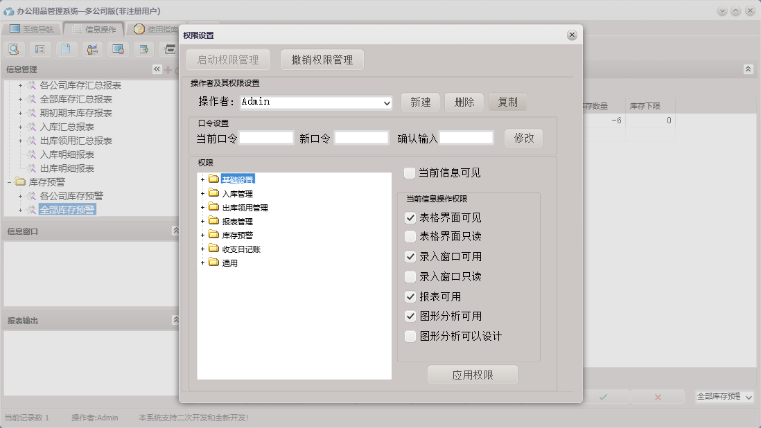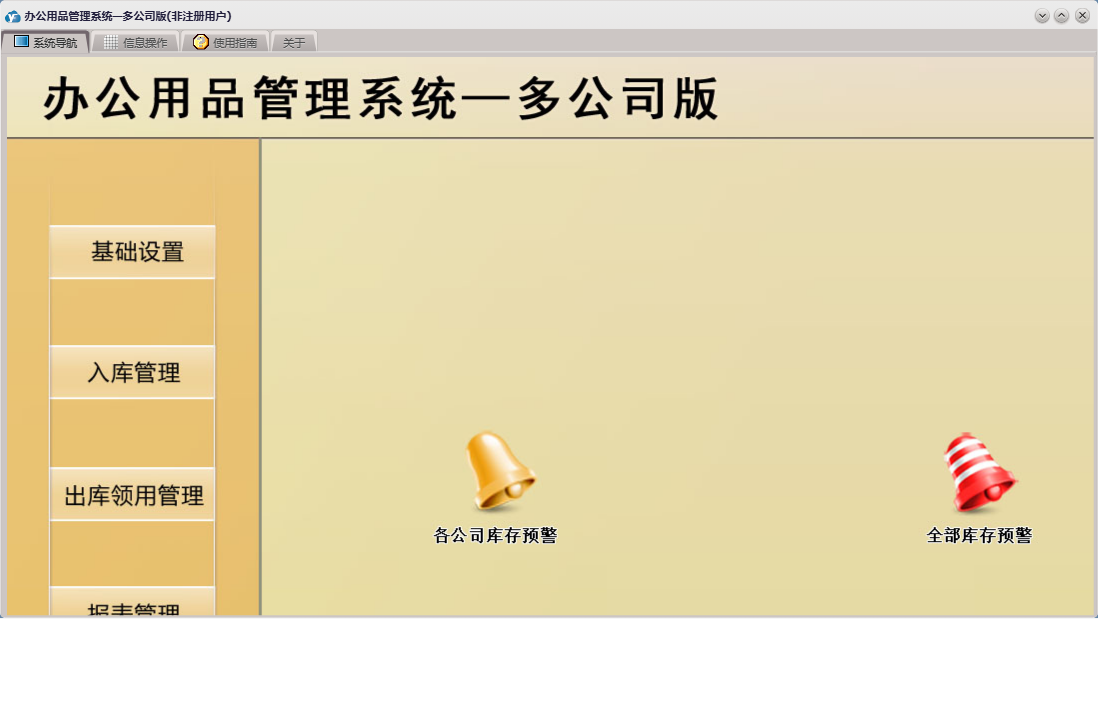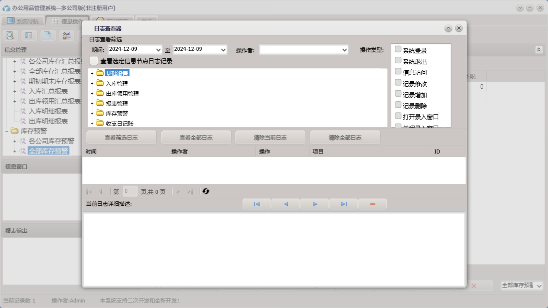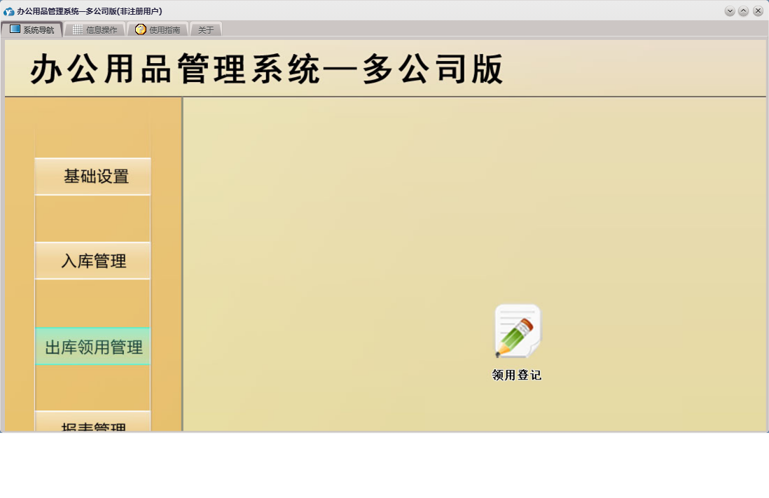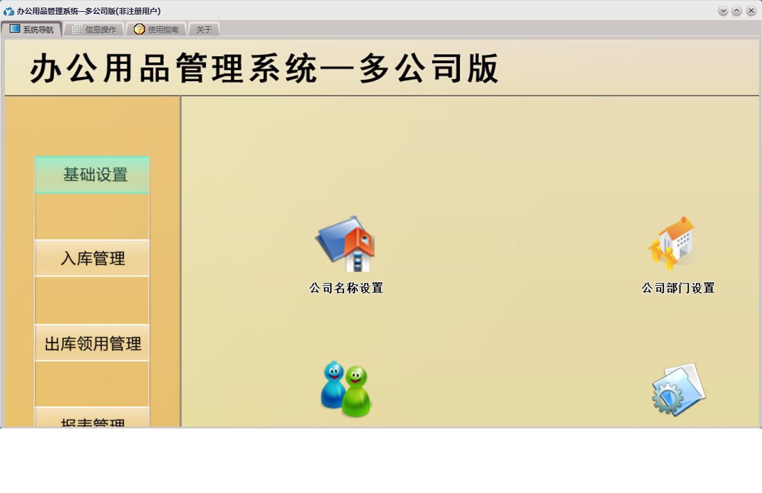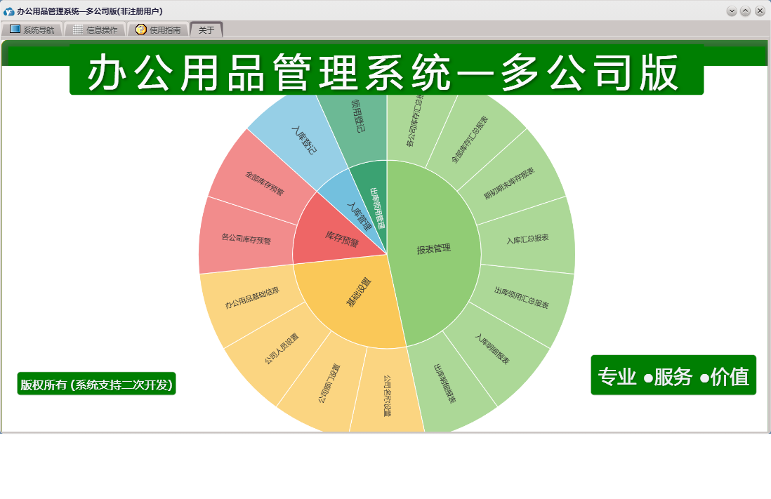 办公用品管理系统—多公司版包含以下功能:入库管理、基础设置、领用登记、库存预警、公司名称设置、入库登记、日志、办公用品基础信息、关于、公司人员设置、权限设置、报表管理、出库领用管理、公司部门设置等