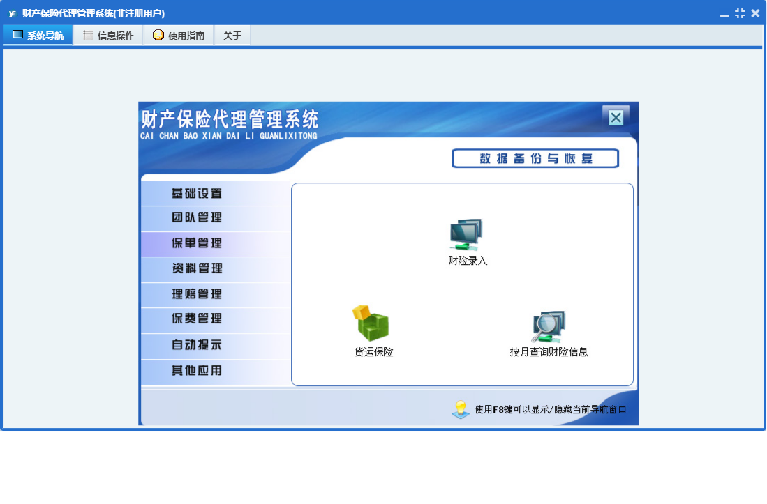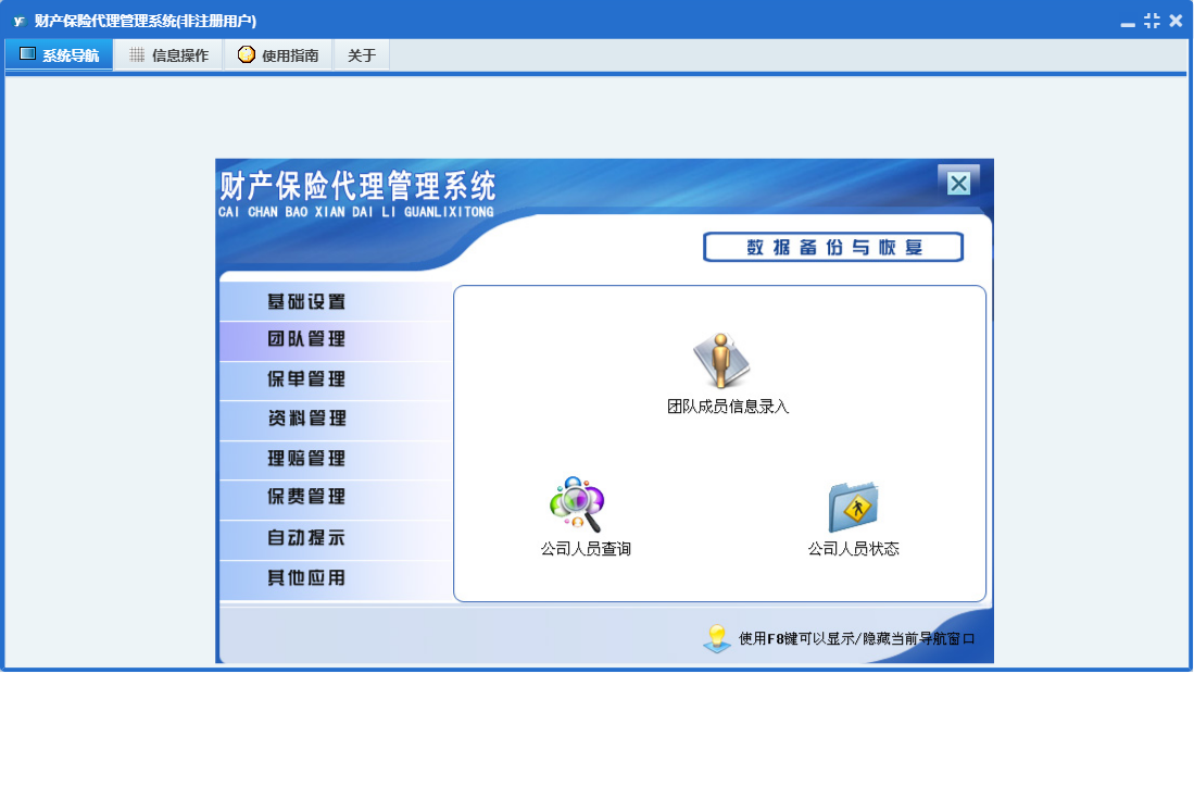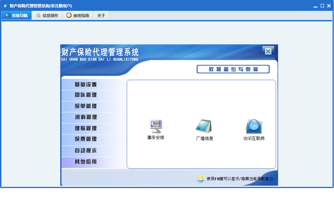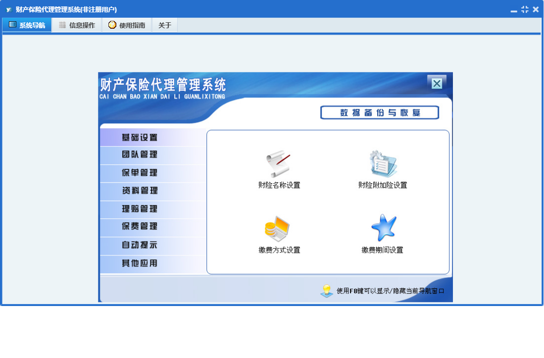 财产保险代理管理系统包含以下功能:财险录入、基础设置、团队成员信息录入、保费交纳、财险附加险、理赔录入、资料管理、财险名称、保单管理、保费管理、其他应用、自动提示、权限设置、货运保险、关于、理赔管理、事务安排、事务提醒、信息阅读、广播信息、团队管理、日志等