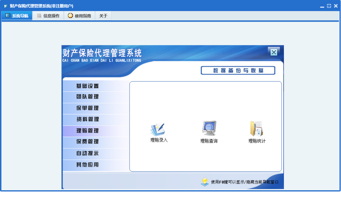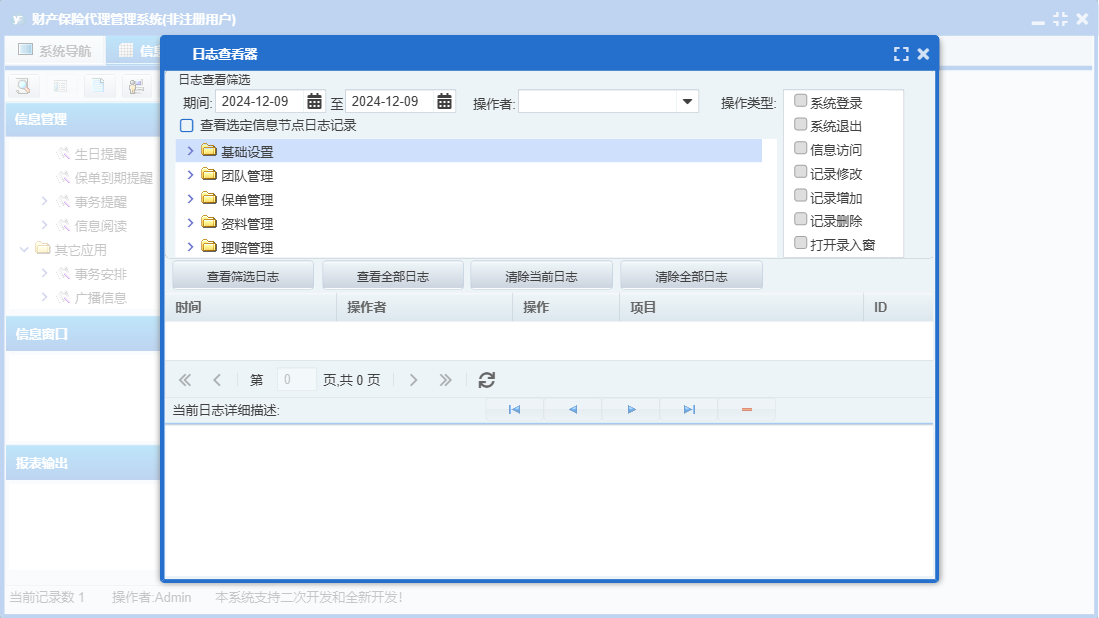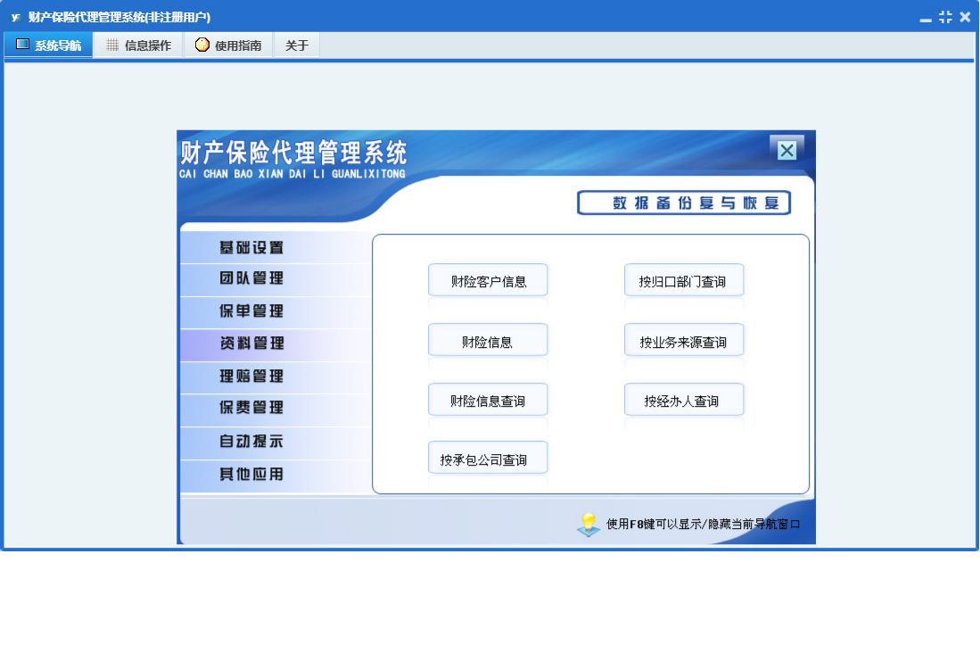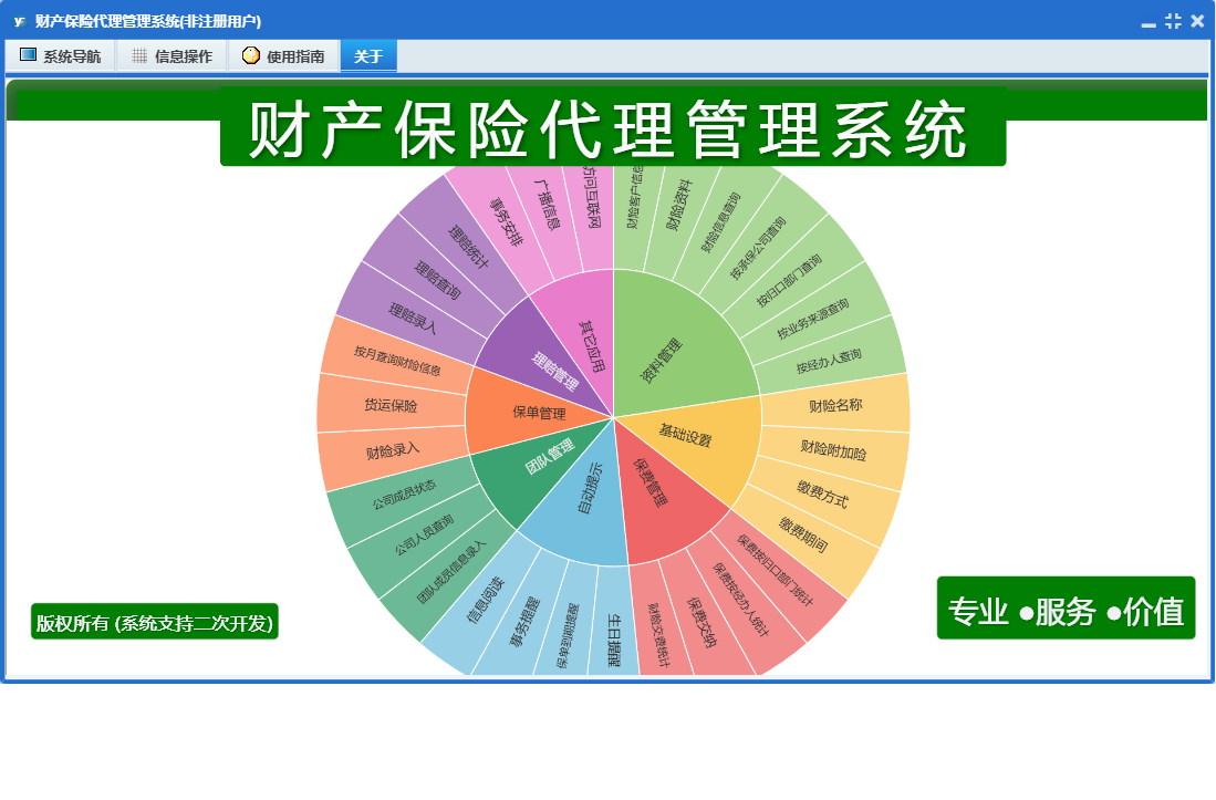 财产保险代理管理系统包含以下功能:财险录入、基础设置、团队成员信息录入、保费交纳、财险附加险、理赔录入、资料管理、财险名称、保单管理、保费管理、其他应用、自动提示、权限设置、货运保险、关于、理赔管理、事务安排、事务提醒、信息阅读、广播信息、团队管理、日志等