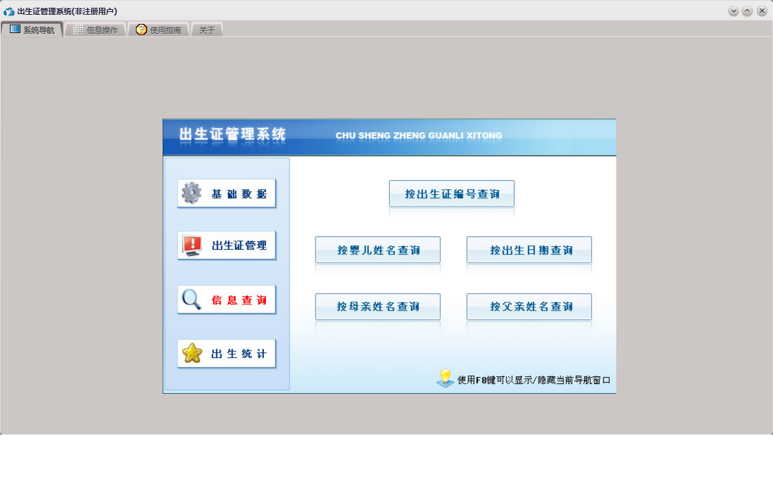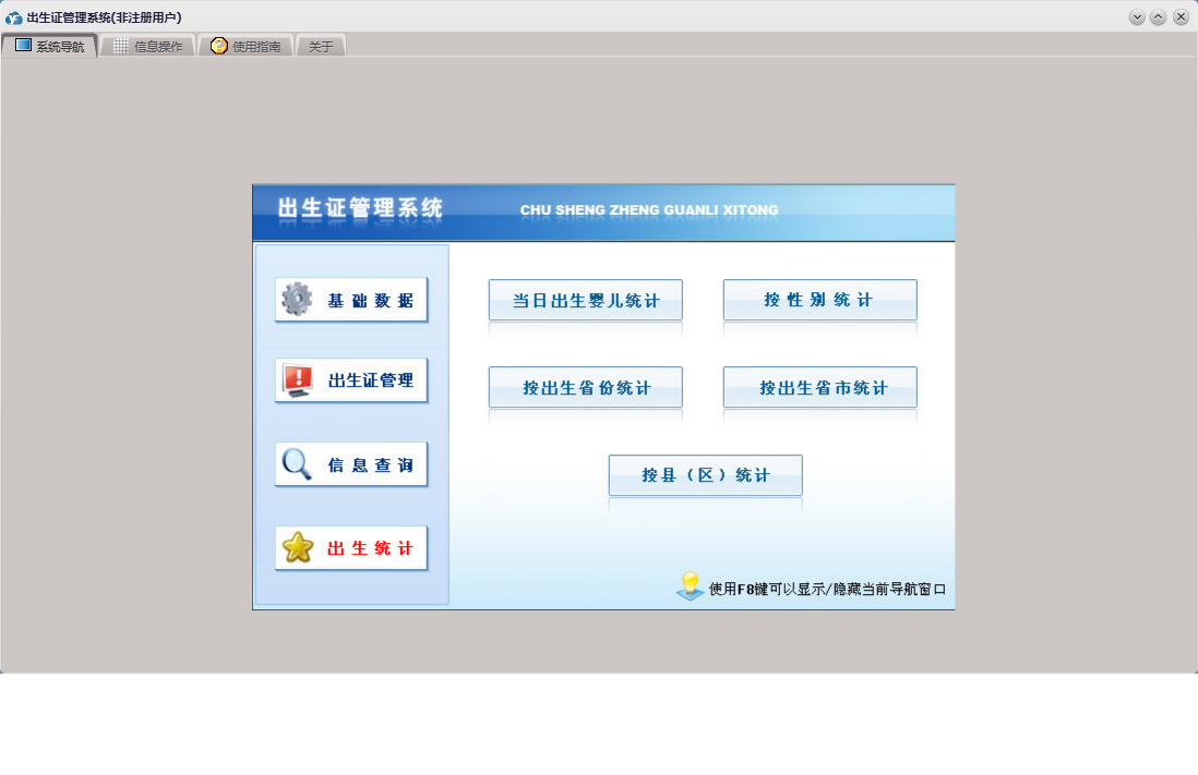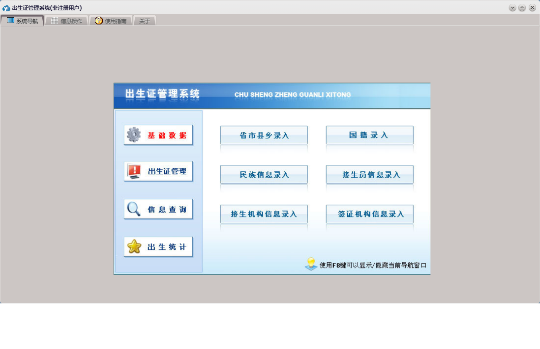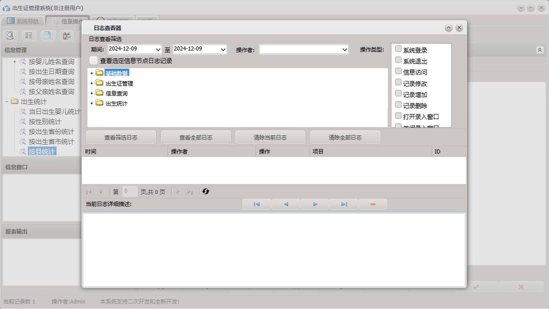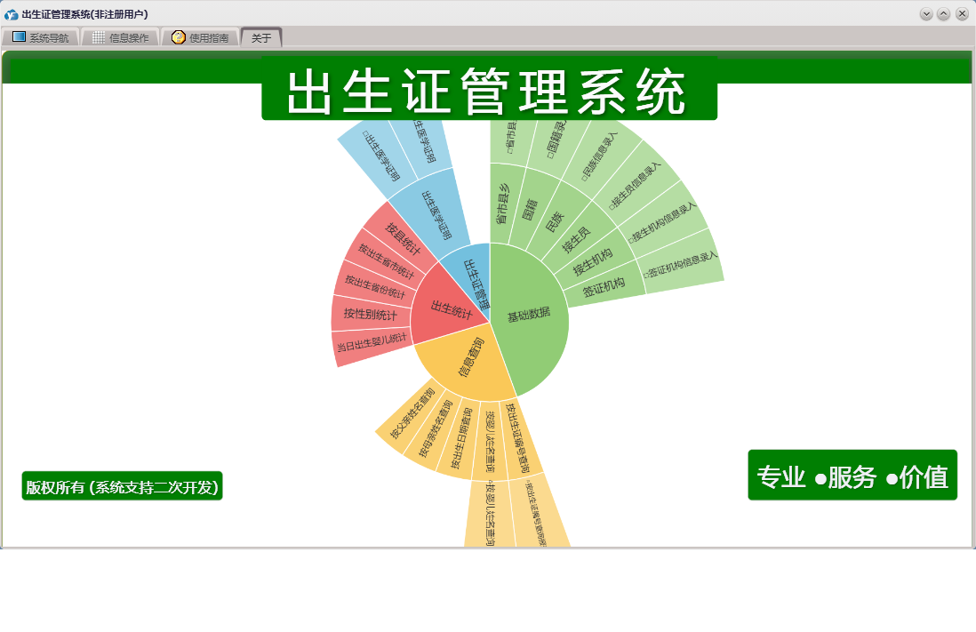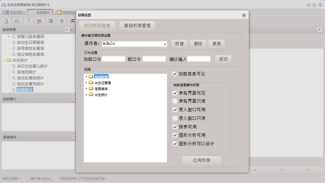 出生证管理系统包含以下功能:民族、基础数据、出生证管理、出生统计、国籍、省市县乡、日志、关于、权限设置、出生医学证明、信息查询、接生员、接生机构、签证机构等