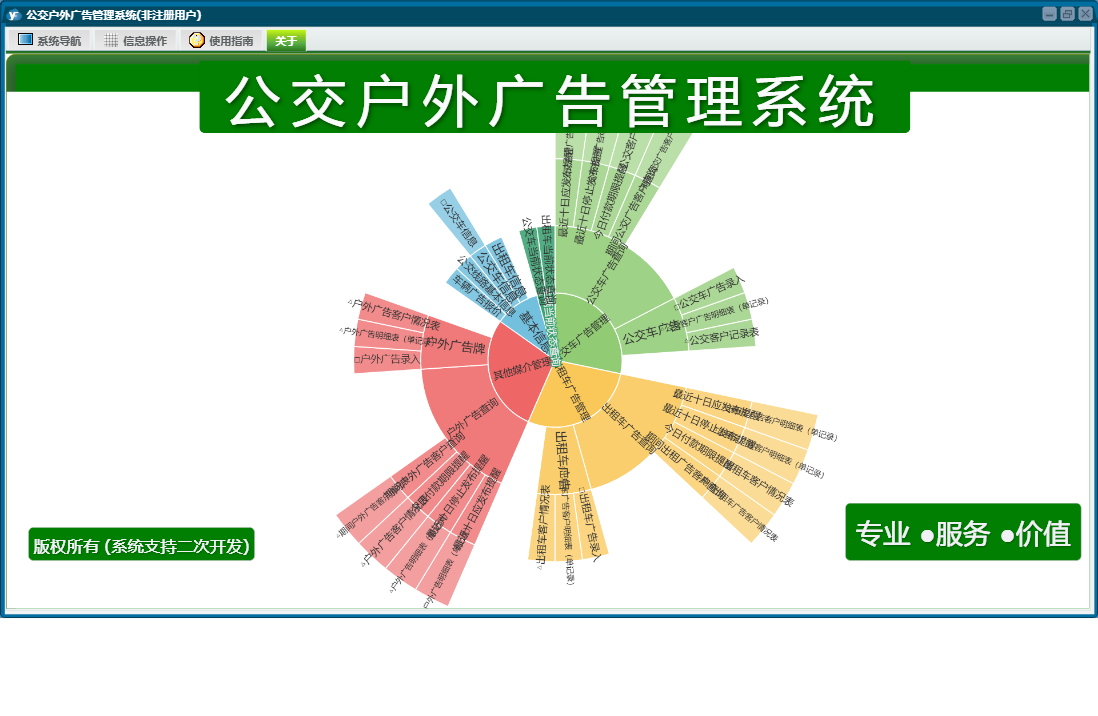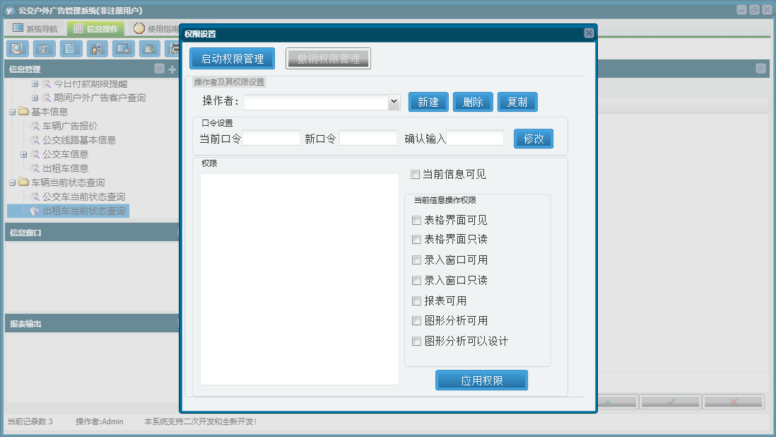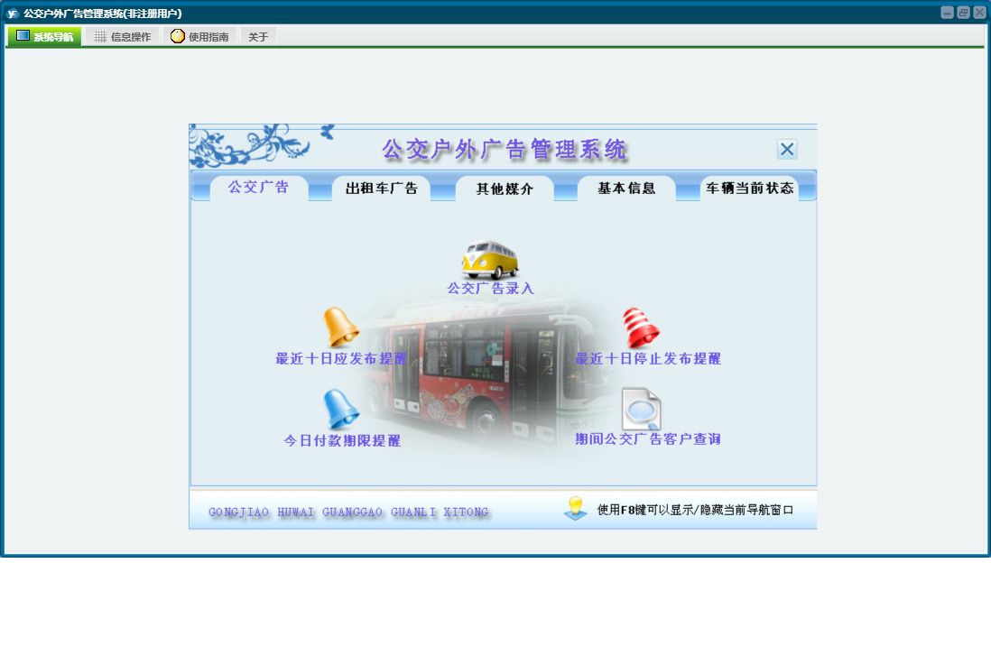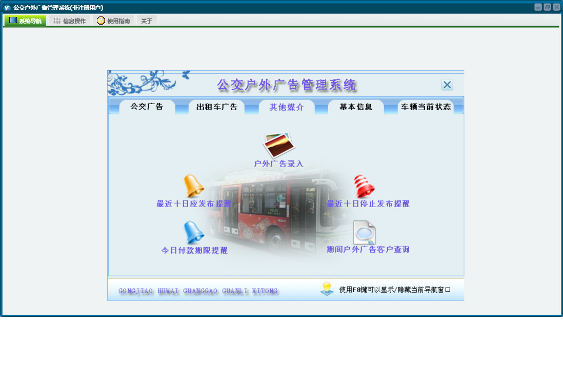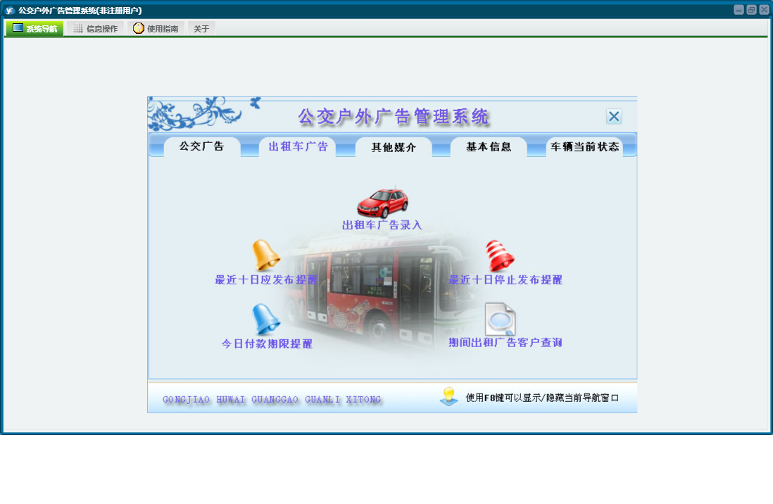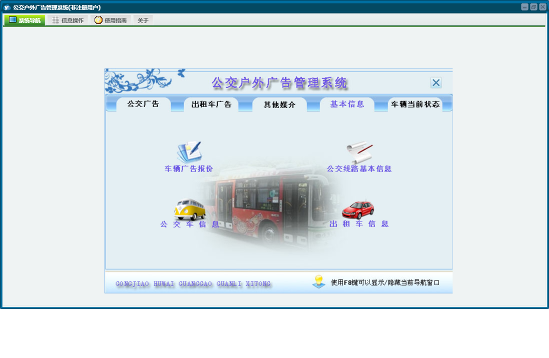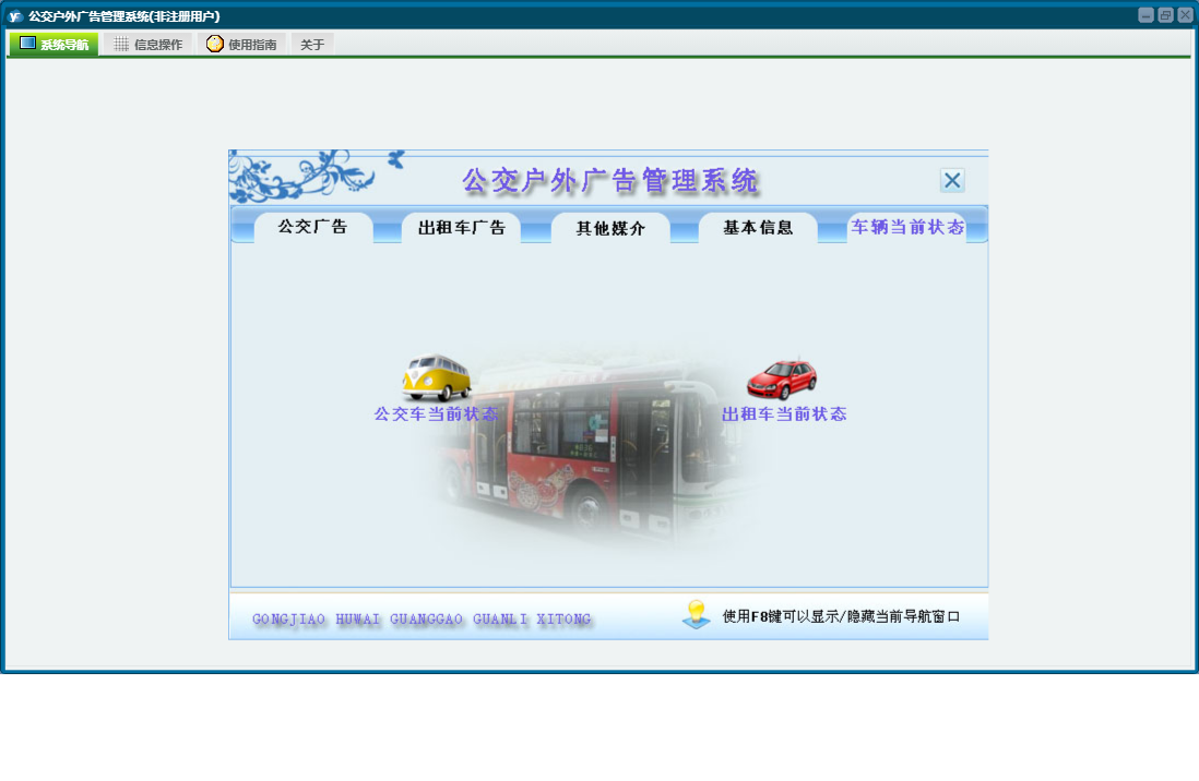 公交户外广告管理系统包含以下功能:公交车广告、户外广告牌、车辆当前状态查询、公交广告管理、其他媒介管理、日志、公交车信息、出租车广告管理、关于、权限设置、基本信息、出租车广告等