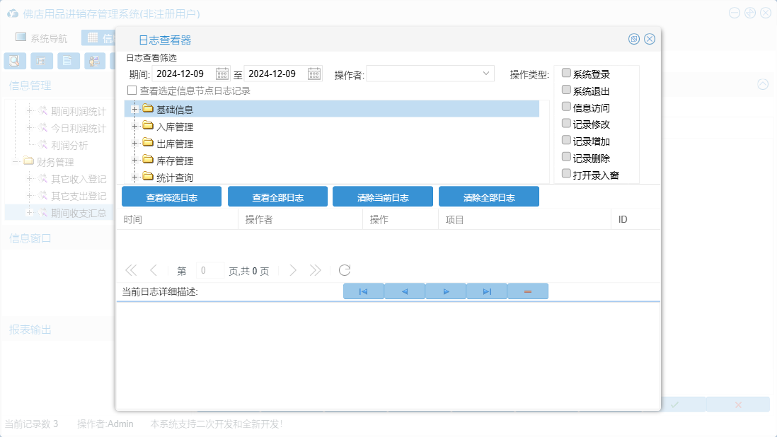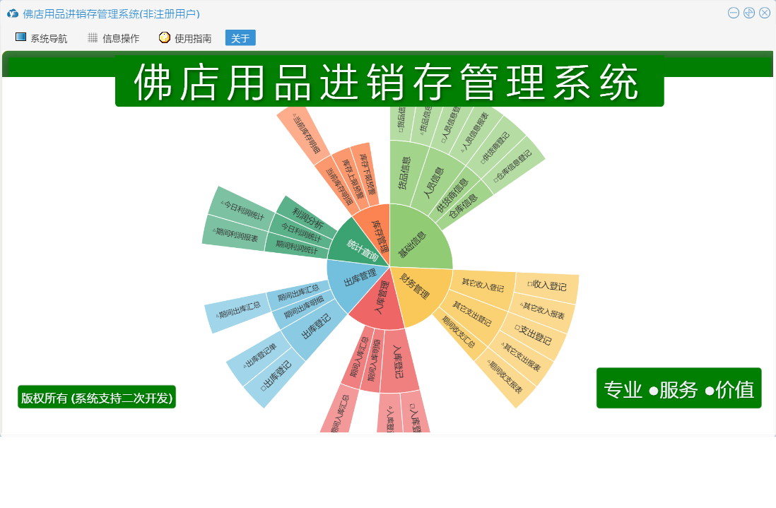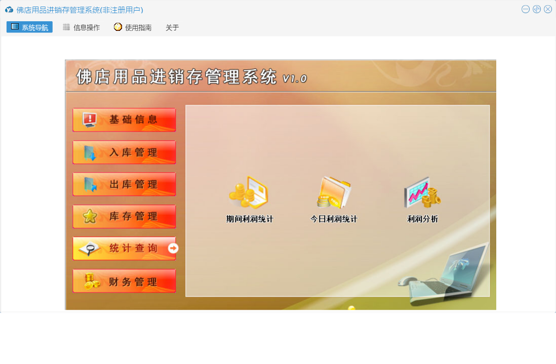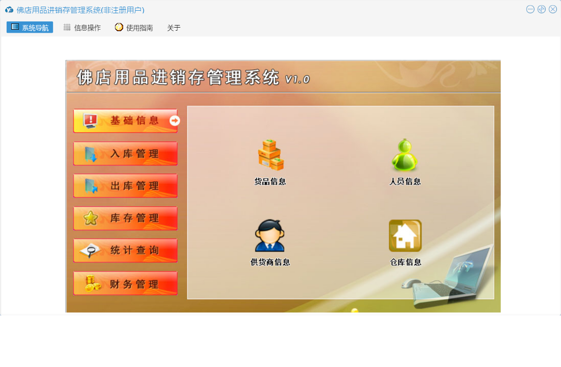 佛店用品进销存管理系统包含以下功能:出库管理、入库管理、基础信息、货品信息、入库登记、供货商信息、出库登记、其它收入登记、日志、其它支出登记、库存管理、关于、权限设置、统计查询、财务管理、仓库信息、人员信息等