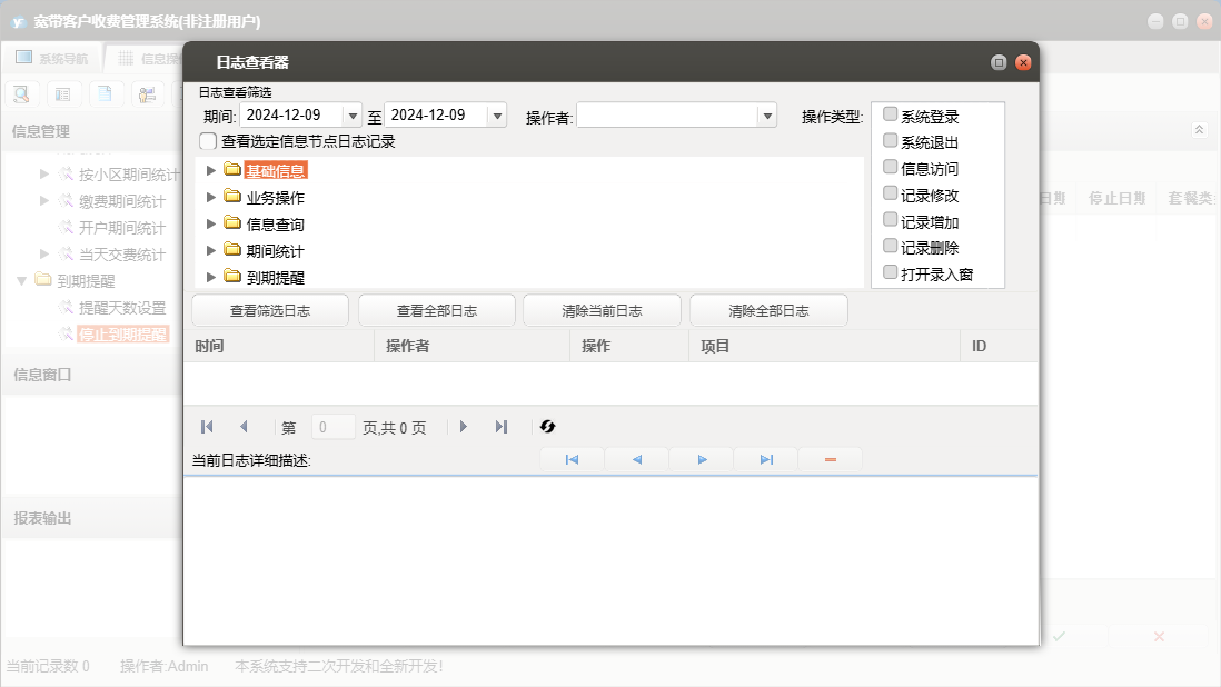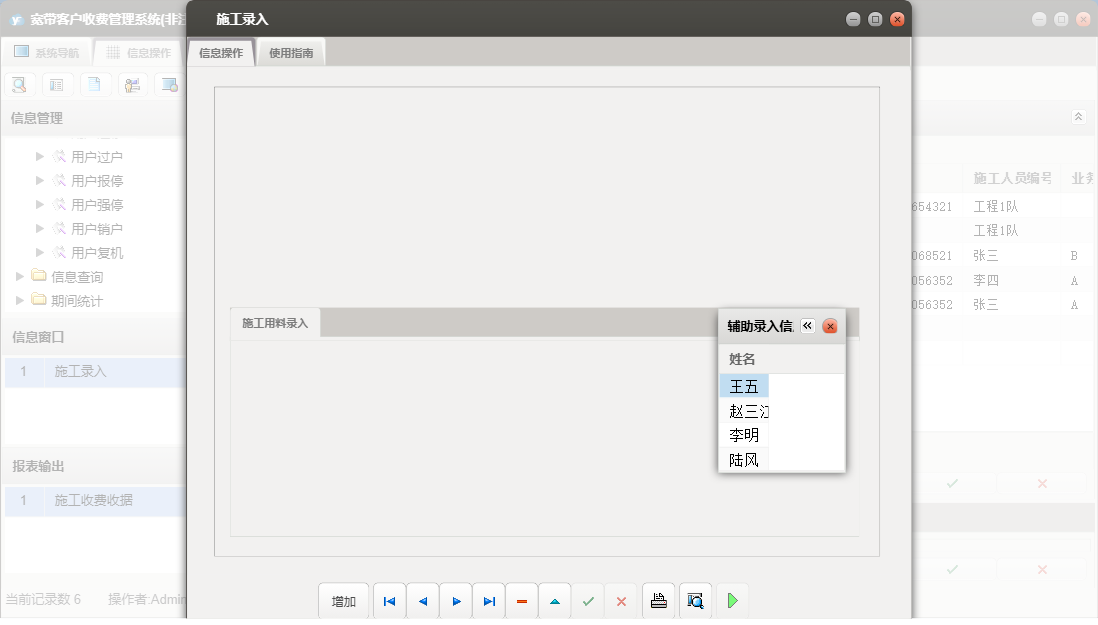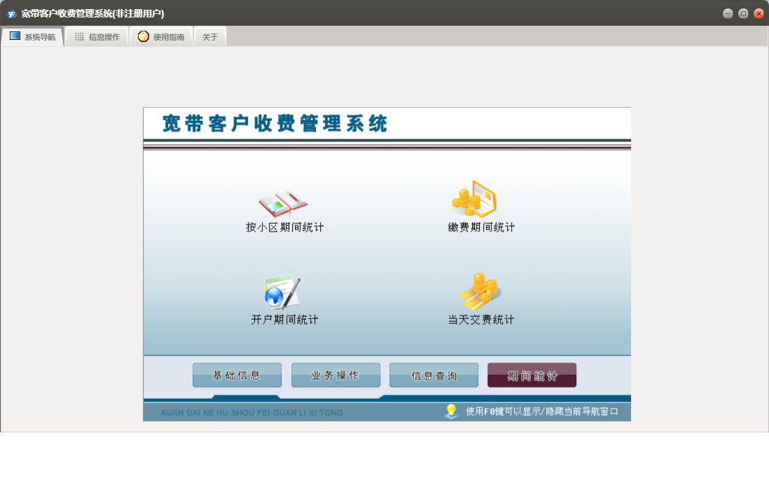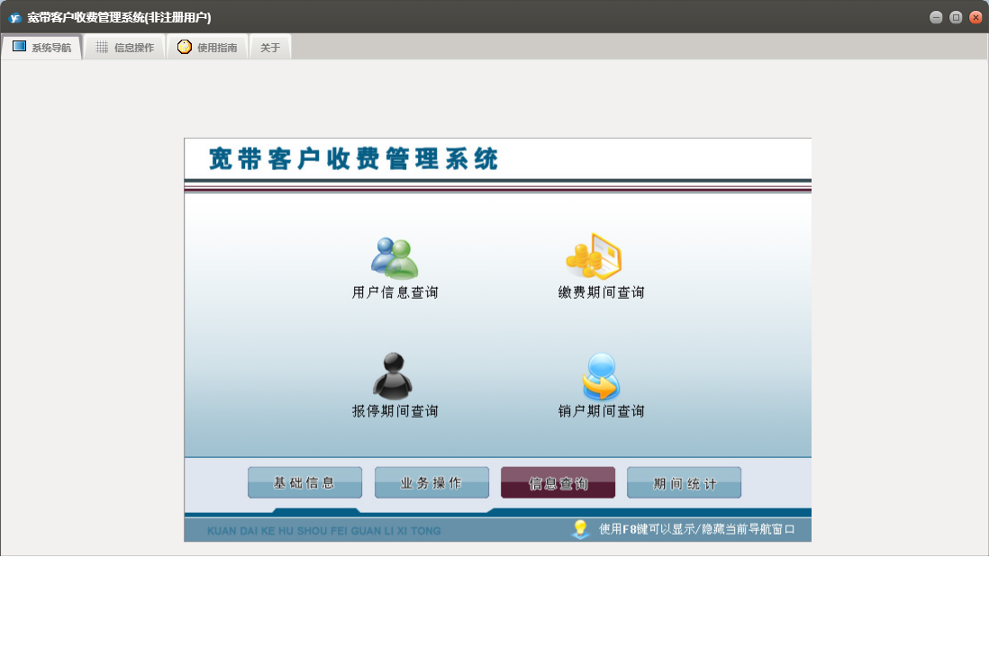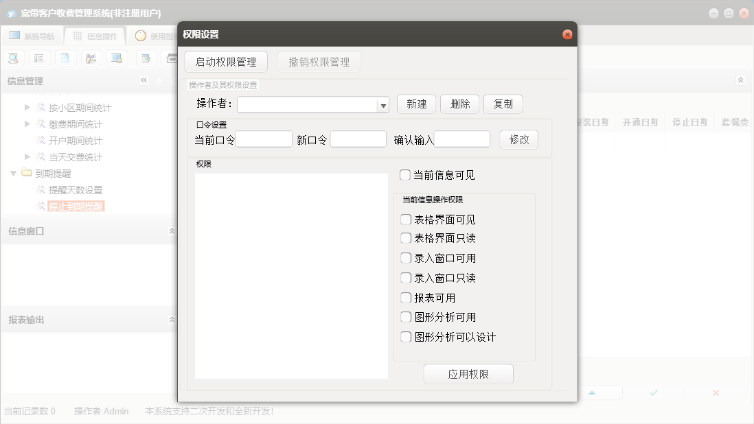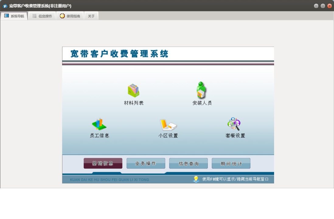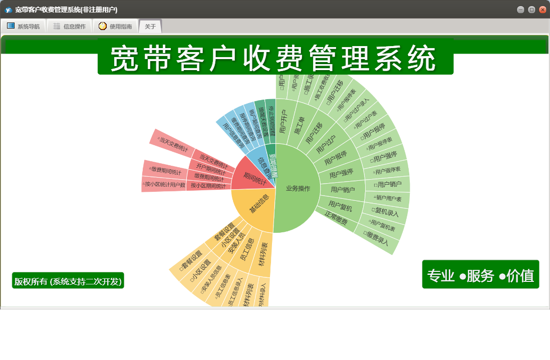 宽带客户收费管理系统包含以下功能:用户过户、用户复机、用户报停、安装人员、正常缴费、用户开户、用户强停、业务操作、用户销户、权限设置、用户迁移、信息查询、材料列表、小区设置、套餐设置、关于、基础信息、期间统计、施工单、员工信息、日志等