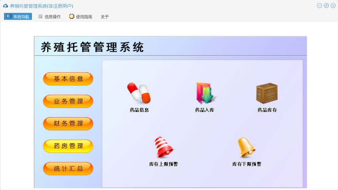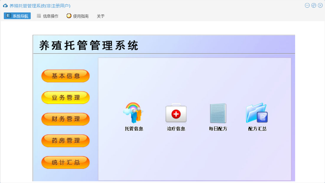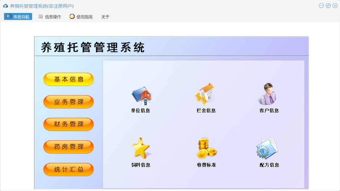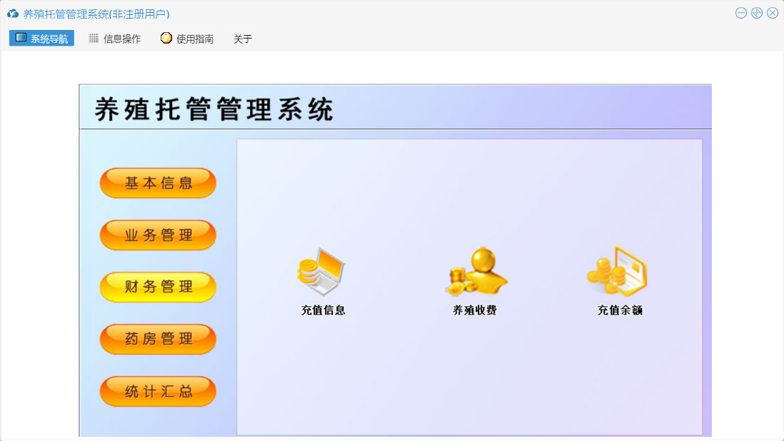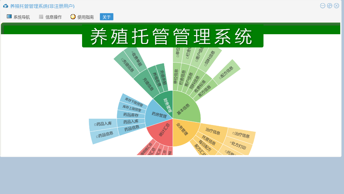 养殖托管管理系统包含以下功能:充值信息、单位信息、托管信息、栏舍信息、治疗信息、配方信息、关于、基本信息、客户信息、统计汇总、饲料信息、财务管理、药房管理、业务管理等