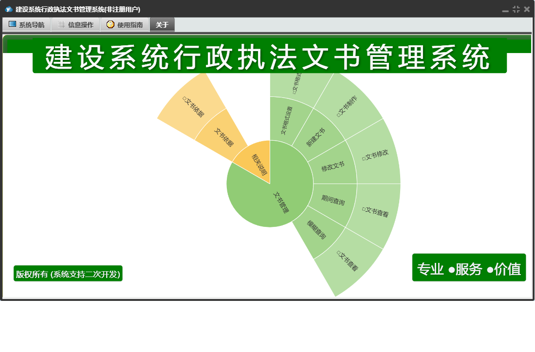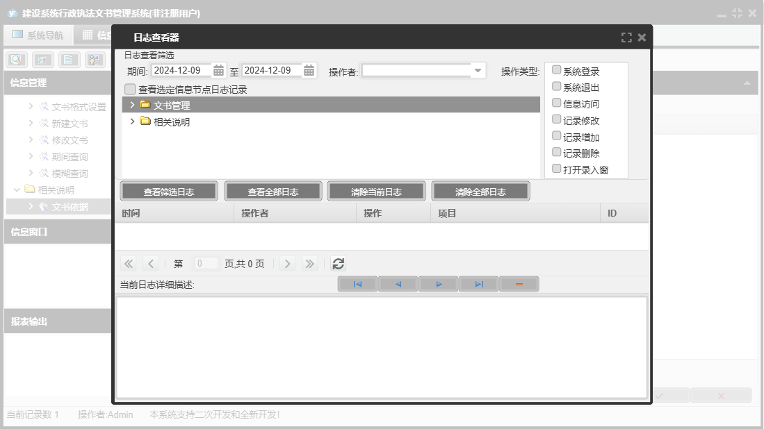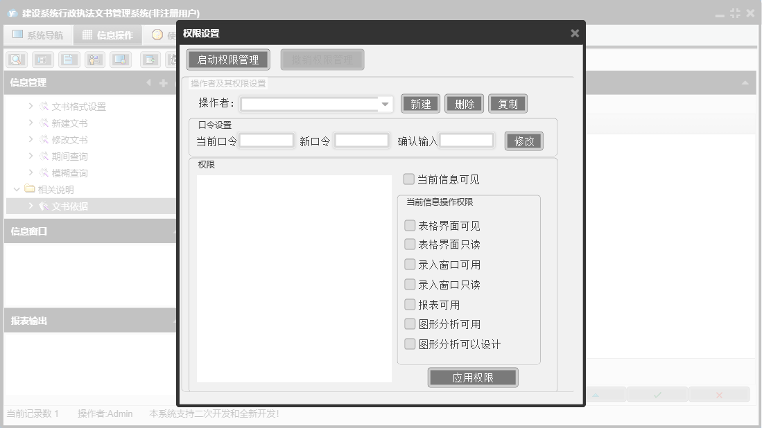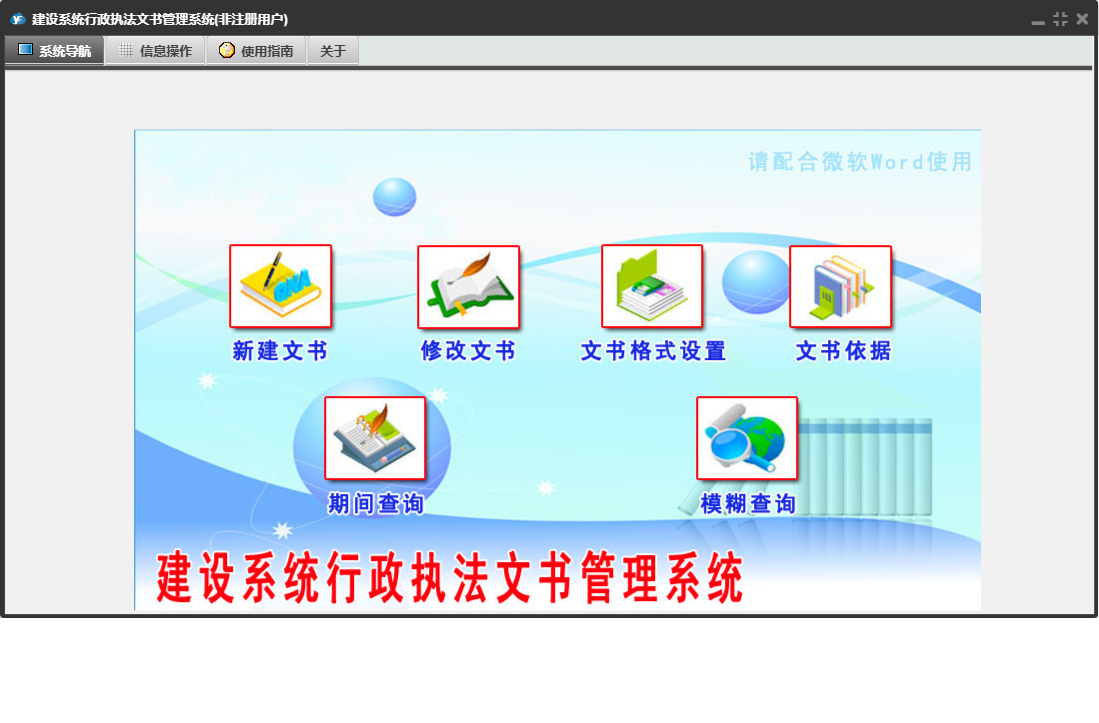 建设系统行政执法文书管理系统包含以下功能:模糊查询、文书格式设置、新建文书、文书管理、修改文书、日志、关于、权限设置、期间查询、文书依据等