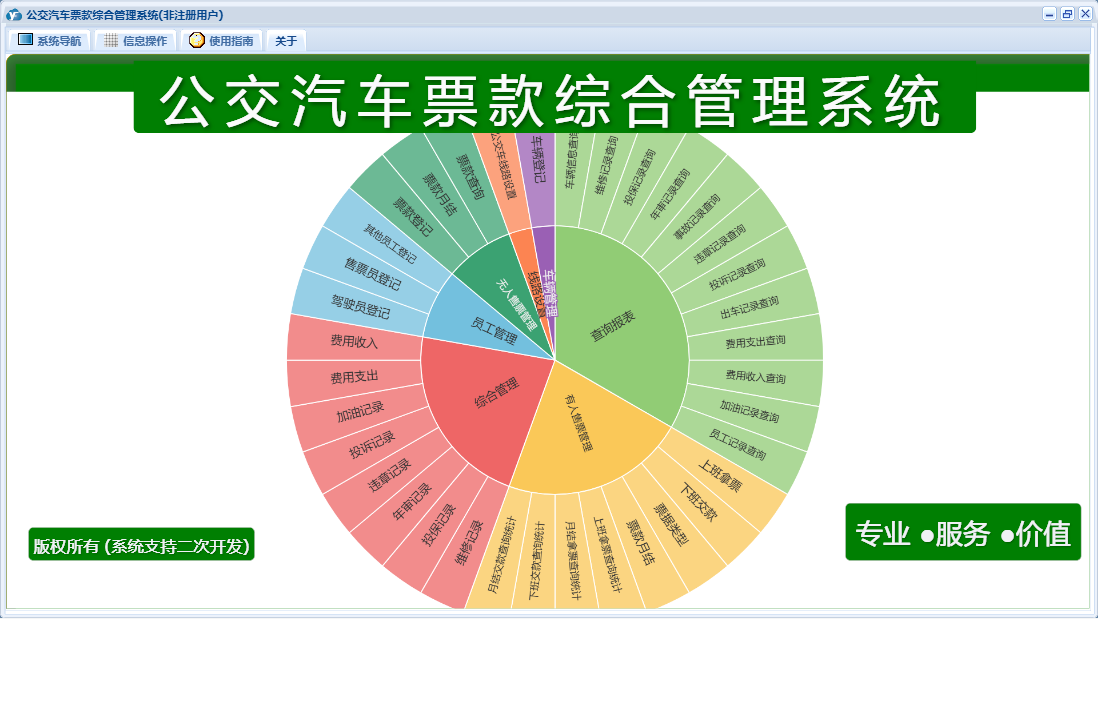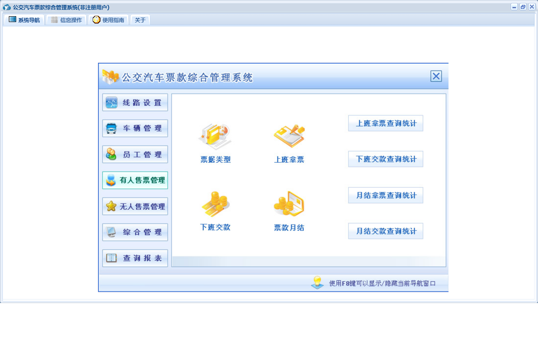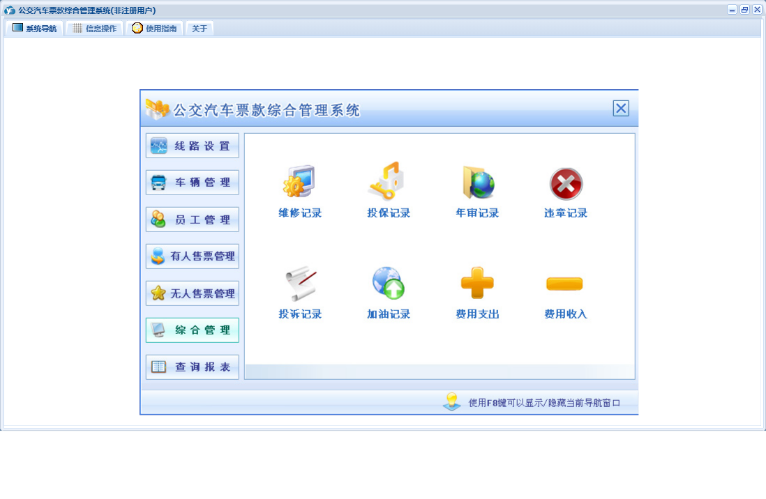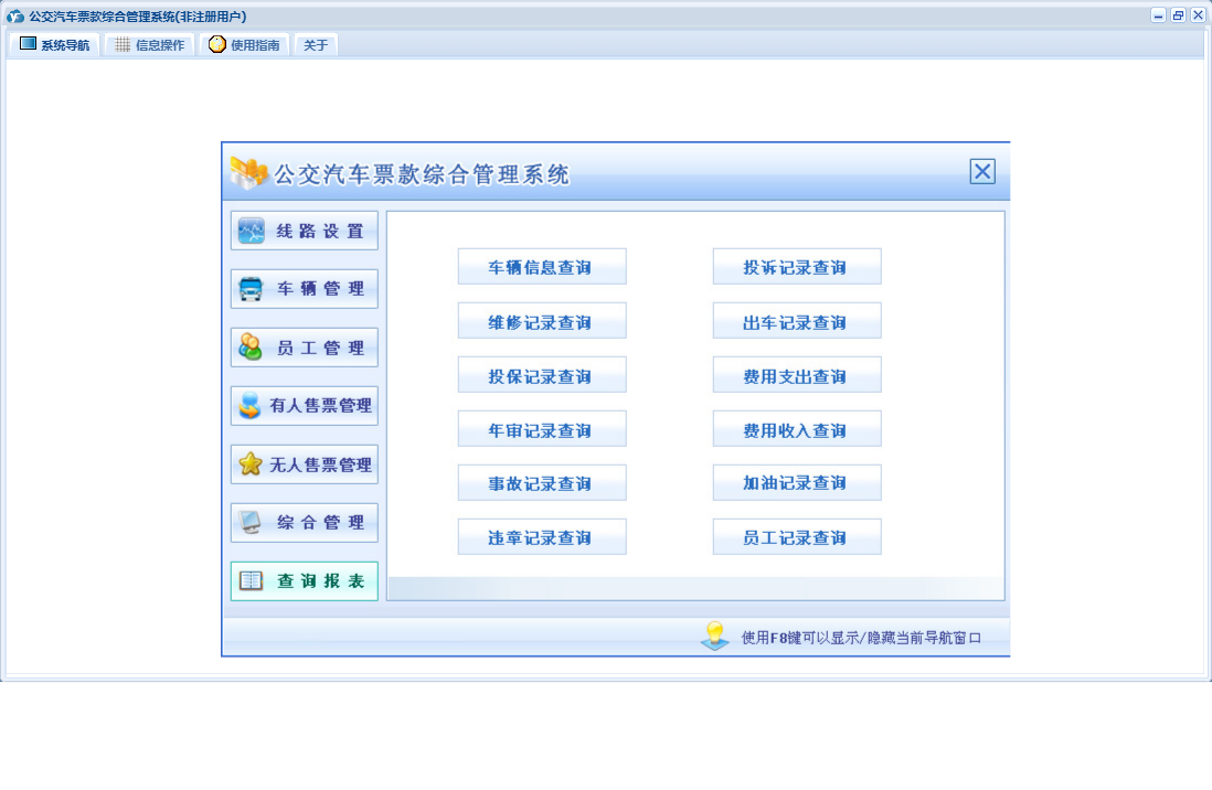 公交汽车票款综合管理系统包含以下功能:驾驶员登记、下班交款、违章记录、票据类型、票款登记、投保记录、车辆管理、年审记录、投诉记录、无人售票管理、费用收入、权限设置、维修记录、有人售票管理、售票员登记、线路设置、费用支出、查询、车辆登记、加油记录、关于、公交车线路设置、员工管理、综合管理、其他员工登记、上班拿票、日志等