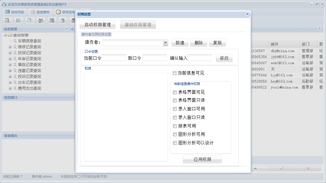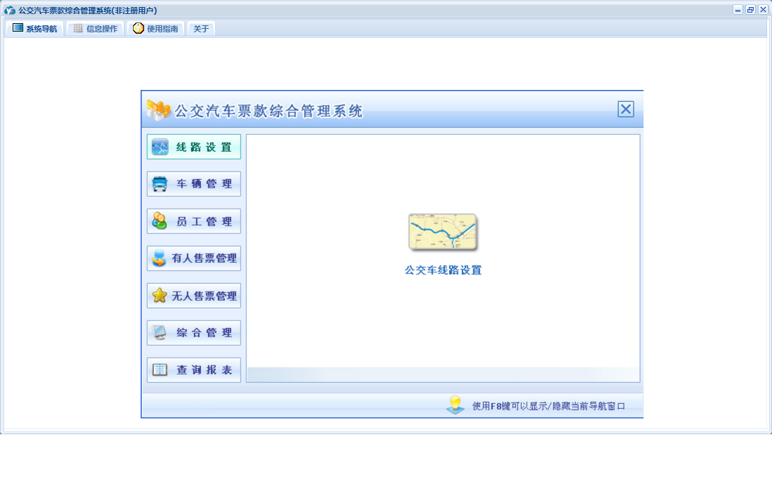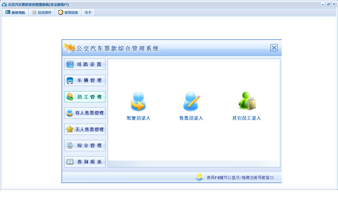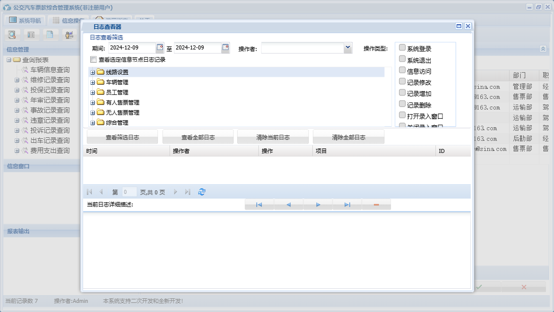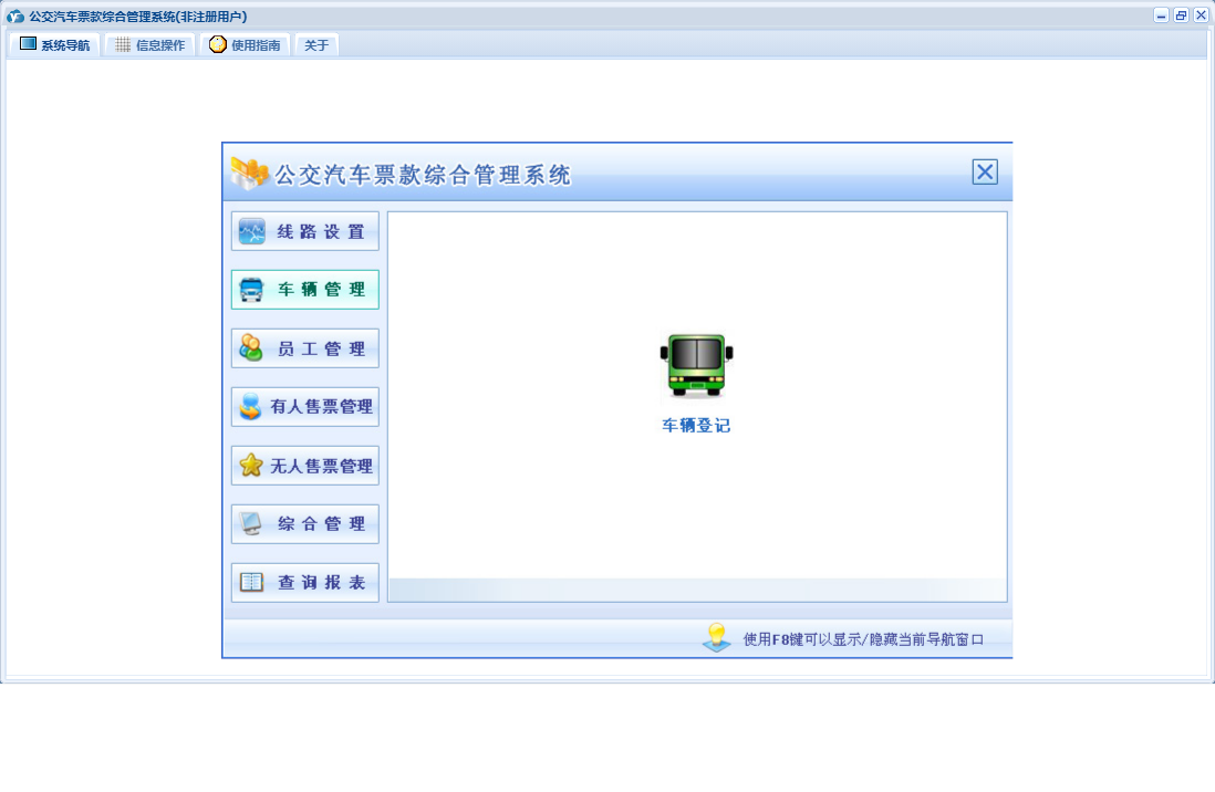 公交汽车票款综合管理系统包含以下功能:驾驶员登记、下班交款、违章记录、票据类型、票款登记、投保记录、车辆管理、年审记录、投诉记录、无人售票管理、费用收入、权限设置、维修记录、有人售票管理、售票员登记、线路设置、费用支出、查询、车辆登记、加油记录、关于、公交车线路设置、员工管理、综合管理、其他员工登记、上班拿票、日志等