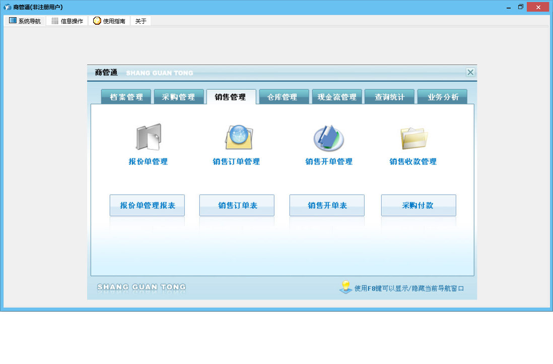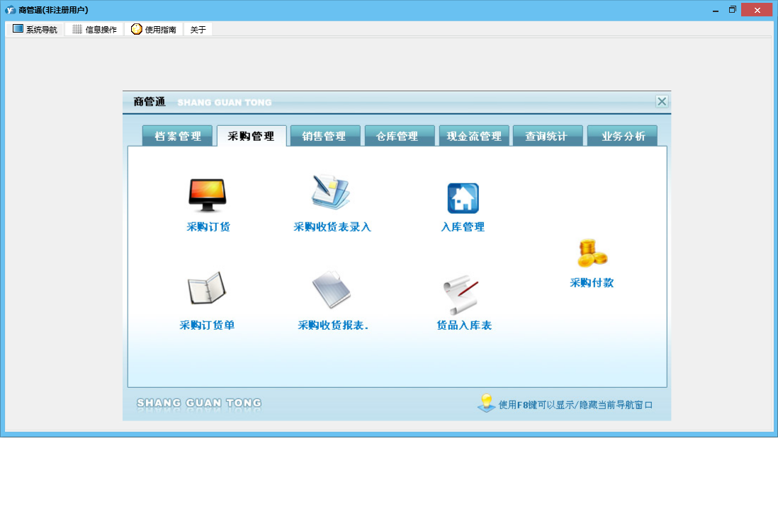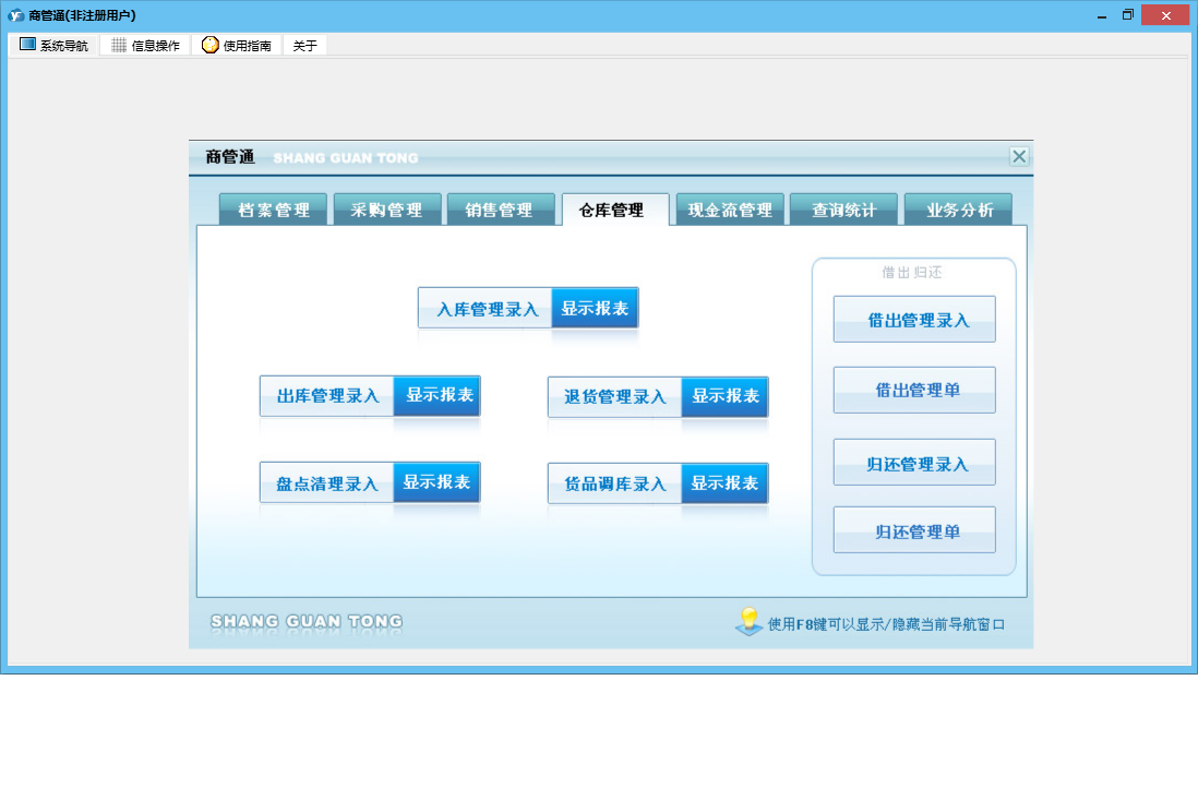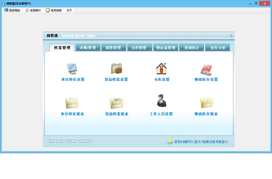 商管通包含以下功能:货品调库、销售管理、查询统计、采购付款、销售开单管理、货品档案设置、销售订单管理、档案管理、仓库设置、工作人员设置、业务分析、权限设置、期初库存设置、退库管理、供货付款、出库管理、来往单位设置、盘点清理、库存管理、销售收款管理、关于、销售收款、借出管理、采购订货、入库管理、归还管理、日志、采购管理、报价单管理、采购收货、现金流管理等