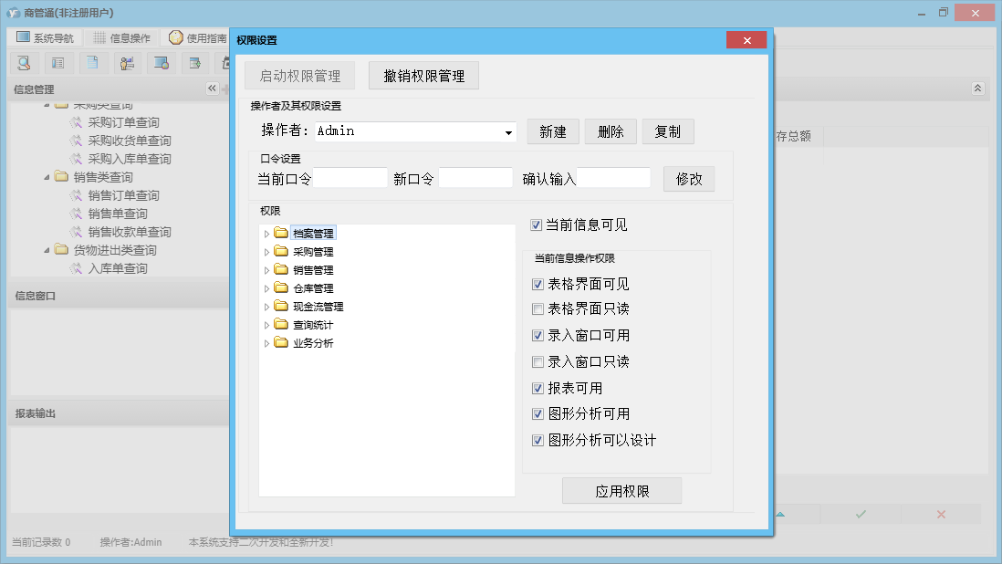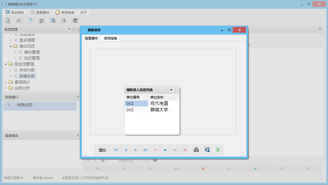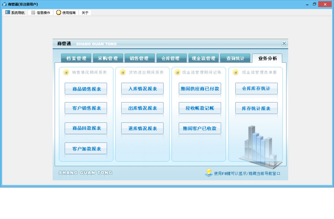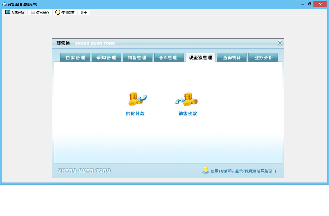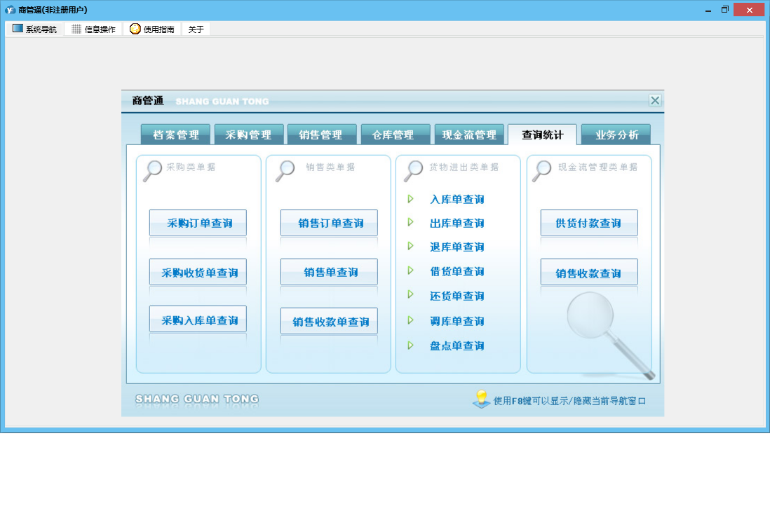 商管通包含以下功能:货品调库、销售管理、查询统计、采购付款、销售开单管理、货品档案设置、销售订单管理、档案管理、仓库设置、工作人员设置、业务分析、权限设置、期初库存设置、退库管理、供货付款、出库管理、来往单位设置、盘点清理、库存管理、销售收款管理、关于、销售收款、借出管理、采购订货、入库管理、归还管理、日志、采购管理、报价单管理、采购收货、现金流管理等