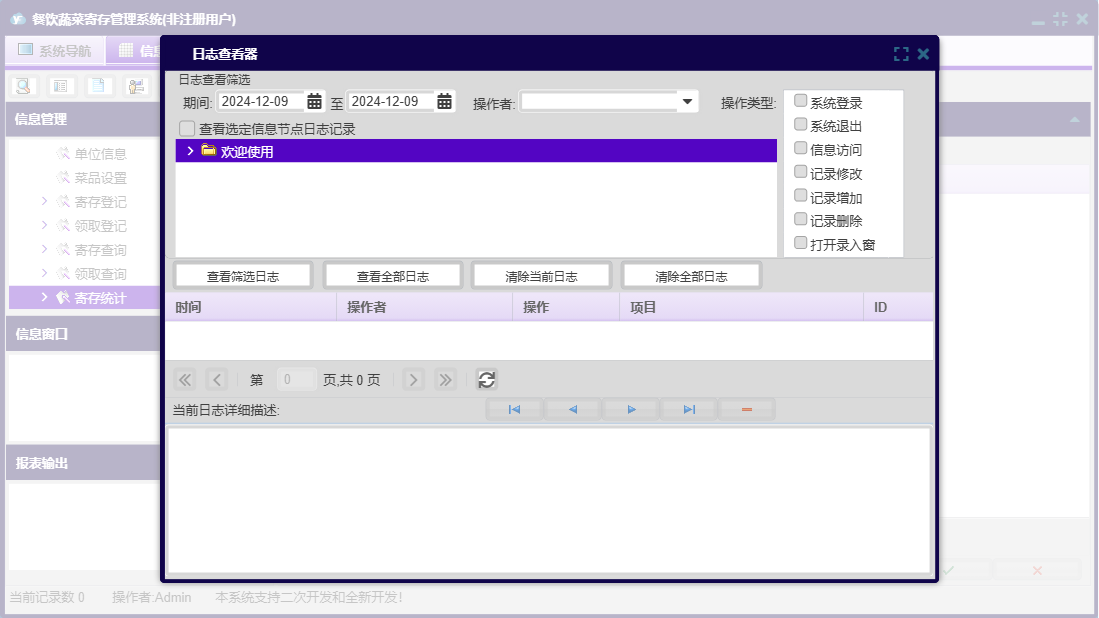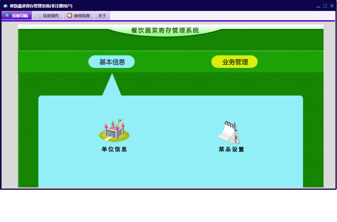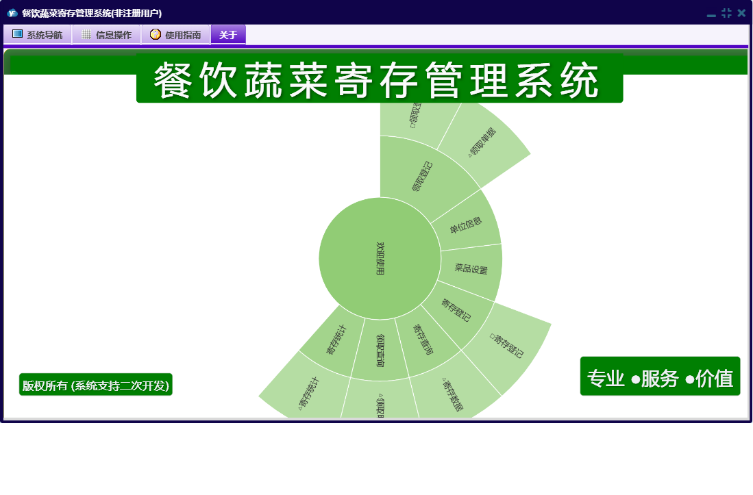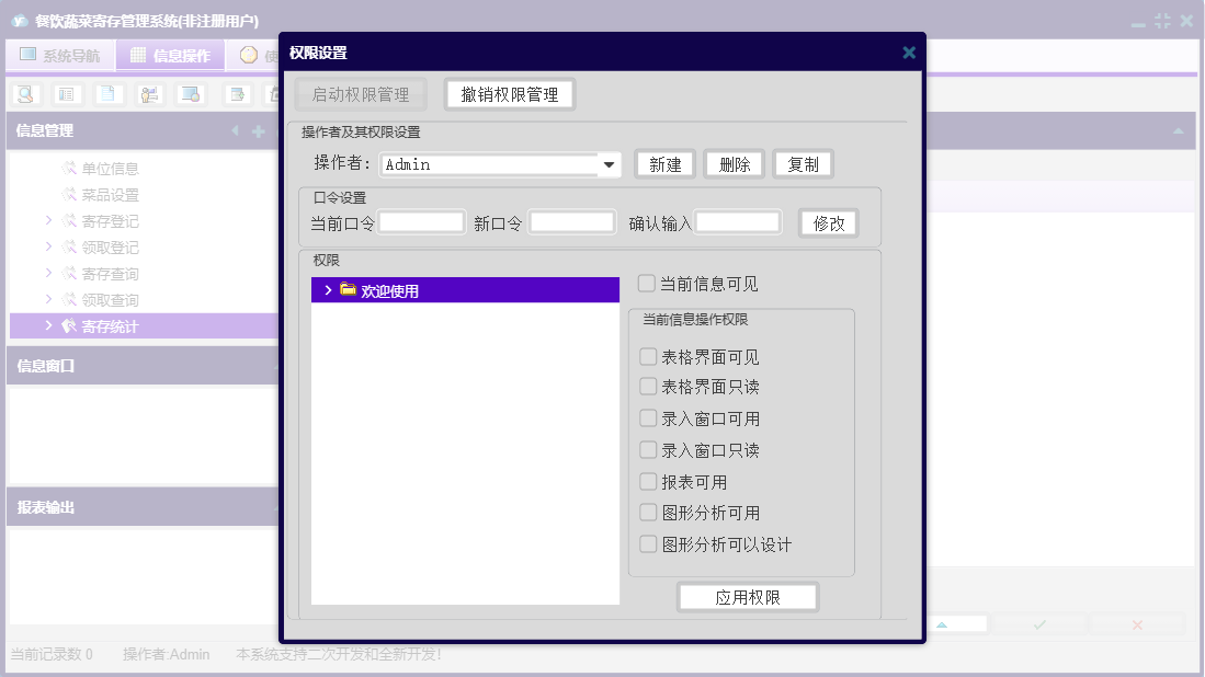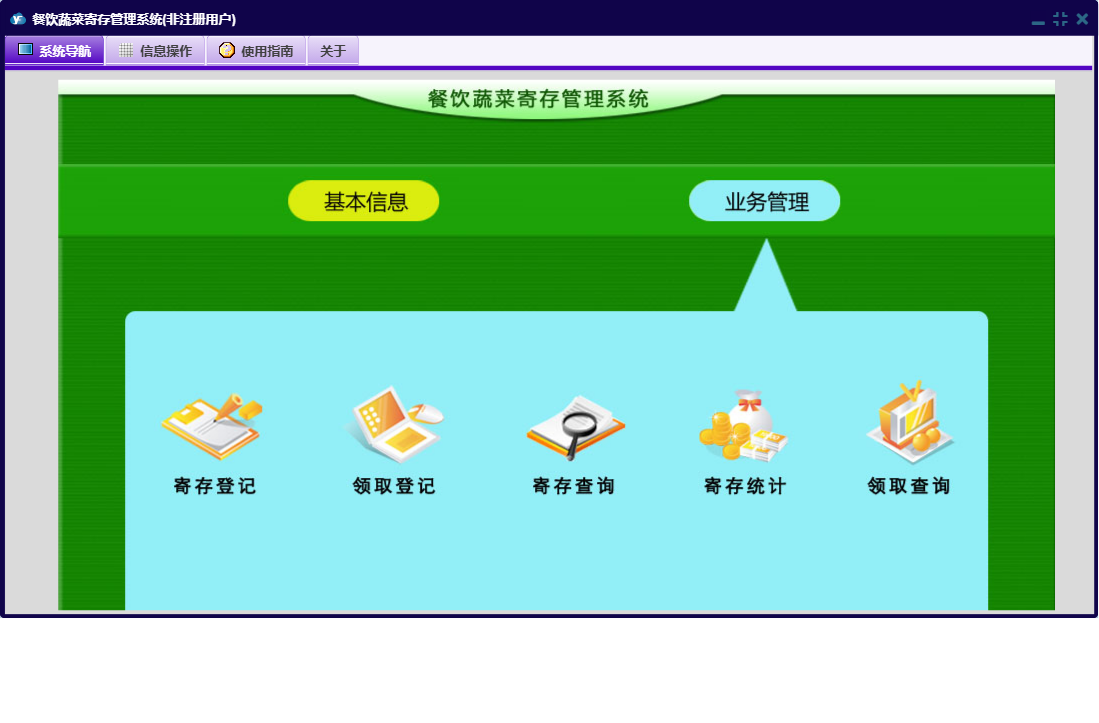 餐饮蔬菜寄存管理系统包含以下功能:领取登记、日志、关于、权限设置、基本信息、业务管理等